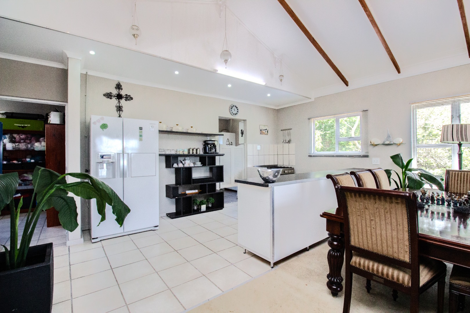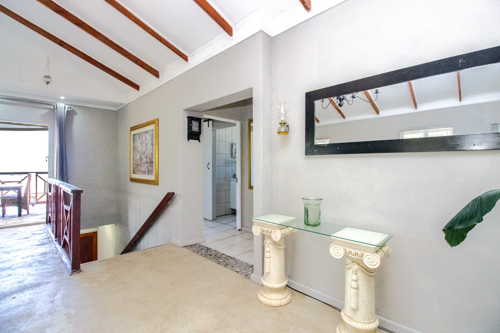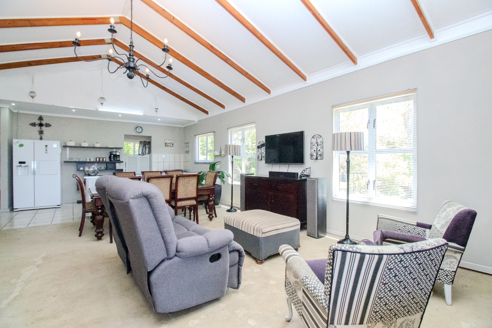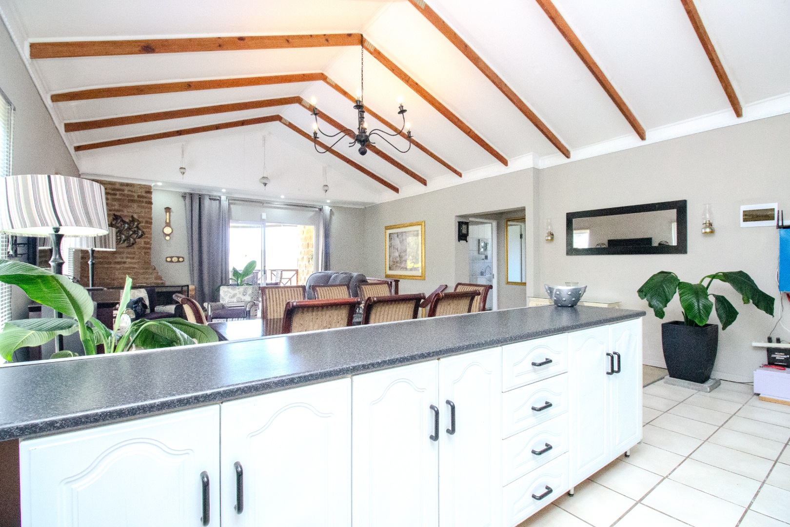 This inviting 4-bedroom, 3-bathroom residence in Groenvallei, Sedgefield, offers a spacious and comfortable living experience. The property presents a durable stone and brick exterior, complemented by a concrete driveway and a mature tree enhancing its curb appeal. A private balcony adds an appealing architectural detail to the facade. Step inside to discover an expansive open-plan living, dining, and kitchen area, characterized by striking vaulted ceilings with exposed wooden beams that create an airy and bright atmosphere. Large windows and sliding glass doors ensure ample natural light throughout the main living spaces, which also feature a cozy fireplace. The functional kitchen seamlessly integrates with the dining area, perfect for entertaining. Additionally, the home includes a dedicated family TV room and a study, providing versatile spaces for relaxation and work. The four well-proportioned bedrooms and three bathrooms, including one ensuite, offer comfortable accommodation for families. Outdoor living is a highlight, with a covered patio featuring a built-in braai, ideal for enjoying the scenic views. The property boasts a well-maintained garden with an irrigation system and water tanks, ensuring lush surroundings. Practical amenities include a double garage, a laundry room, and ample storage. Security is enhanced by a fully fenced and totally walled perimeter with an access gate. The home also benefits from a battery inverter, providing essential backup power. Groenvallei is a desirable suburban area in Sedgefield, known for its coastal beach proximity and tranquil environment. This location offers a blend of natural beauty and convenient living. Key Features: * 4 Bedrooms, 3 Bathrooms (1 En-suite) * Open-Plan Living, Dining & Kitchen * Vaulted Ceilings with Exposed Beams * Built-in Braai & Covered Patio * Double Garage * Study & Family TV Room * Scenic Views * Battery Inverter * Garden with Irrigation & Water Tanks