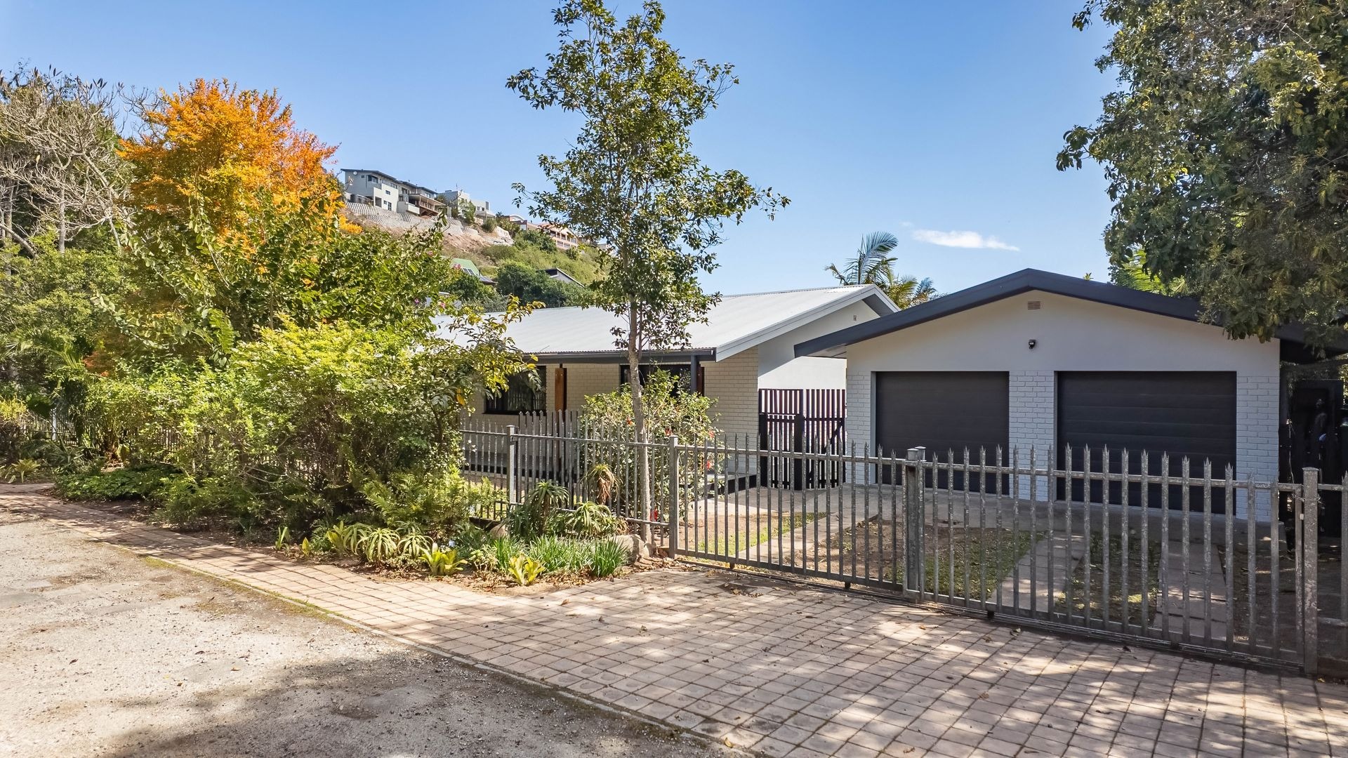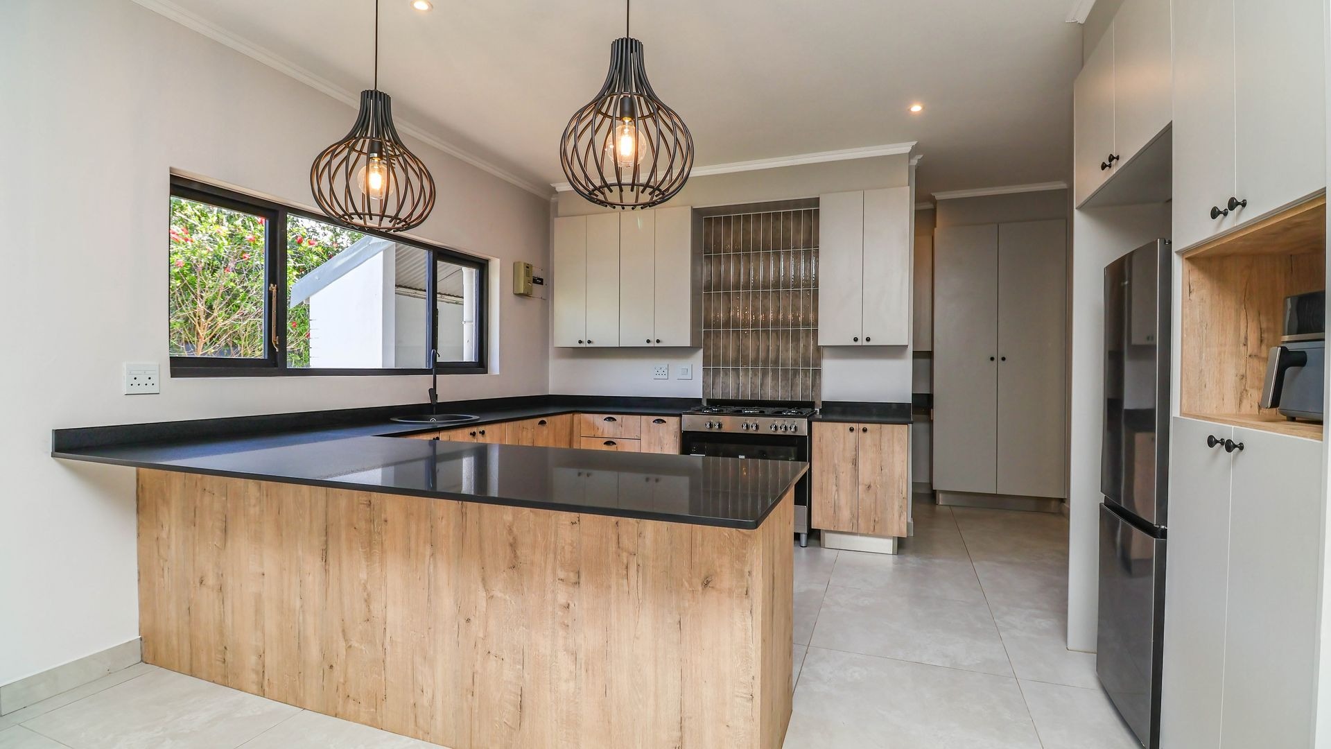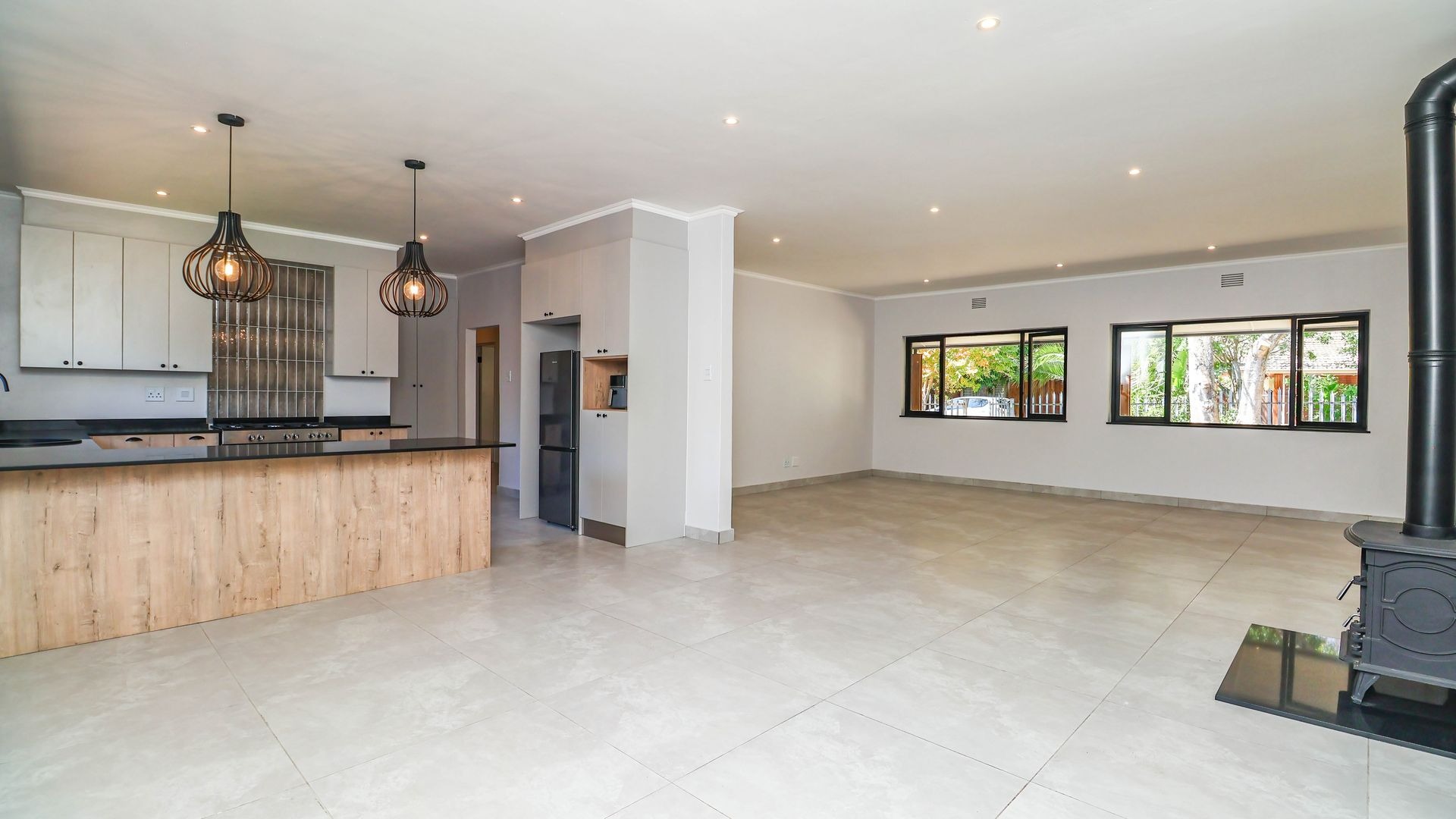 Modern Family Home in The Village, Sedgefield. Discover this contemporary family home in the charming suburb of The Village, Sedgefield. Boasting a generous 318 sqm of living space on an 848 sqm erven, the property combines modern aesthetics with warm wood finishes, creating a stylish and inviting atmosphere. The exterior features a crisp white-and-grey façade, a double garage, and a paved driveway with parking for up to four vehicles, all set amidst mature trees that provide privacy and natural beauty.