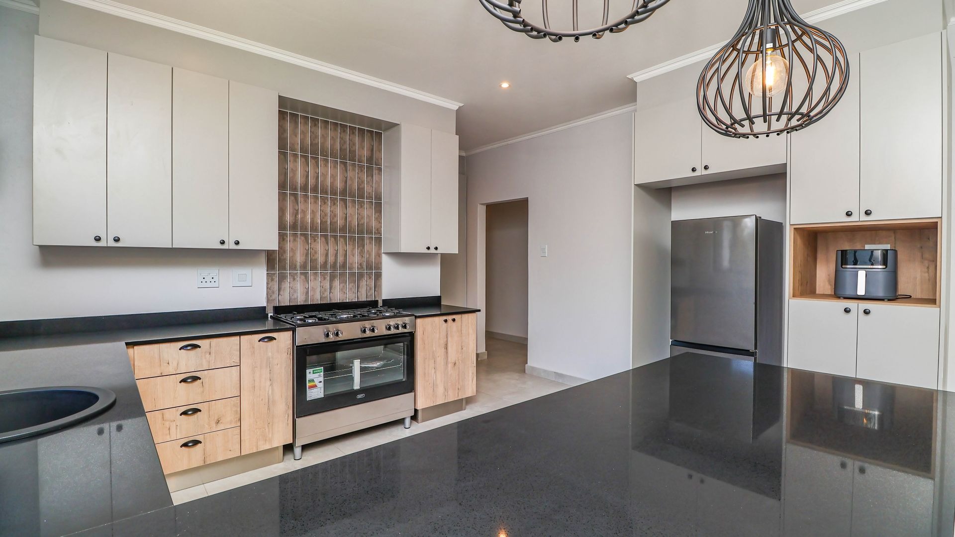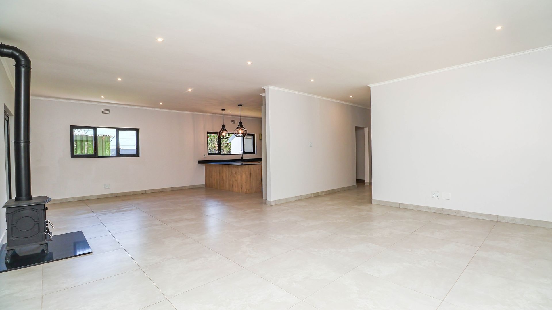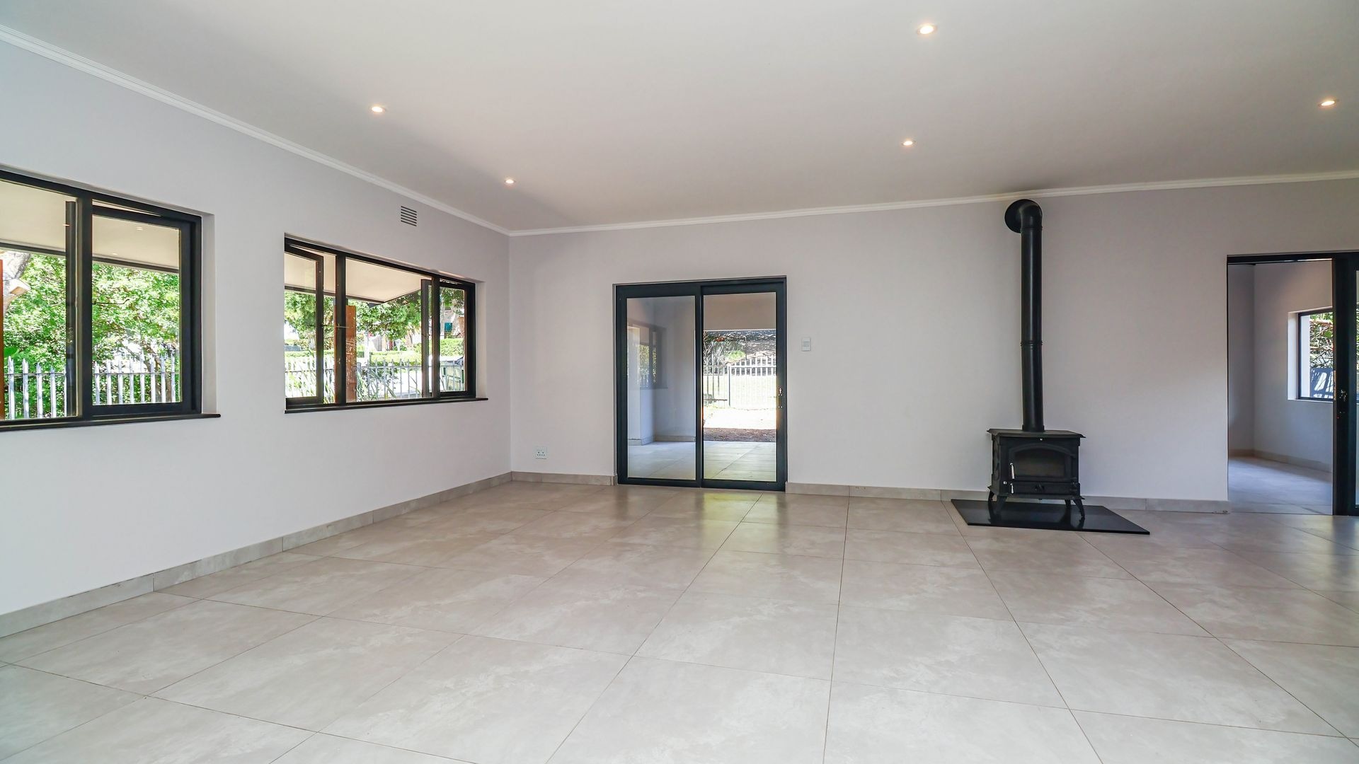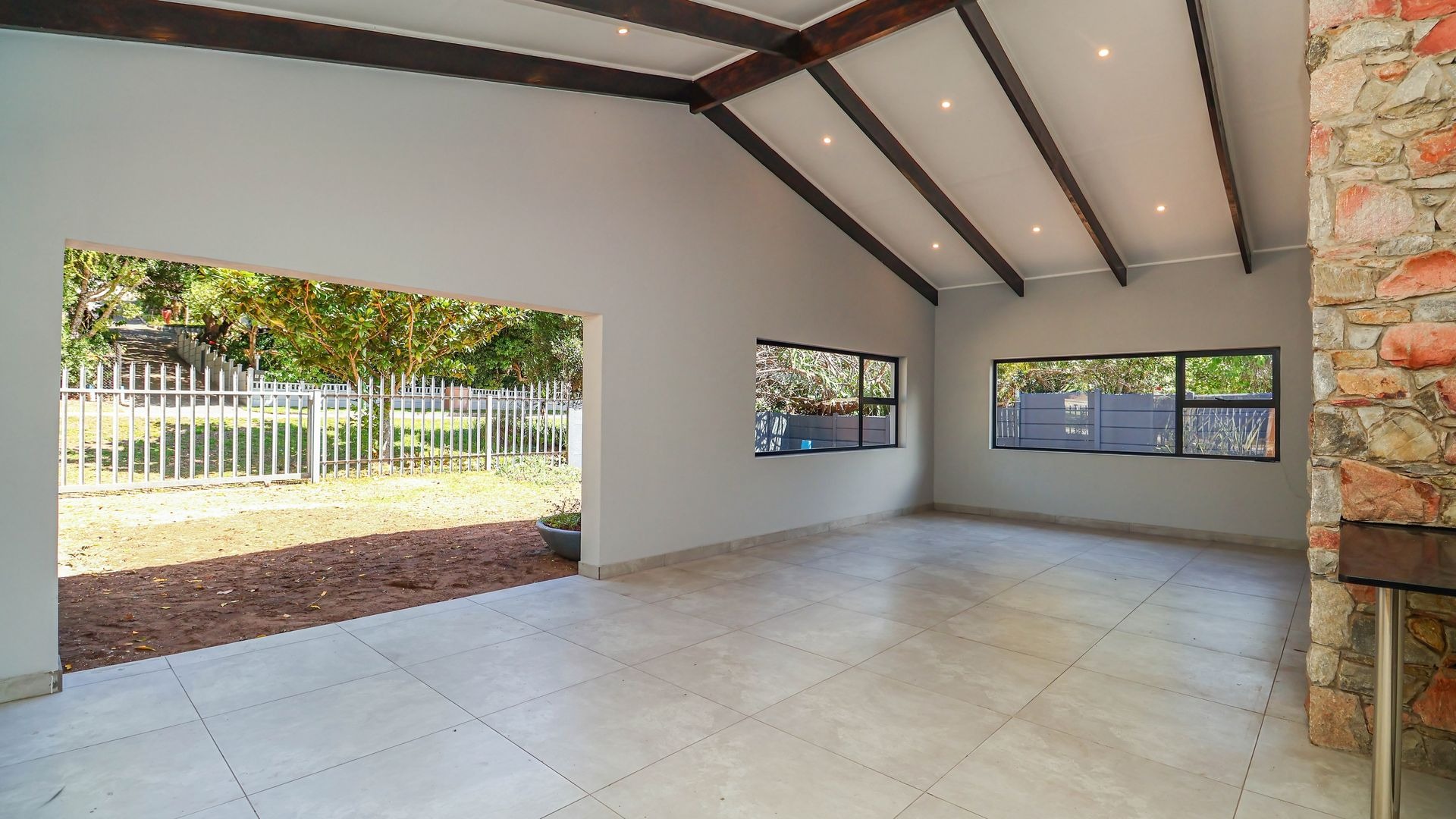 The well-appointed kitchen with stone countertops and a gas hob flows effortlessly into the dining area and lounge, which features a cozy fireplace. Large sliding doors open onto a covered patio with a built-in braai, extending the living space outdoors. Practical amenities such as a scullery, guest toilet, and welcoming entrance hall further enhance daily convenience.