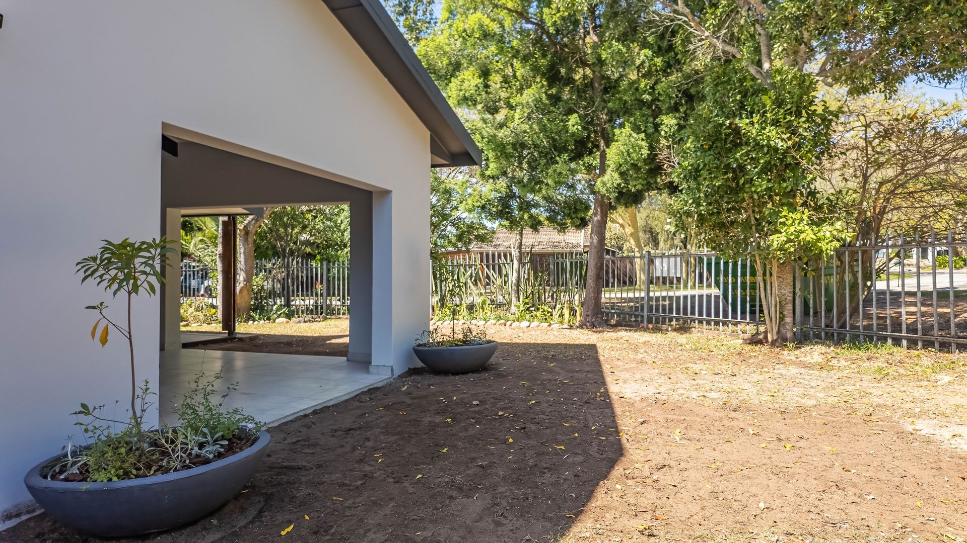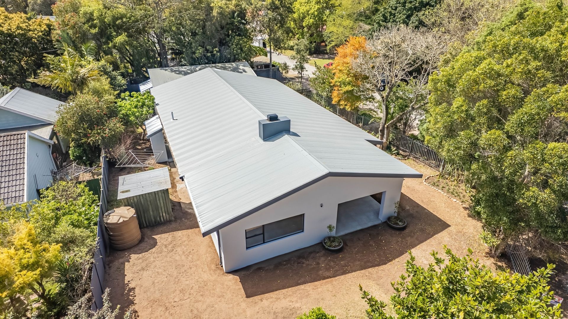 Outdoor living is a standout feature. The expansive covered patio, finished with modern lite grey tiles, offers an ideal space for entertaining and socialising, overlooking a garden with excellent landscaping potential. Mature trees provide natural shade, creating a serene backdrop for the property.