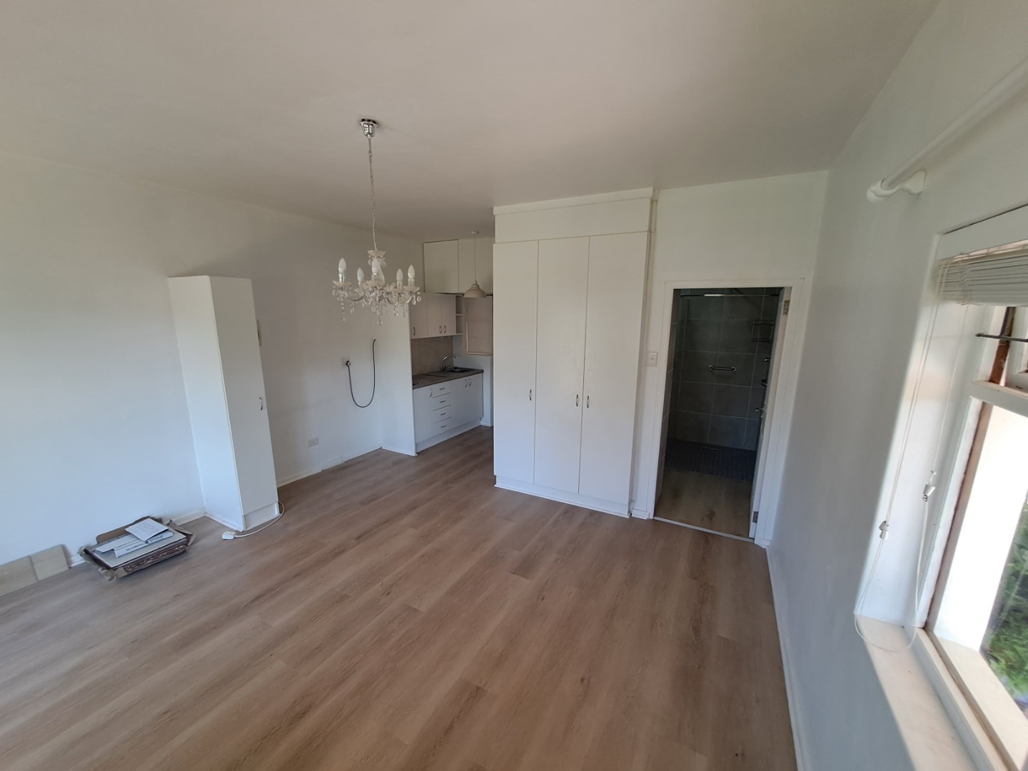 Discover comfortable and convenient living in this modern 1-bedroom, 1-bathroom studio apartment, ideally situated within a gated retirement village in the serene Hoekwil area of Wilderness. Spanning 35 sqm, this open-plan unit features contemporary laminate flooring, crisp white walls, and a stylish decorative chandelier, creating a bright and inviting atmosphere. The functional kitchenette is thoughtfully integrated, complemented by ample built-in wardrobes for efficient storage.