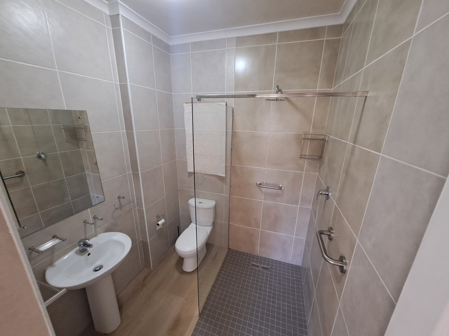 The compact yet well-appointed bathroom boasts a modern aesthetic with neutral tones, a walk-in shower featuring a glass partition and rain showerhead, and practical grab bars, ensuring comfort and accessibility. The property is wheelchair friendly, enhancing its appeal for diverse residents.
