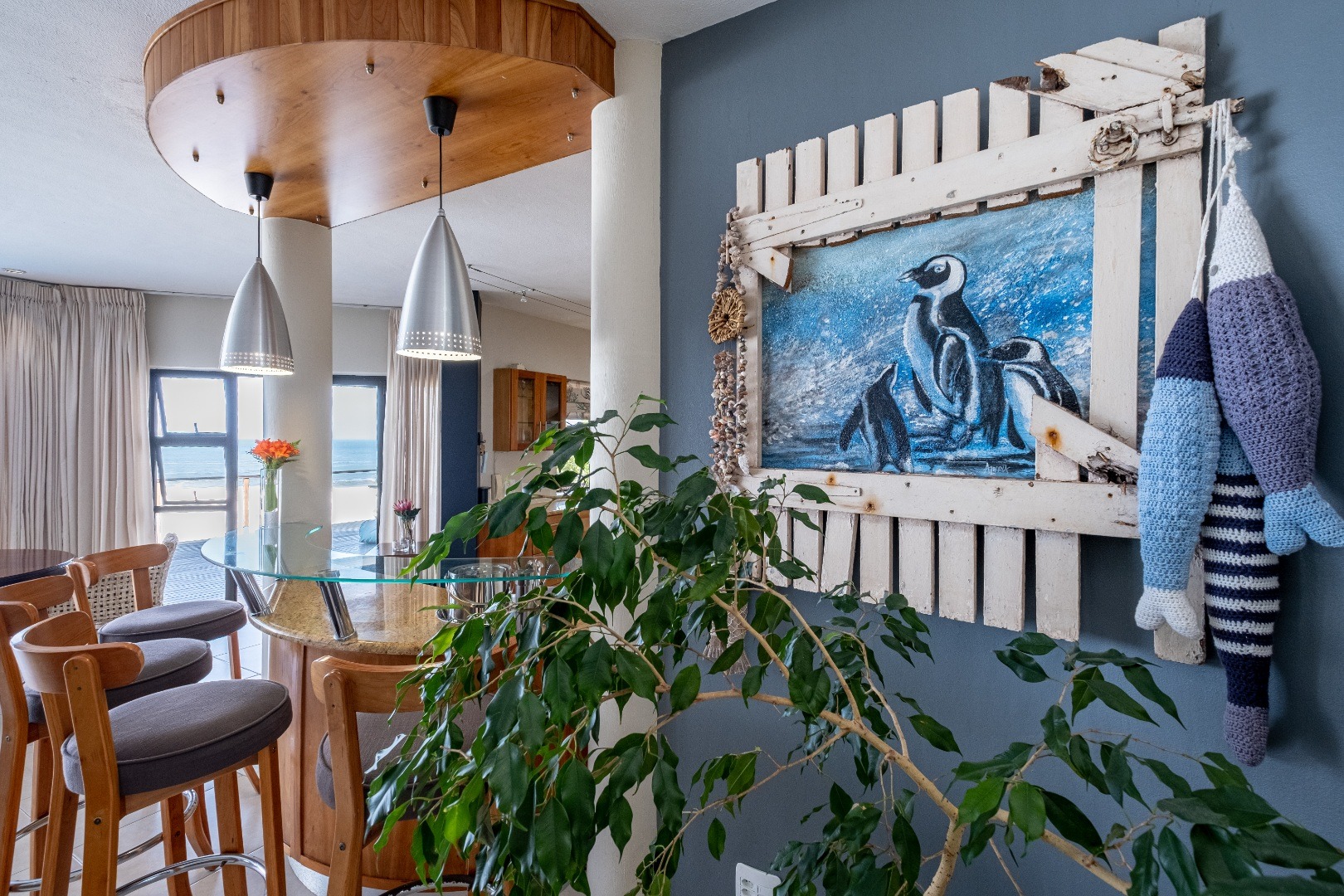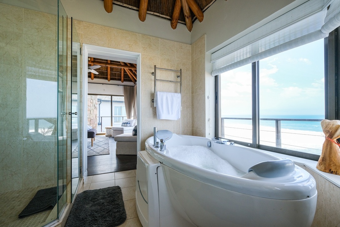 Perched high up overlooking the Indian Ocean this lovely 4-bedroom, 4-bathroom residence in Wilderness Central offers an unparalleled coastal living experience. From the moment you arrive, the unique thatched roof and the bright, spacious entryway with its wide tiled staircase and abundant natural light set a tone of sophisticated comfort.