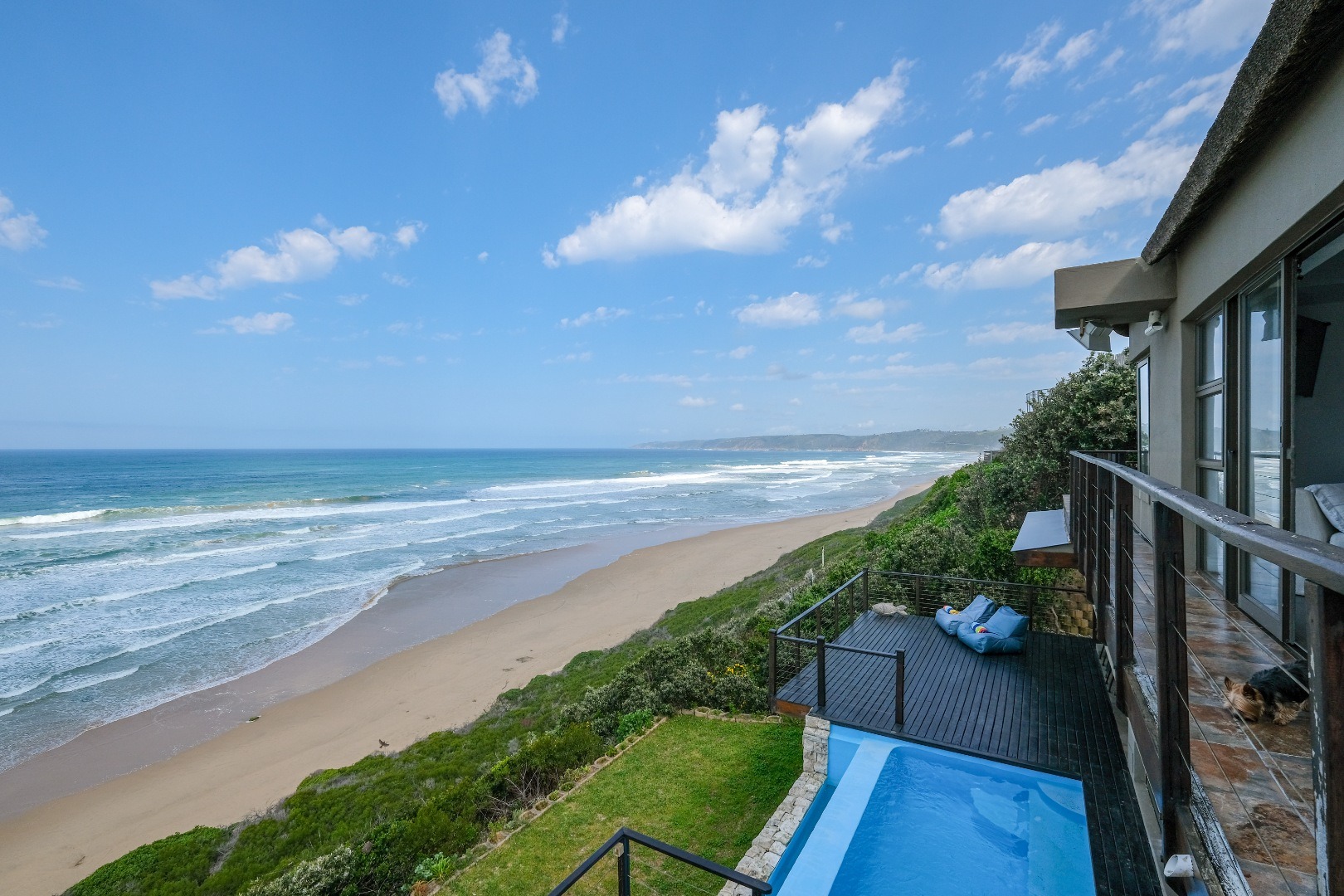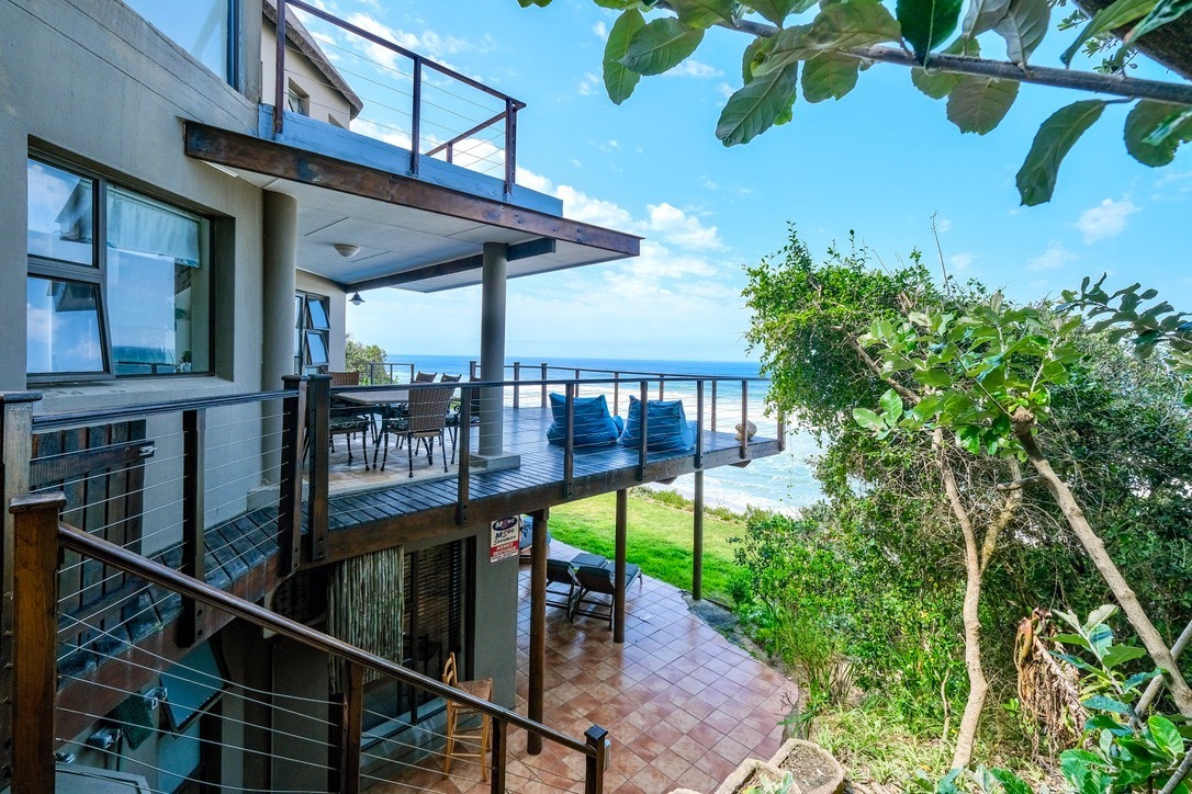 The outdoor spaces are a true highlight, designed to maximize enjoyment of the coastal environment. A private wooden deck, complete with a refreshing plunge pool and comfortable outdoor seating, offers an exclusive vantage point for soaking in the panoramic ocean views and enjoying direct access to the beautiful sandy beach below. This pet-friendly property also features a built-in braai, perfect for alfresco dining and entertaining, surrounded by a well-maintained garden. With a double garage providing secure parking, this home caters to a lifestyle of leisure and convenience.