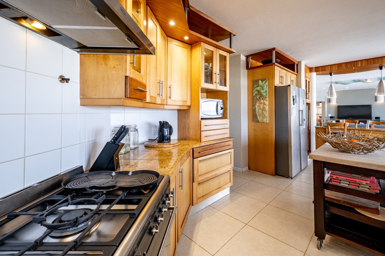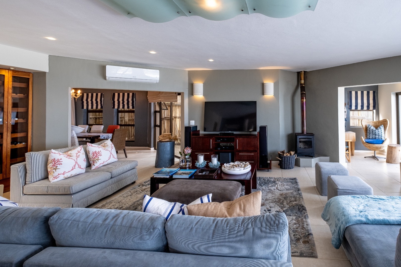 Step inside to discover an expansive open-plan layout designed for seamless indoor-outdoor living, where large sliding doors invite the ocean breeze and endless vistas into your home. The residence features two generous lounges and a dedicated dining room, all benefiting from the spectacular sea views. Comfort is assured with both a cozy wood-burning fireplace for cooler evenings and air conditioning for warmer days. The heart of this home is its modern kitchen, equipped with ample light wood cabinetry, durable granite countertops, and a suite of stainless steel appliances, including a double-door refrigerator and an integrated wine cooler. A movable kitchen island offers flexible workspace, complemented by a gas range and a convenient pantry. The dining area, adorned with an elegant crystal chandelier and built-in wooden cabinetry with wine storage, provides a sophisticated setting for entertaining, while a family TV room offers additional versatile space.