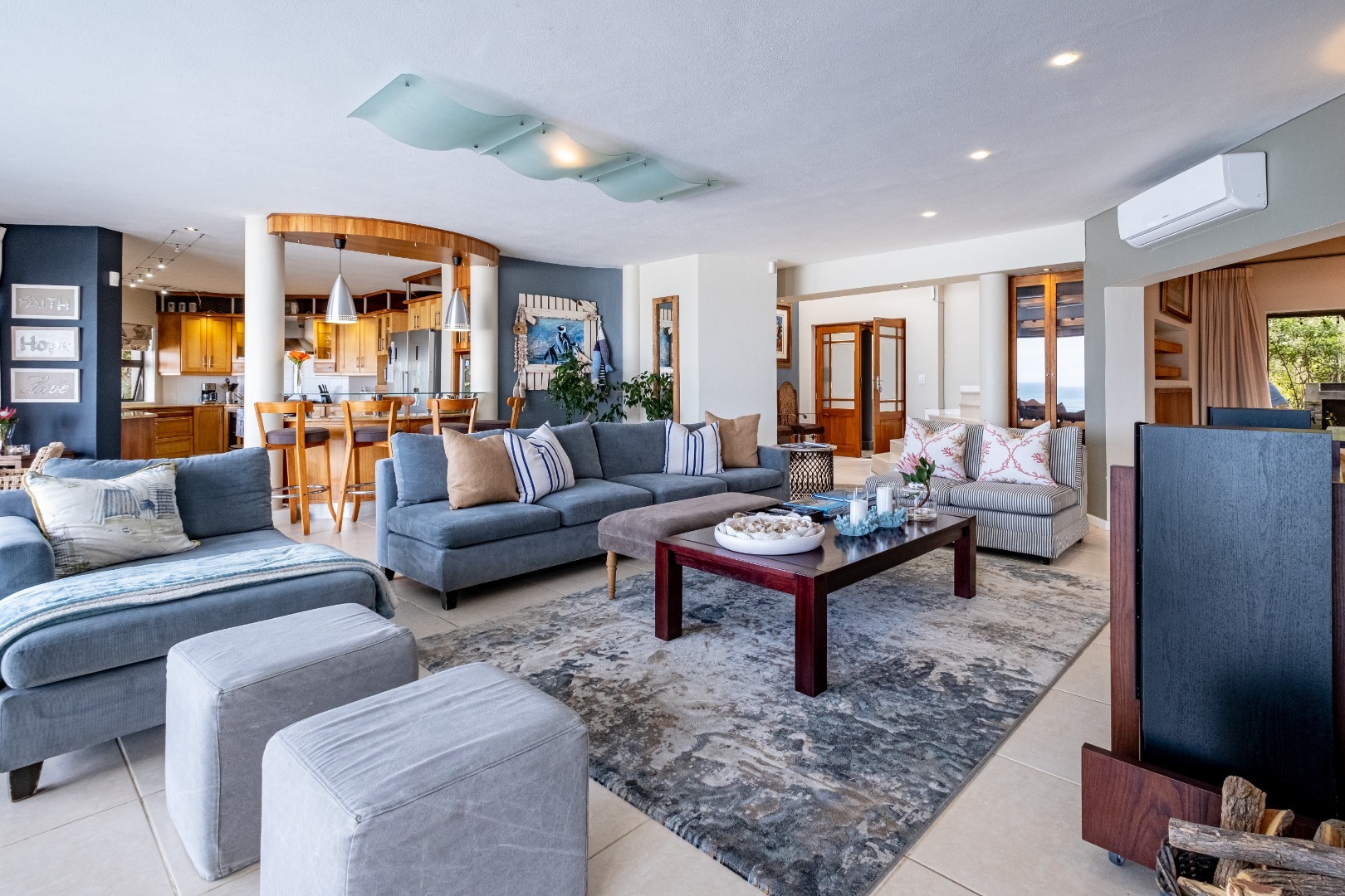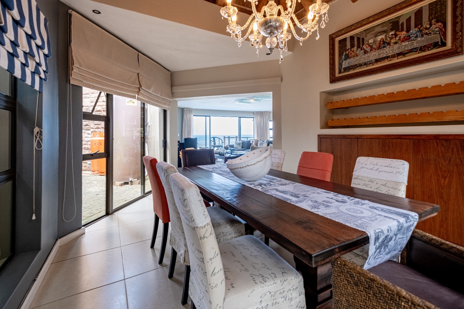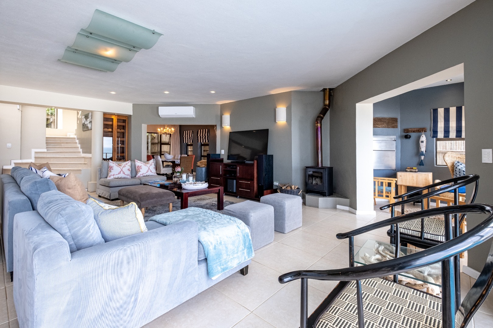 Step inside to discover an expansive open-plan layout designed for seamless indoor-outdoor living, where large sliding doors invite the ocean breeze and endless vistas into your home. The residence features two generous lounges and a dedicated dining room, all benefiting from the spectacular sea views. Comfort is assured with both a cozy wood-burning fireplace for cooler evenings and air conditioning for warmer days. The heart of this home is its modern kitchen, equipped with ample light wood cabinetry, durable granite countertops, and a suite of stainless steel appliances, including a double-door refrigerator and an integrated wine cooler. A movable kitchen island offers flexible workspace, complemented by a gas range and a convenient pantry. The dining area, adorned with an elegant crystal chandelier and built-in wooden cabinetry with wine storage, provides a sophisticated setting for entertaining, while a family TV room offers additional versatile space.
