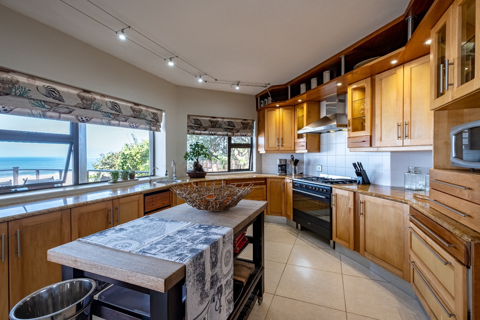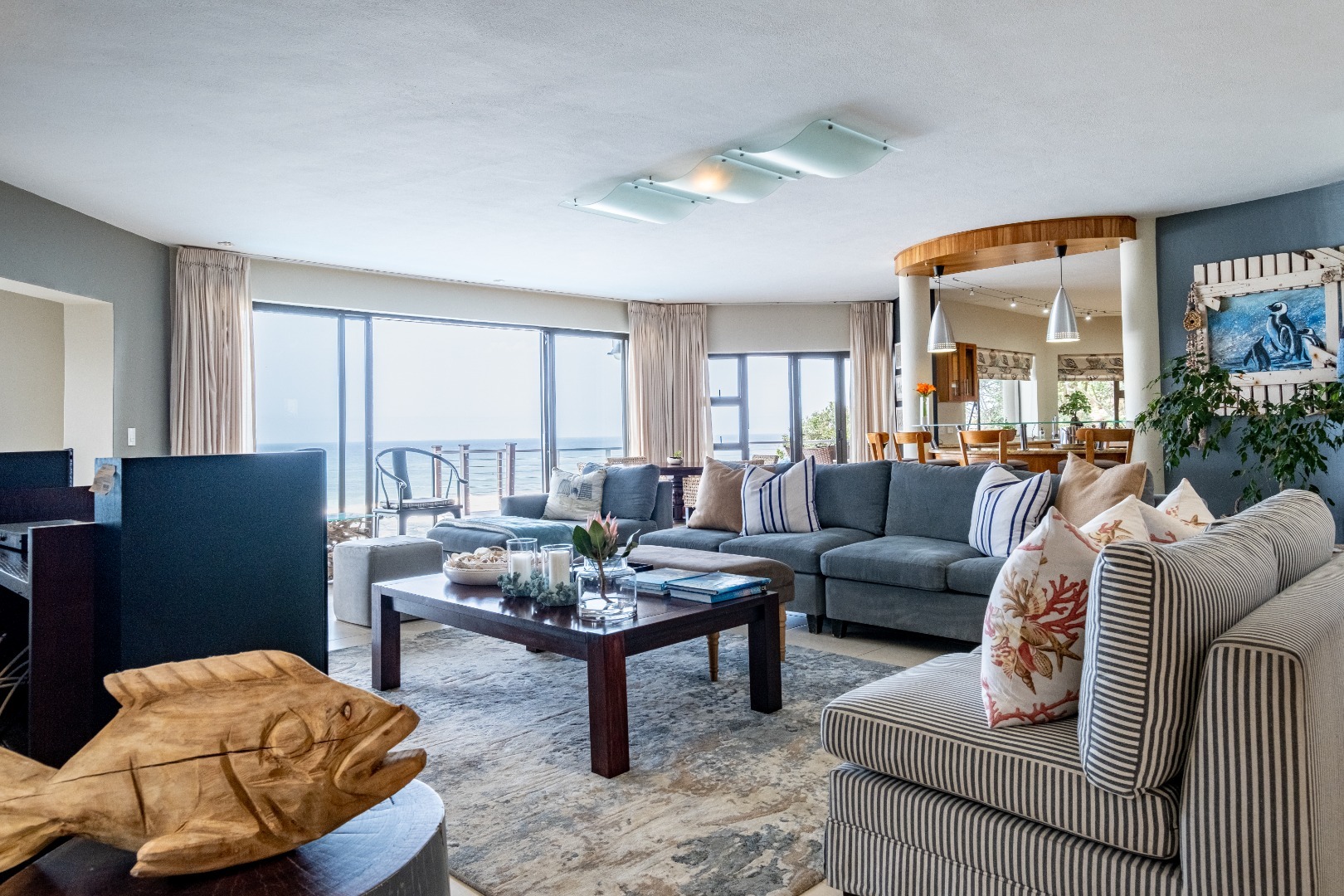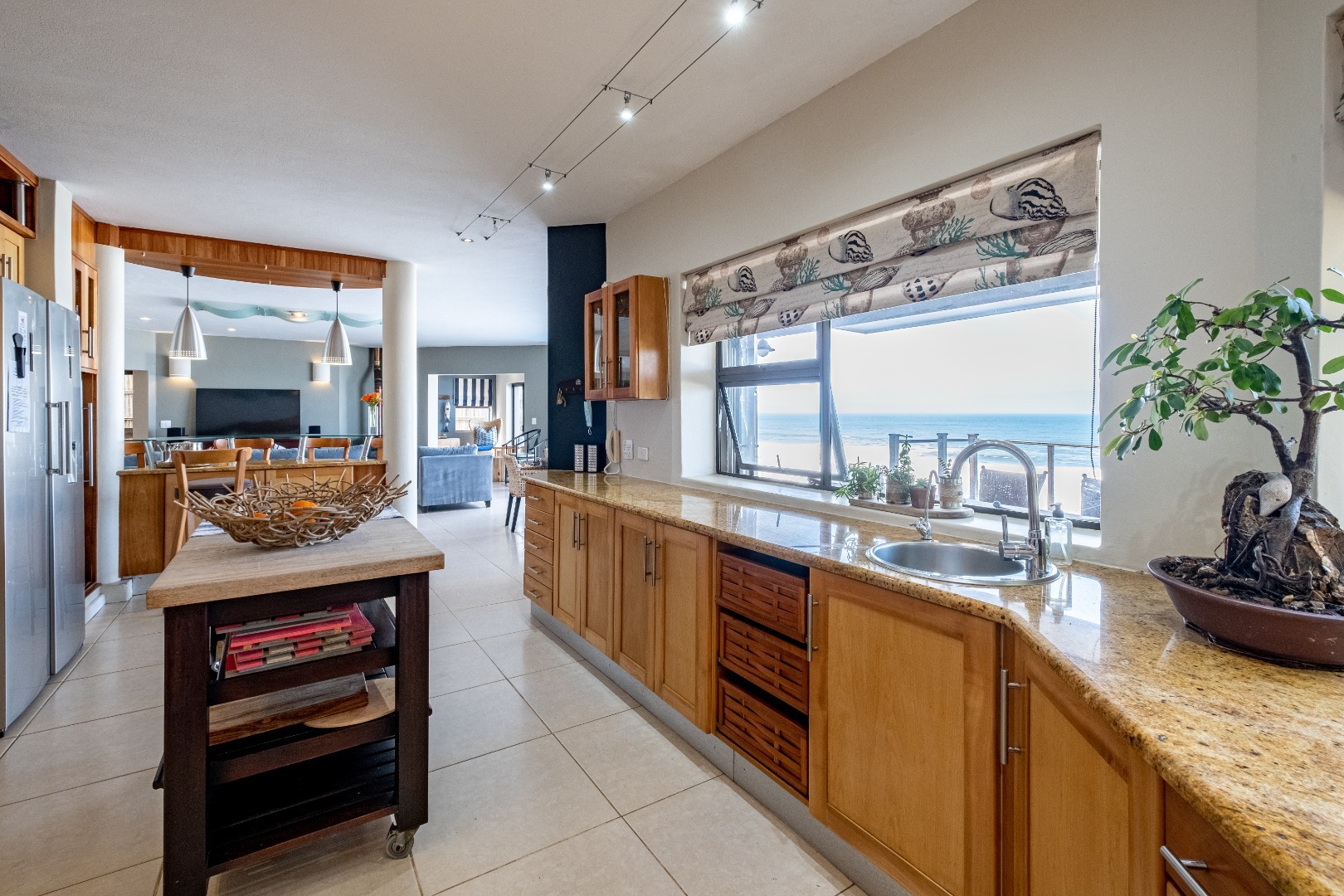 Step inside to discover an expansive open-plan layout designed for seamless indoor-outdoor living, where large sliding doors invite the ocean breeze and endless vistas into your home. The residence features two generous lounges and a dedicated dining room, all benefiting from the spectacular sea views. Comfort is assured with both a cozy wood-burning fireplace for cooler evenings and air conditioning for warmer days. The heart of this home is its modern kitchen, equipped with ample light wood cabinetry, durable granite countertops, and a suite of stainless steel appliances, including a double-door refrigerator and an integrated wine cooler. A movable kitchen island offers flexible workspace, complemented by a gas range and a convenient pantry. The dining area, adorned with an elegant crystal chandelier and built-in wooden cabinetry with wine storage, provides a sophisticated setting for entertaining, while a family TV room offers additional versatile space.