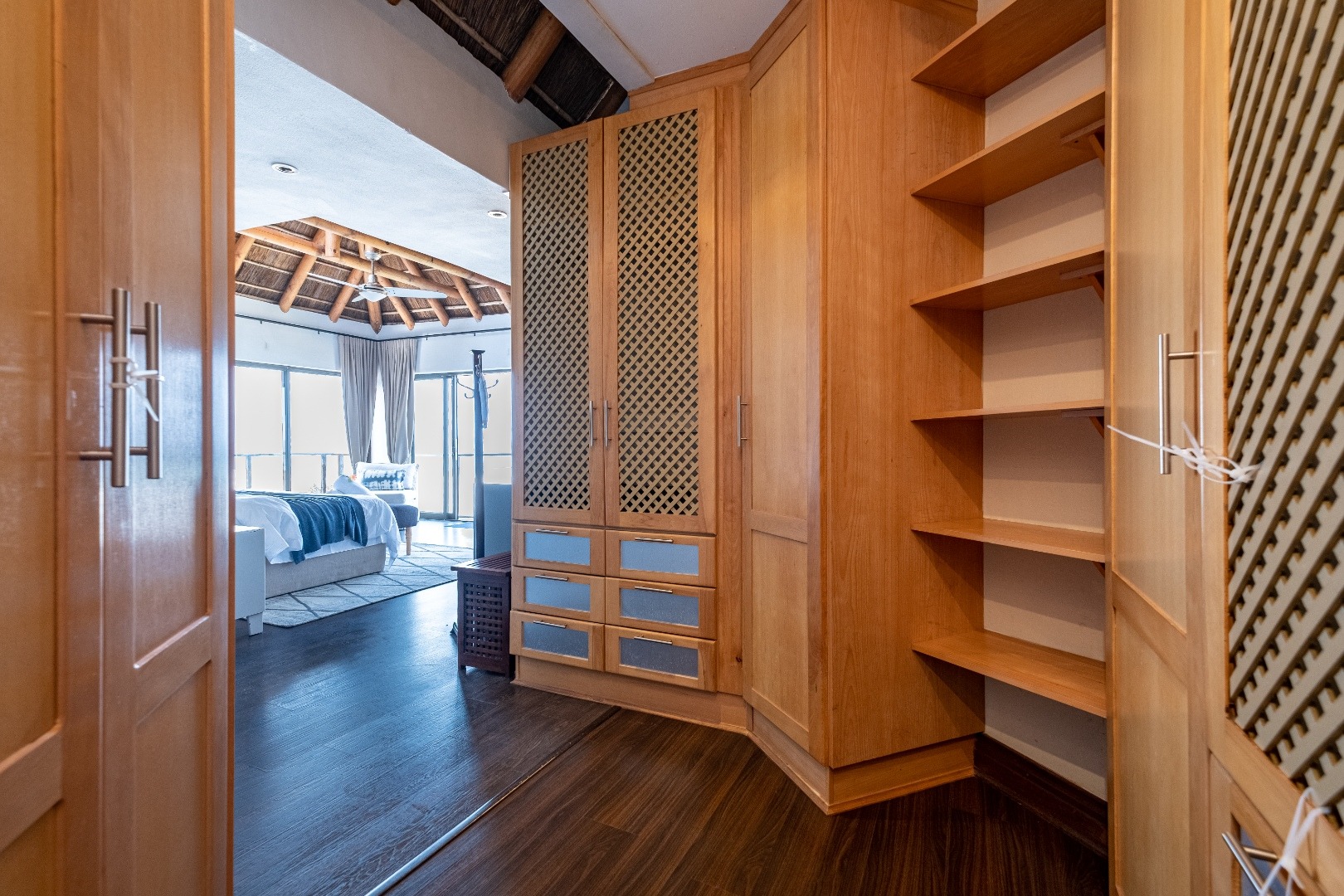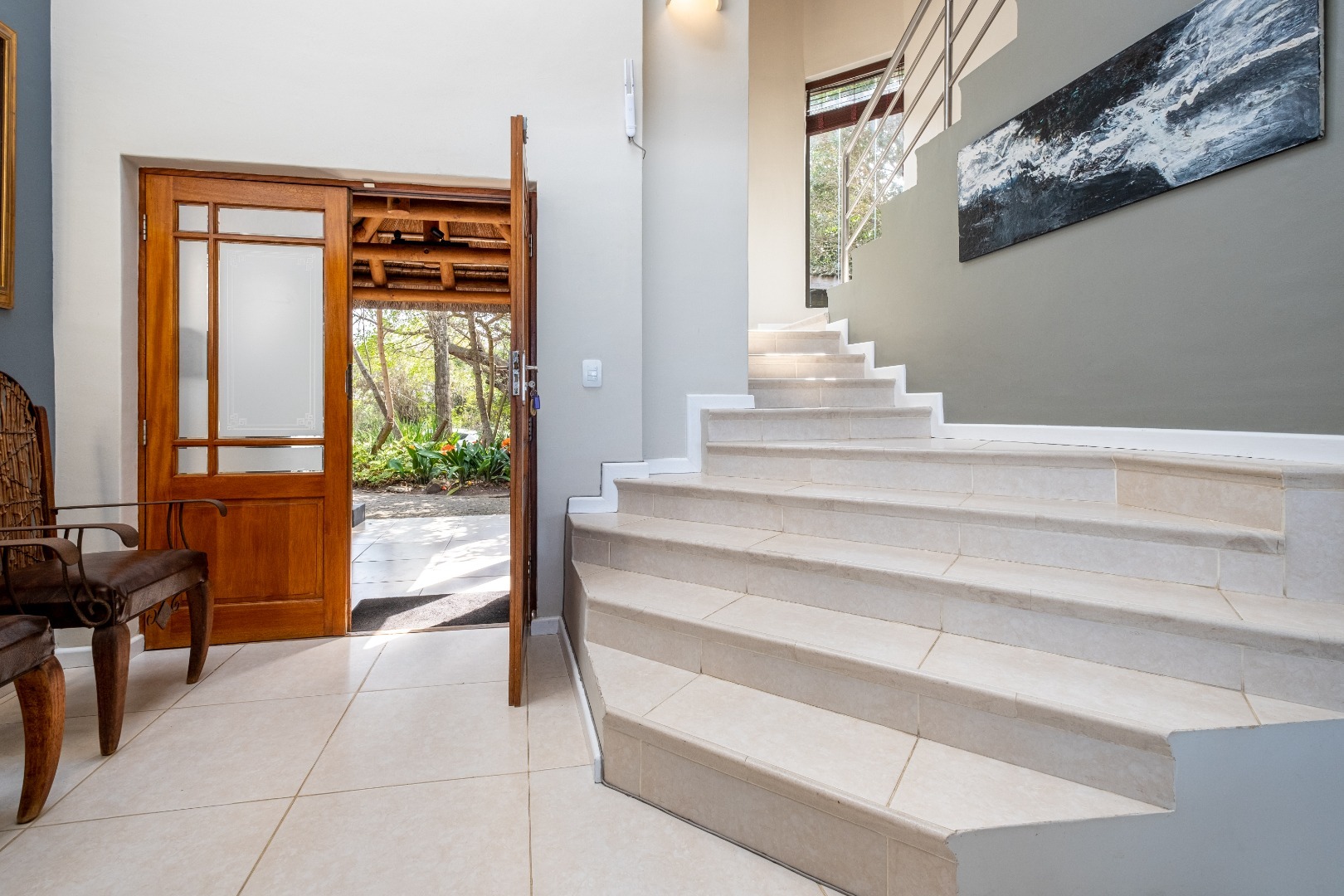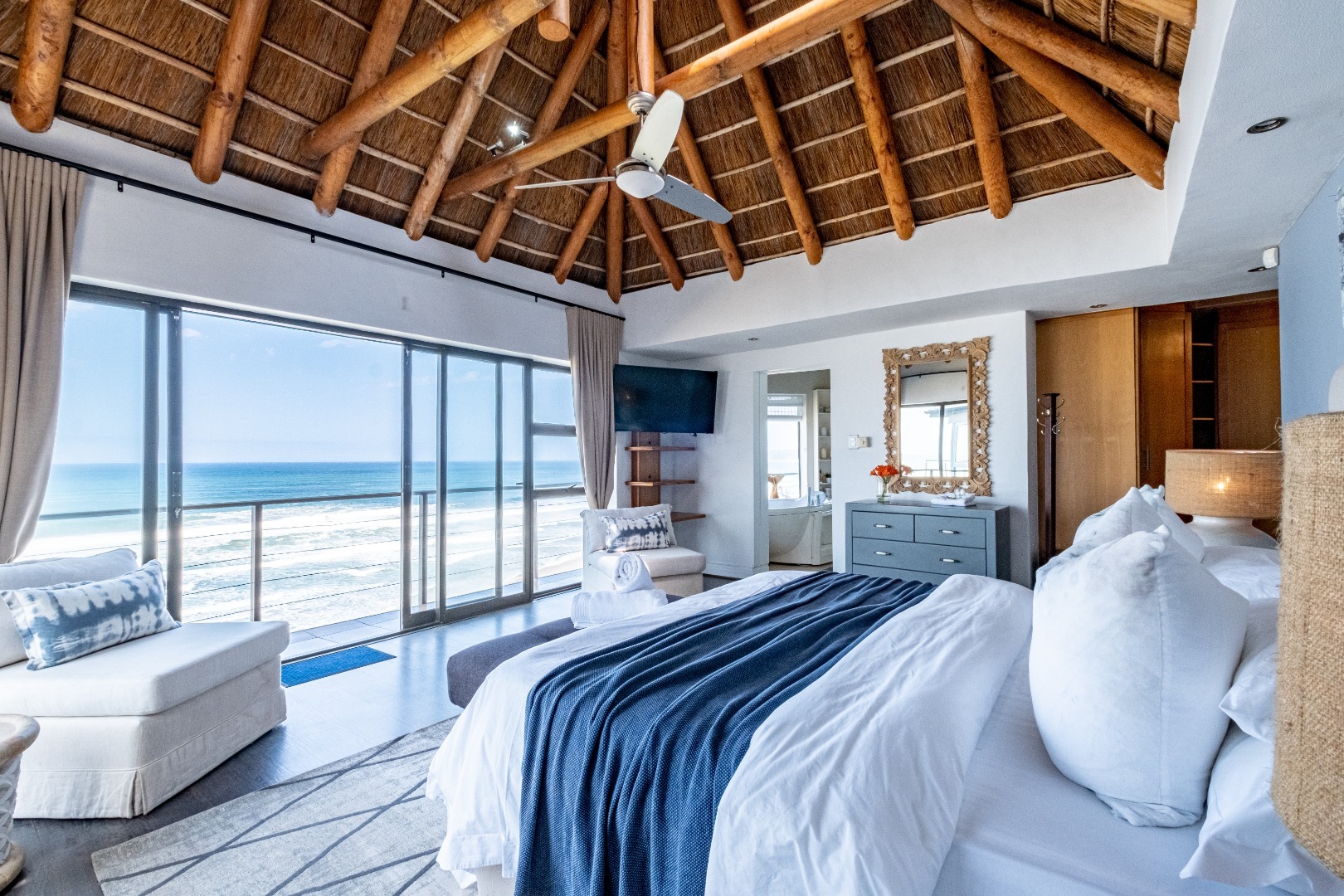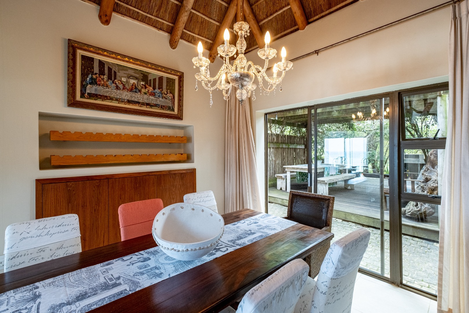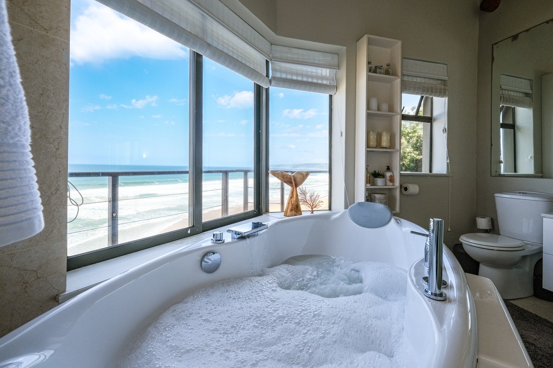 Perched high up overlooking the Indian Ocean this lovely 4-bedroom, 4-bathroom residence in Wilderness Central offers an unparalleled coastal living experience. From the moment you arrive, the unique thatched roof and the bright, spacious entryway with its wide tiled staircase and abundant natural light set a tone of sophisticated comfort.