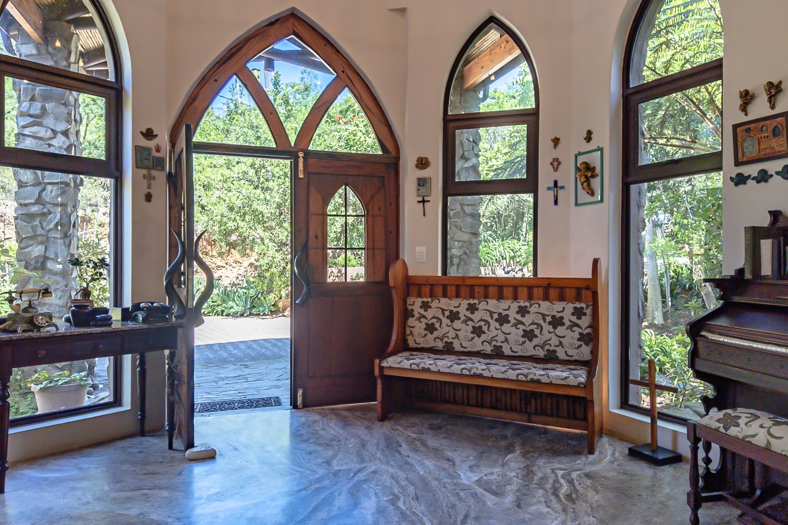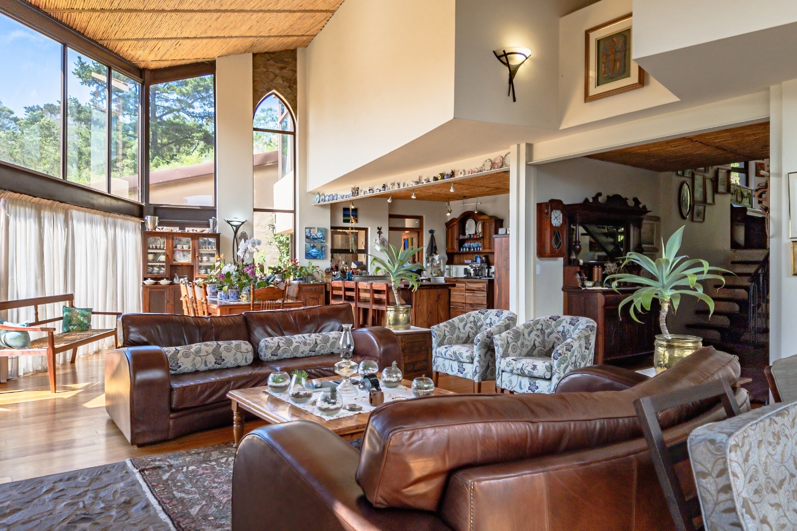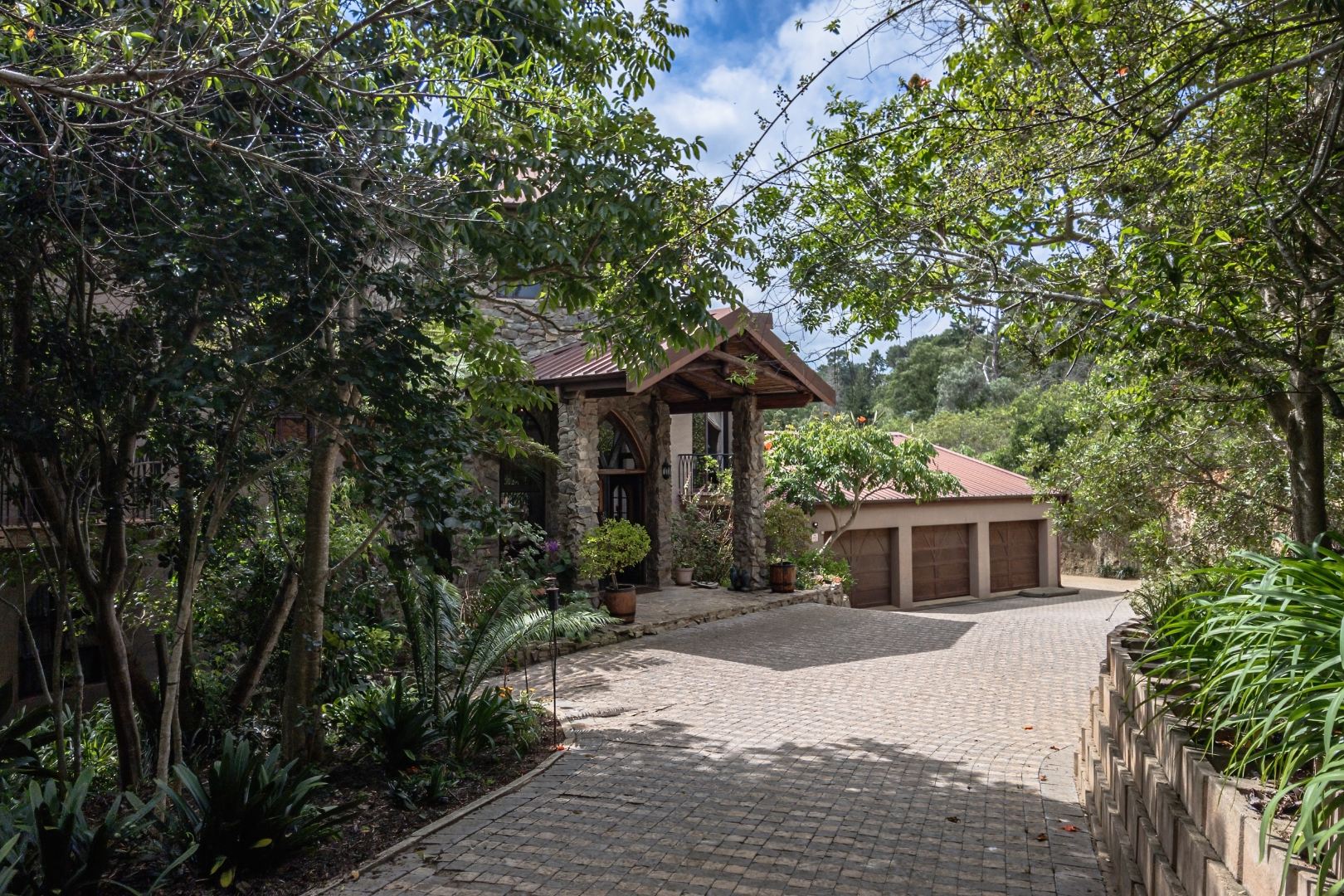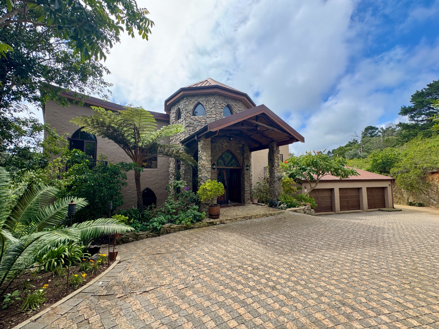 Discover a truly unique residential offering in the serene Wilderness Heights, South Africa. This secluded sanctuary, set on an expansive 3.05-hectare plot, boasts a desirable sunny north aspect and breathtaking views over an indigenous forest. The property welcomes you through a distinctive Gothic-style stone clad south entrance, featuring solid wood doors that open into a dramatic double-volume tower.