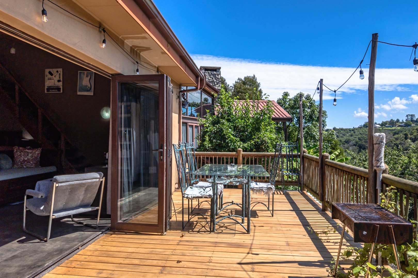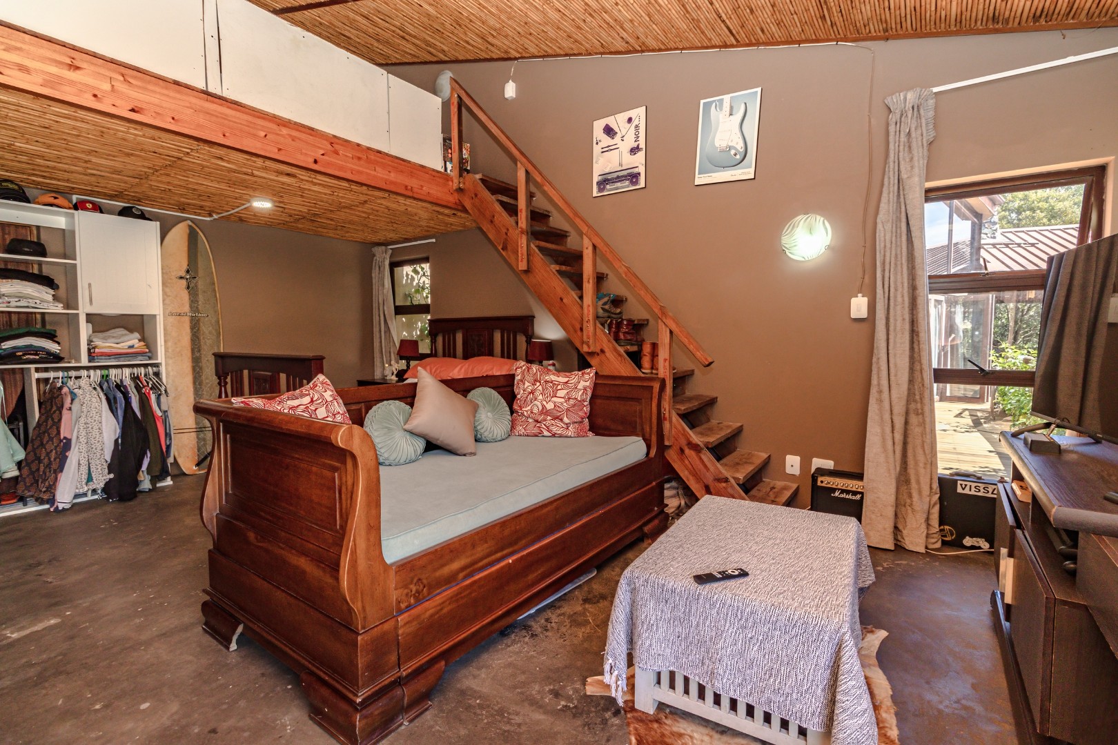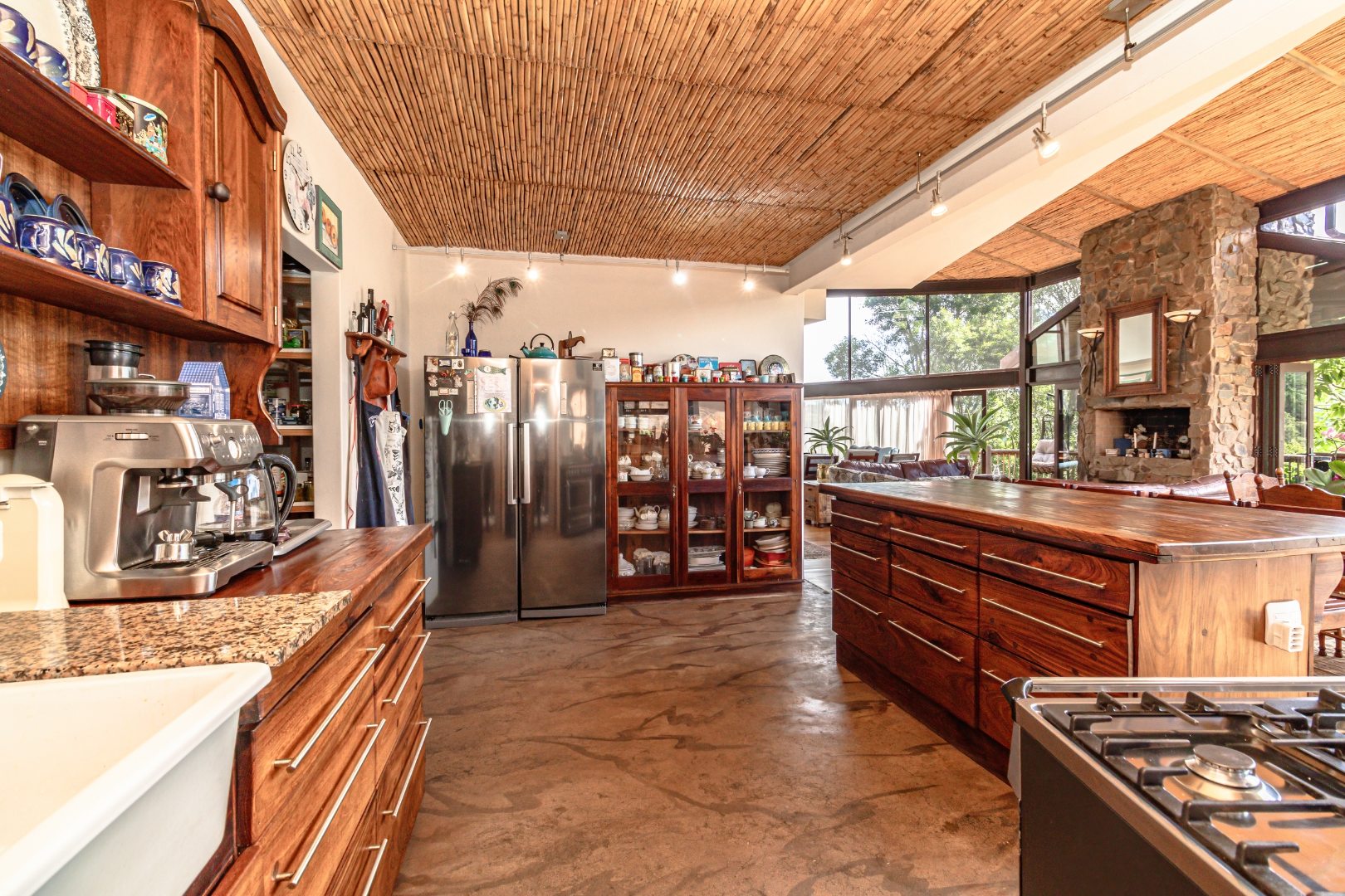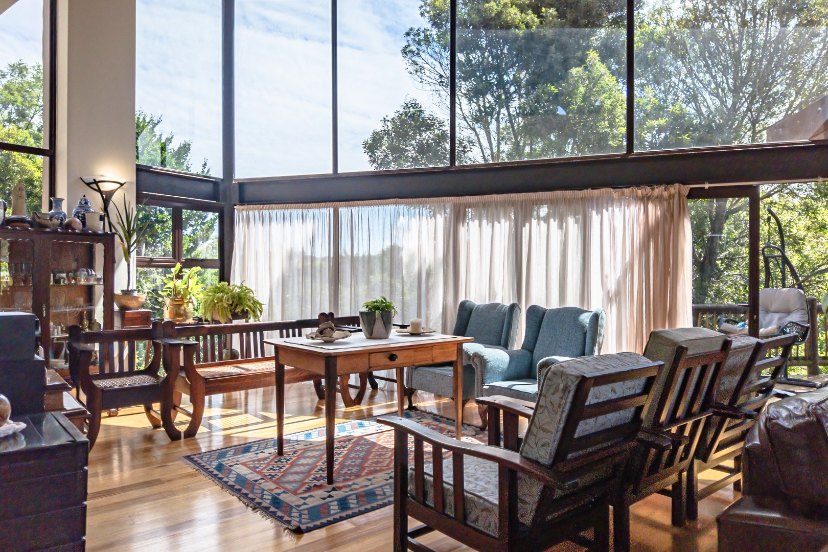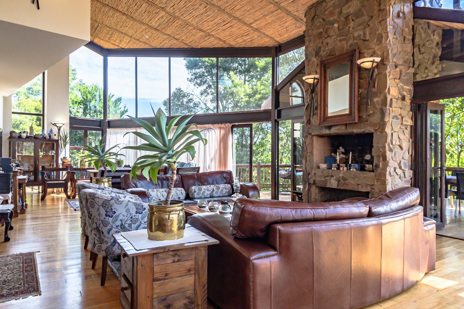 The heart of the home is the light-filled living area, designed with stacking doors and high glass windows to embrace the northern light. It features a comfortable lounge with a double-sided stone clad fireplace, extending seamlessly to an entertainment deck where it serves as a built-in braai. The open-plan kitchen and dining area is equipped with a central preparation island, a breakfast nook, and a separate scullery, making it ideal for both everyday living and entertaining. The living spaces flow effortlessly onto the private north-facing entertainment deck, offering secluded forest views.
