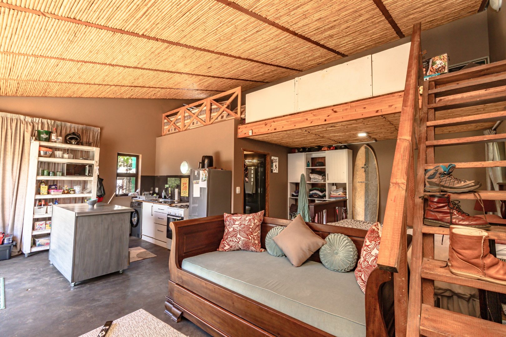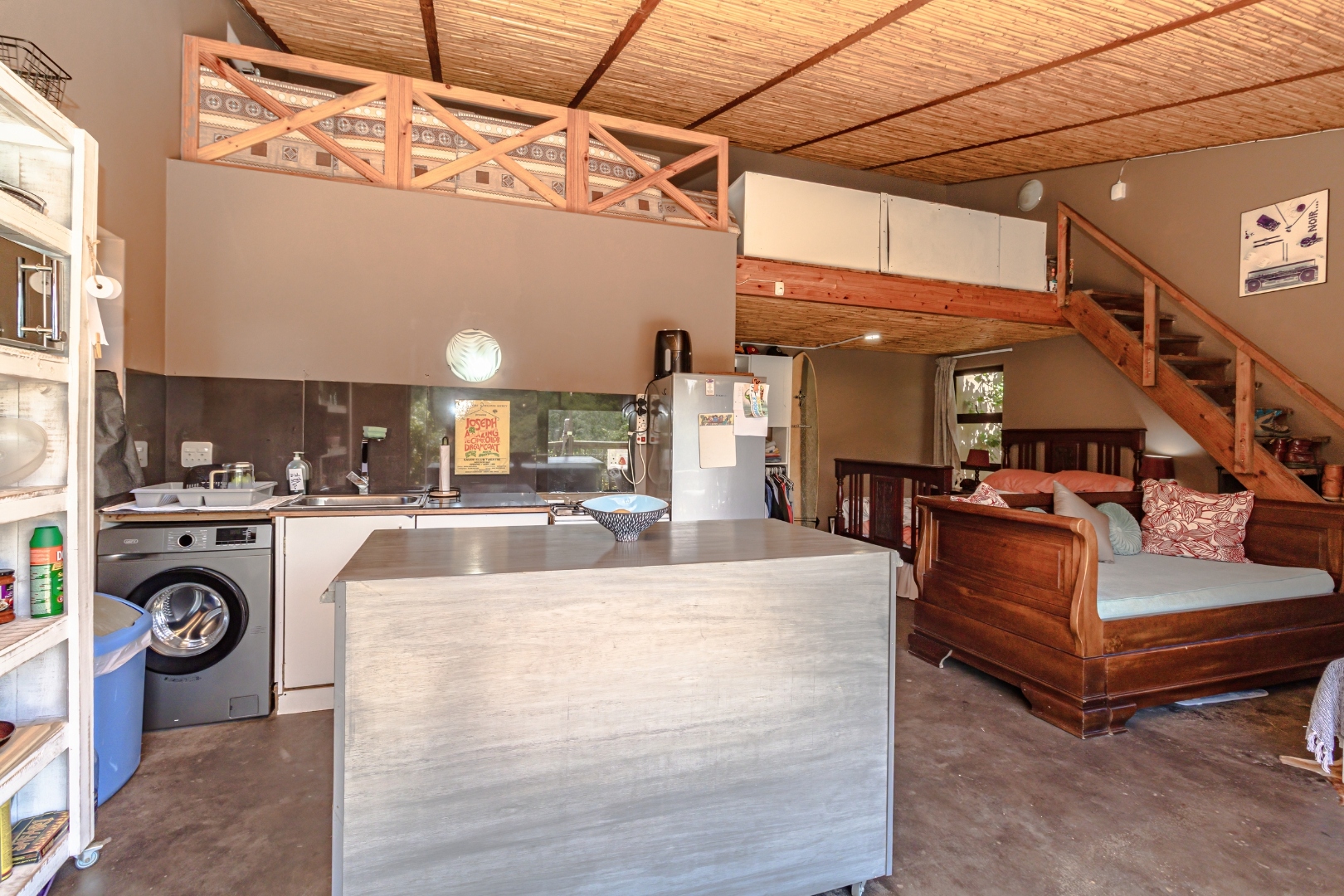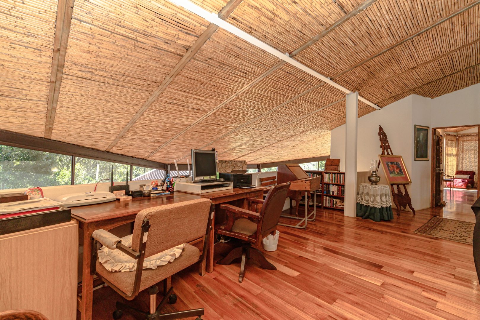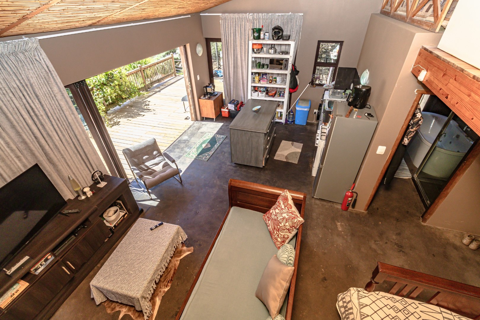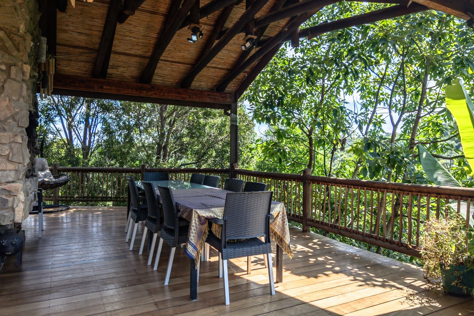 The heart of the home is the light-filled living area, designed with stacking doors and high glass windows to embrace the northern light. It features a comfortable lounge with a double-sided stone clad fireplace, extending seamlessly to an entertainment deck where it serves as a built-in braai. The open-plan kitchen and dining area is equipped with a central preparation island, a breakfast nook, and a separate scullery, making it ideal for both everyday living and entertaining. The living spaces flow effortlessly onto the private north-facing entertainment deck, offering secluded forest views.