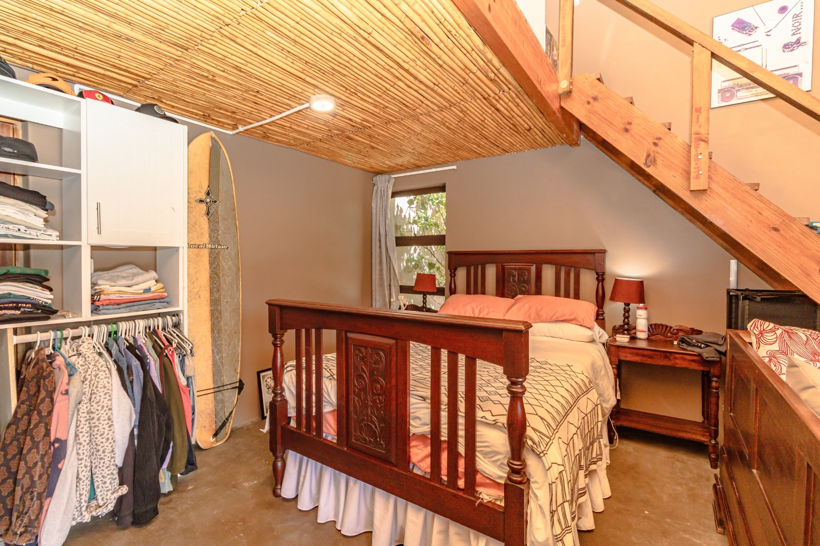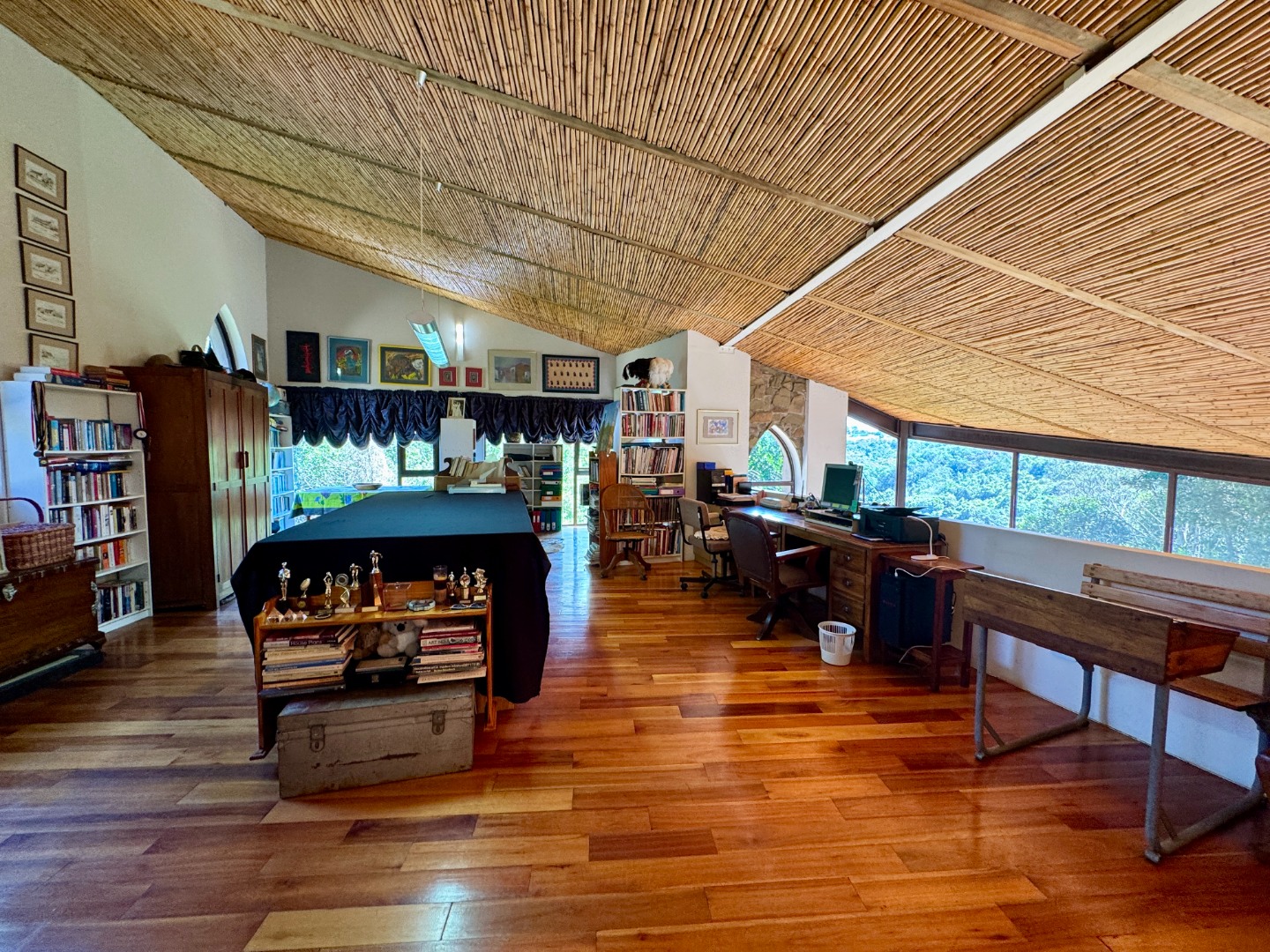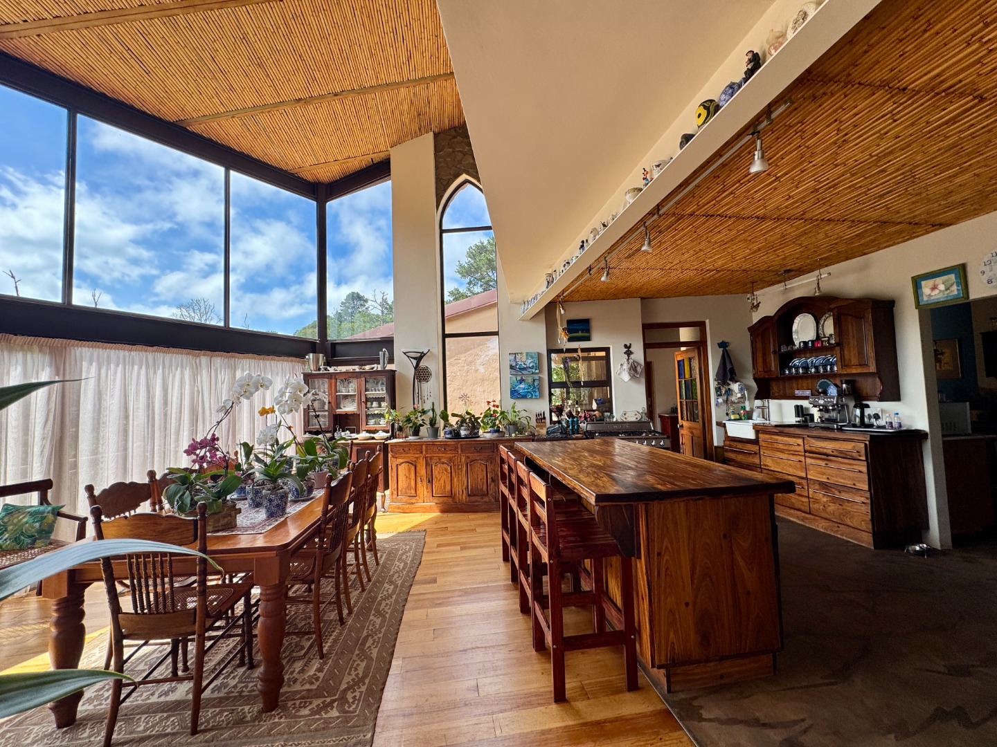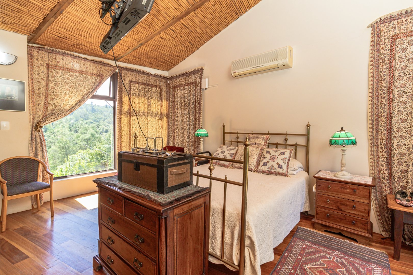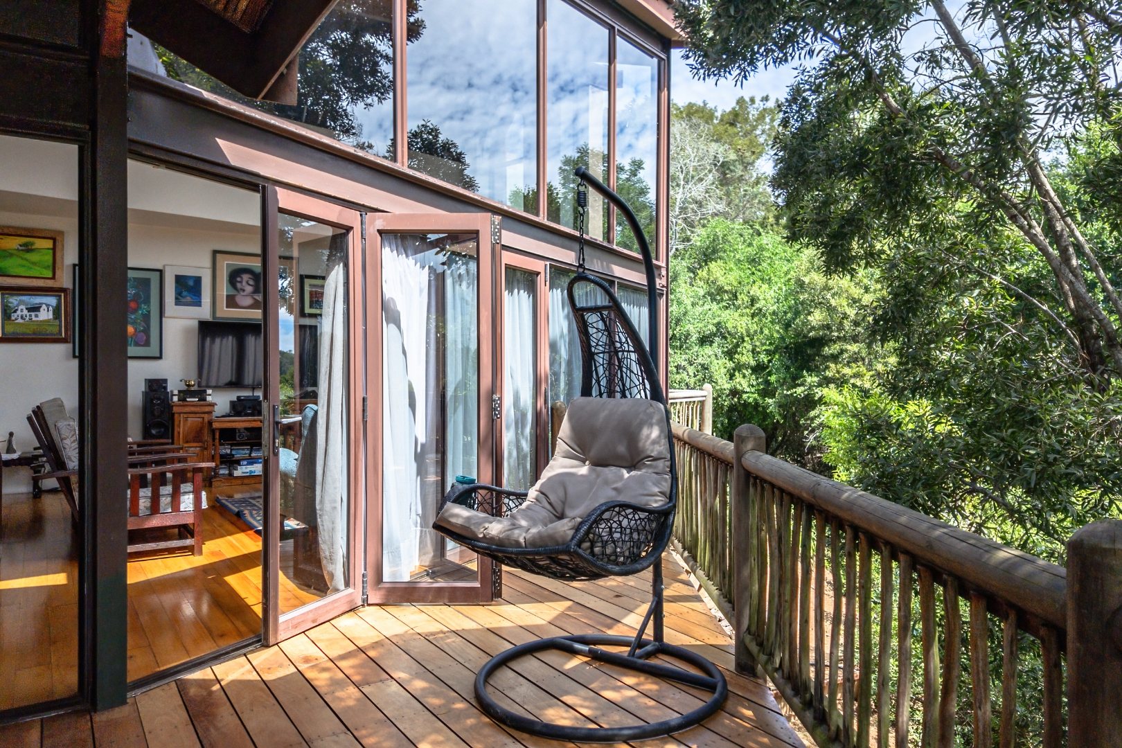 Inside, the home exudes character with elegant Saligna wood floors throughout. Stairs ascend to a versatile mezzanine floor, ideal for a spacious studio or a dedicated home office, offering views over the main living area. The main bedroom provides a tranquil retreat with a step-out balcony, perfect for enjoying the forest vistas, and an open-plan en-suite bathroom complete with a luxurious jacuzzi bath. A second well-appointed bedroom and an additional bathroom are also located on this level.
