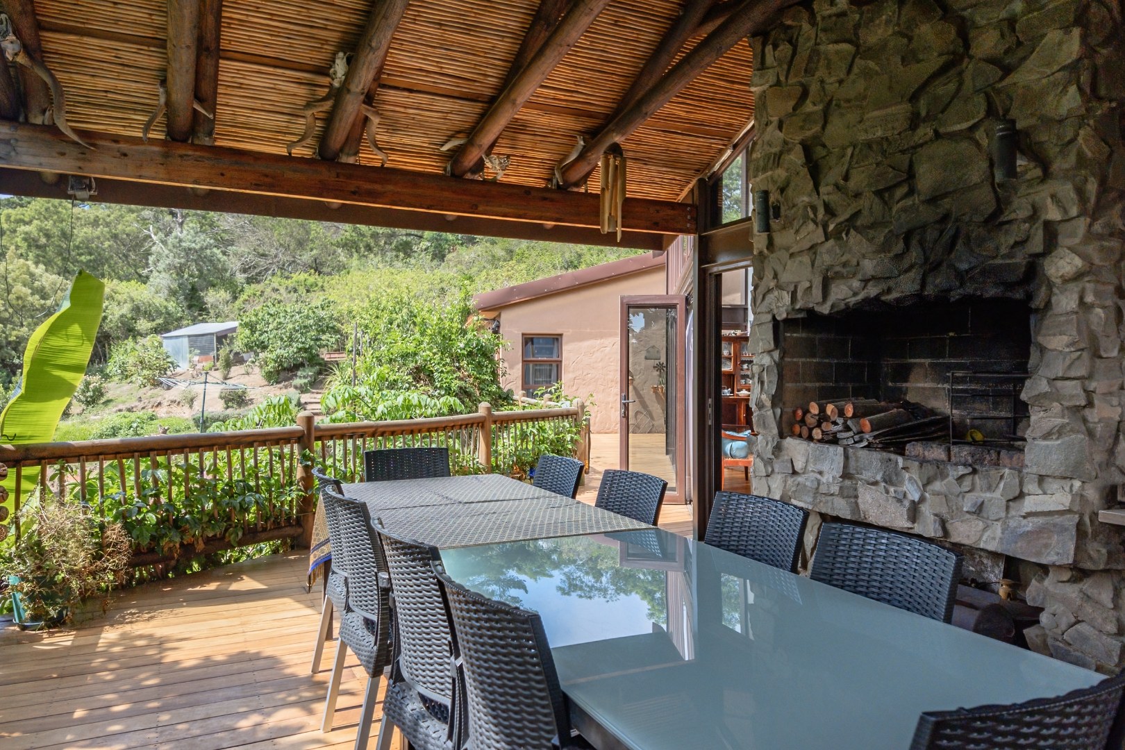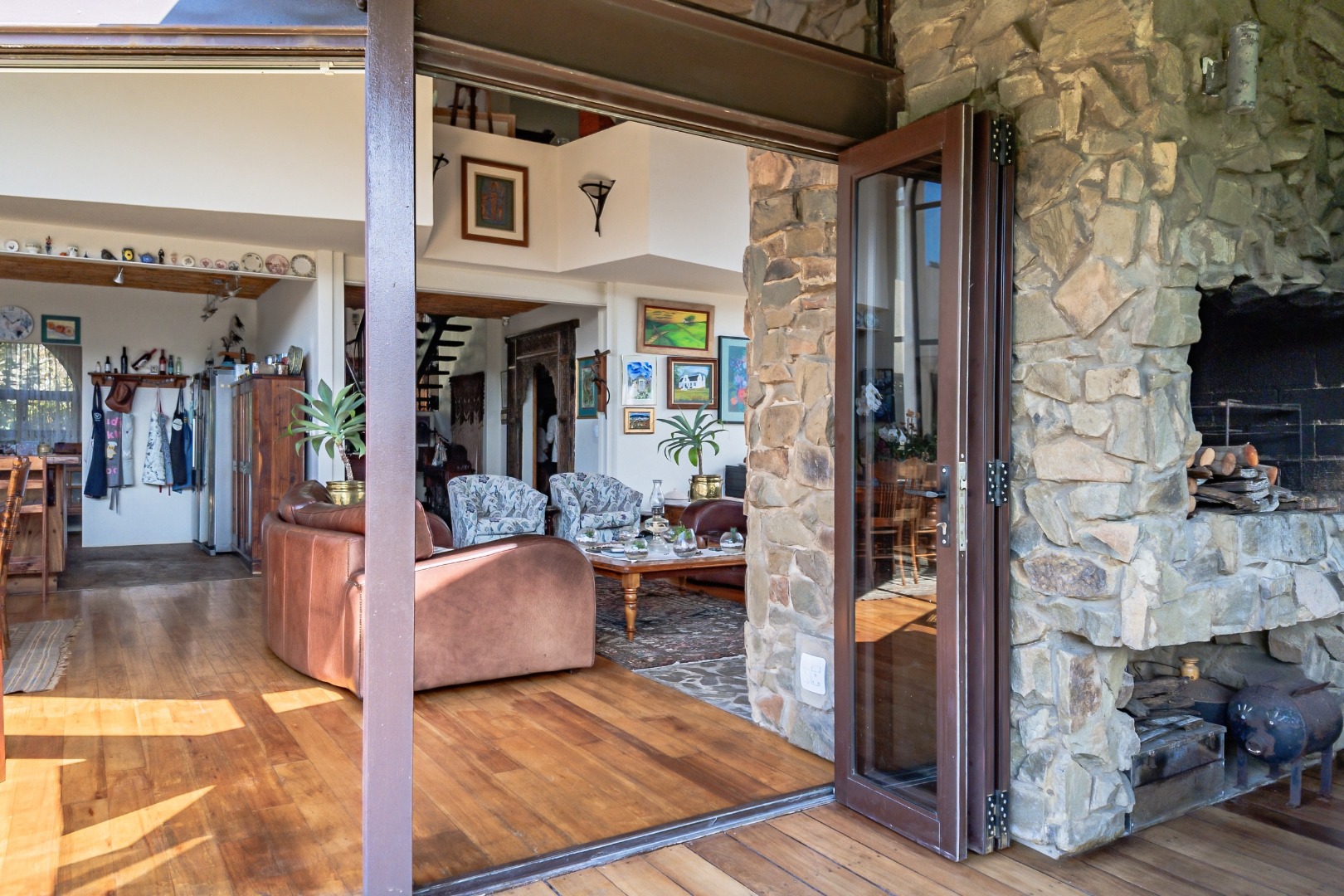 - Open-plan living area with double-sided fireplace and built-in braai on entertainment deck