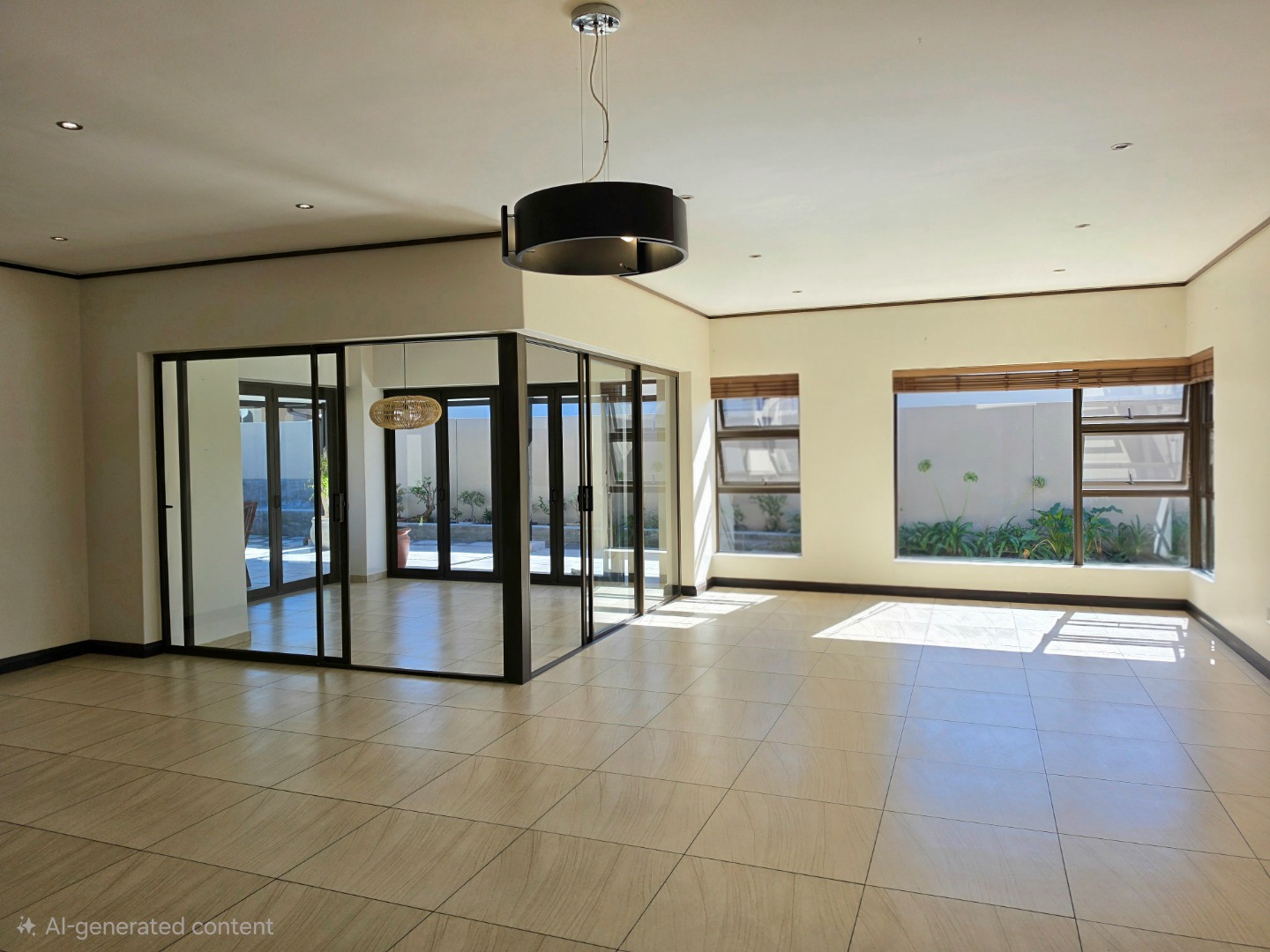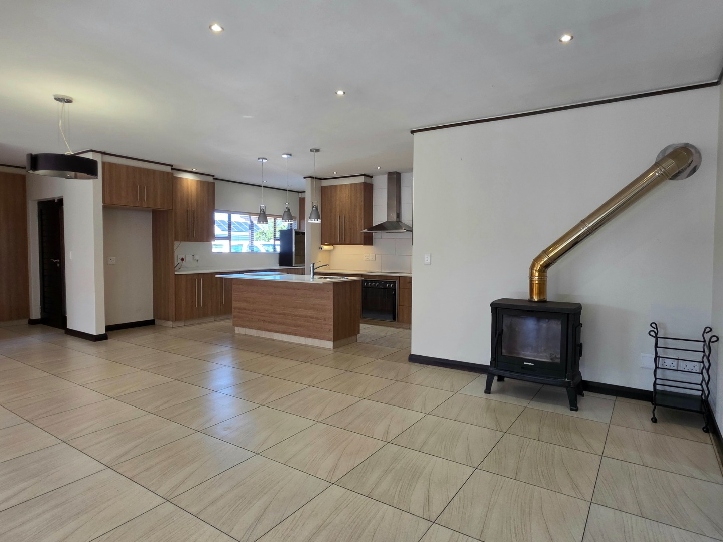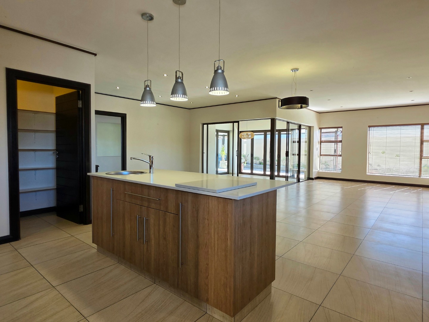 Elegant Interiors: An open-plan lounge and dining area flow into a designer kitchen equipped with a walk-in pantry and separate scullery.