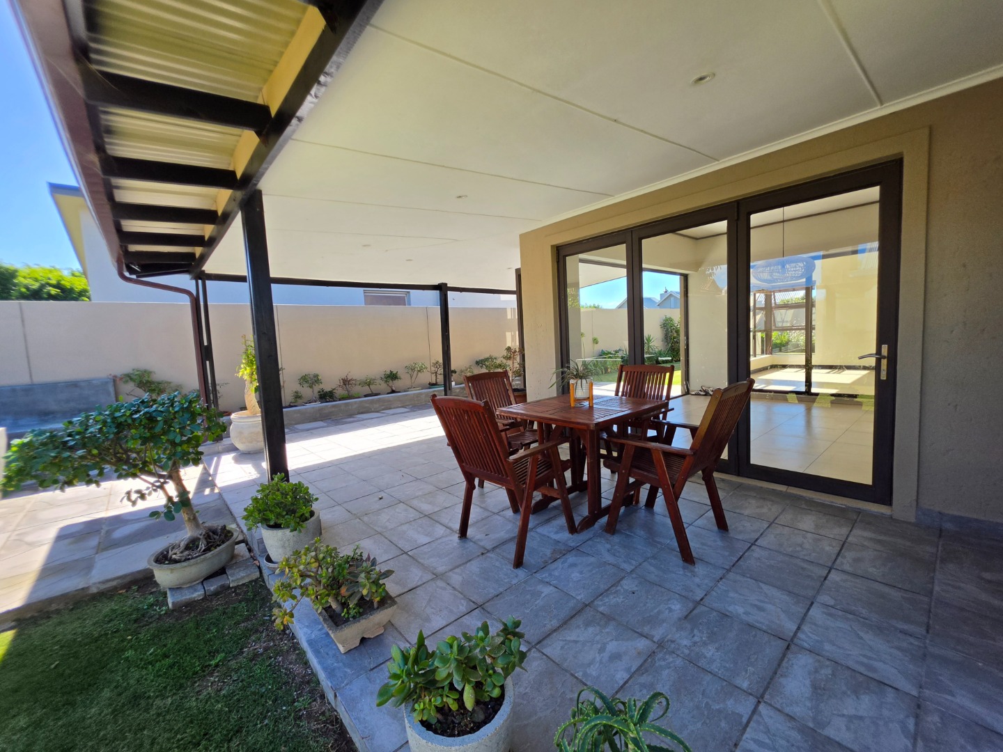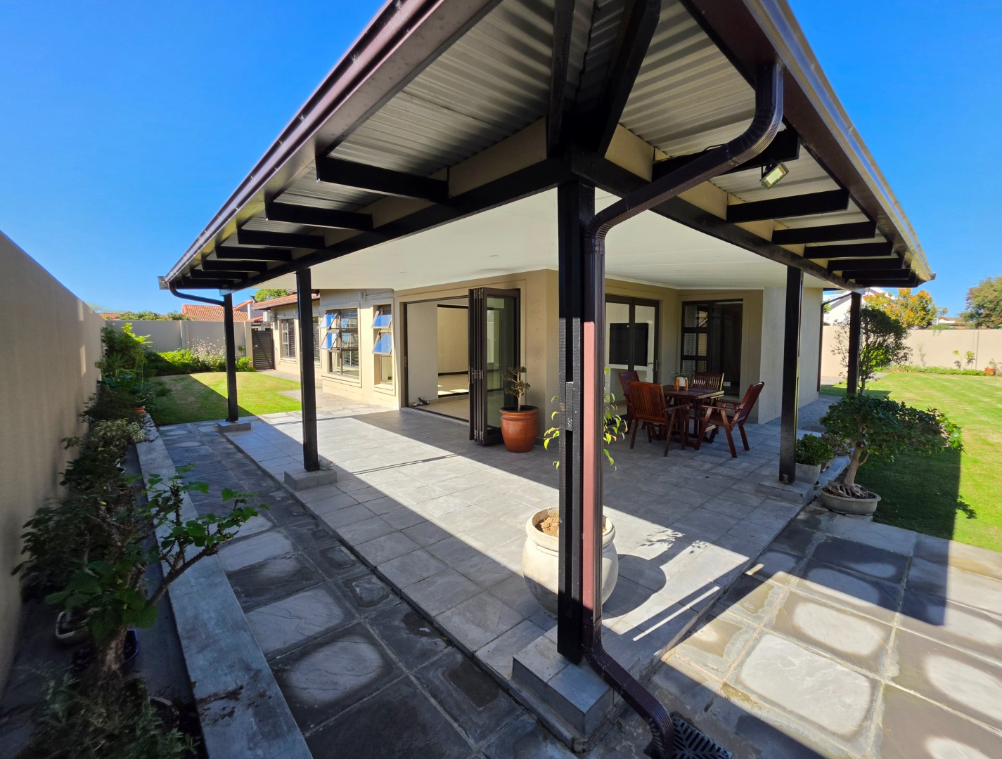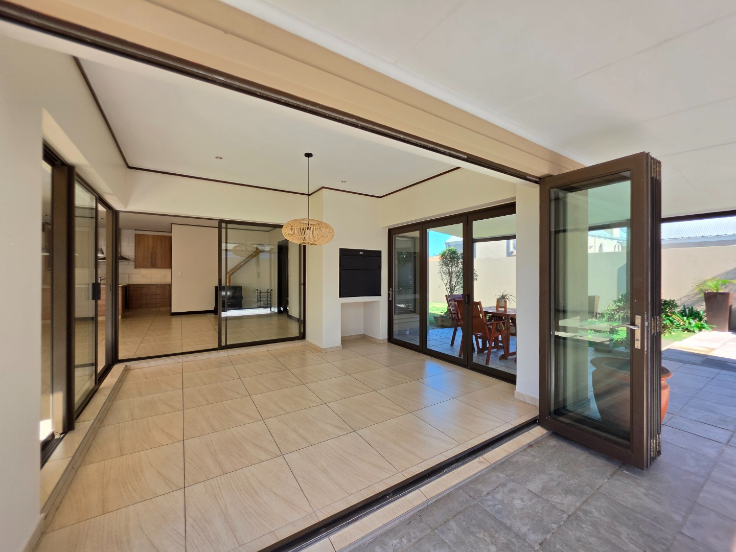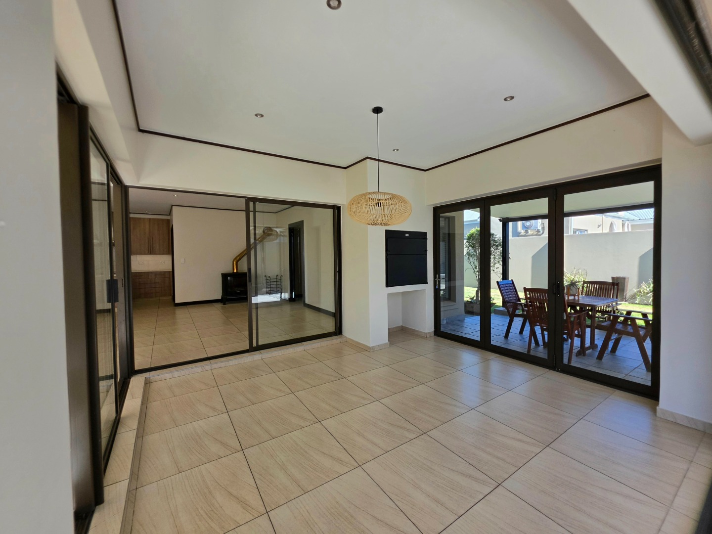 The Ultimate Haven: The cozy braai room features sliding doors on all four sides, opening completely to a wrap-around veranda.