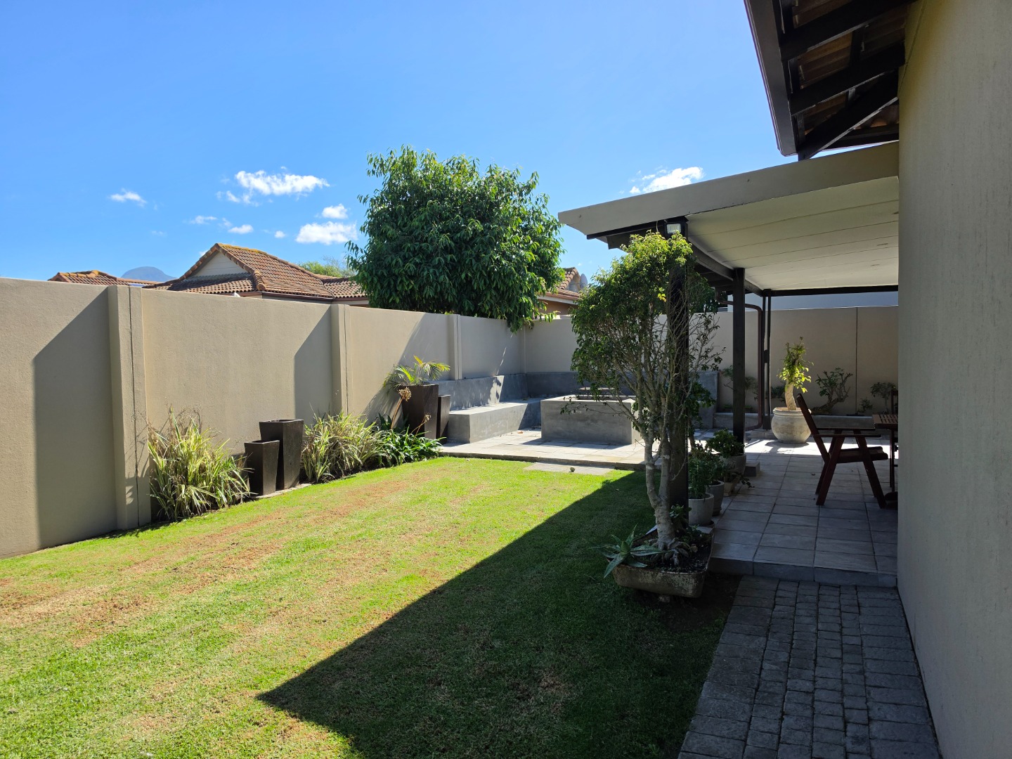 Outdoor Sanctuary: Step out into a landscaped, low-maintenance garden featuring a delightful entertainment area with benches and a firepit—the perfect backdrop for making memories under the stars.