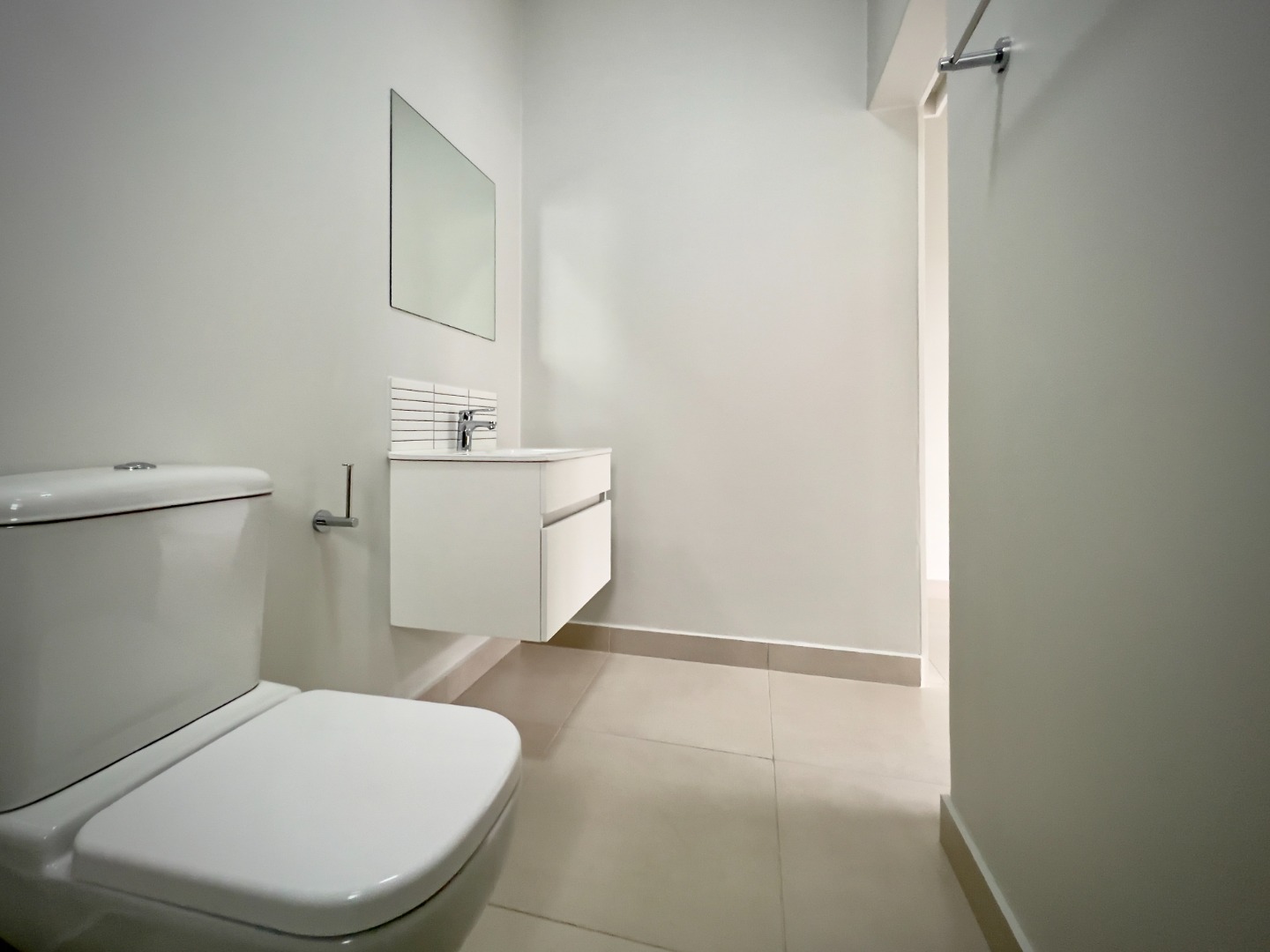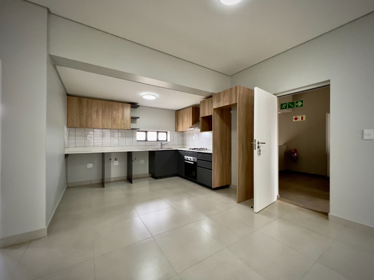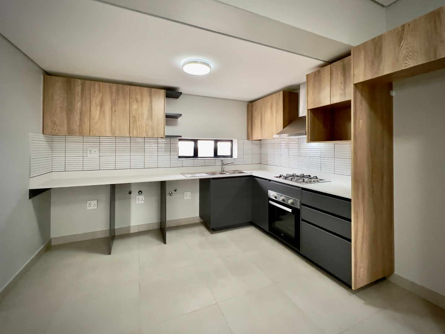 Spanning 112 square metres, this unfurnished unit features a modern, open-plan layout designed for comfortable living. The lounge area seamlessly connects to a contemporary kitchen, boasting two-tone wood-grain and dark grey cabinetry, light countertops, and a stylish subway tile backsplash. Equipped with a built-in oven and hob, the kitchen offers ample counter space and is well-lit, making it perfect for daily meal preparation.