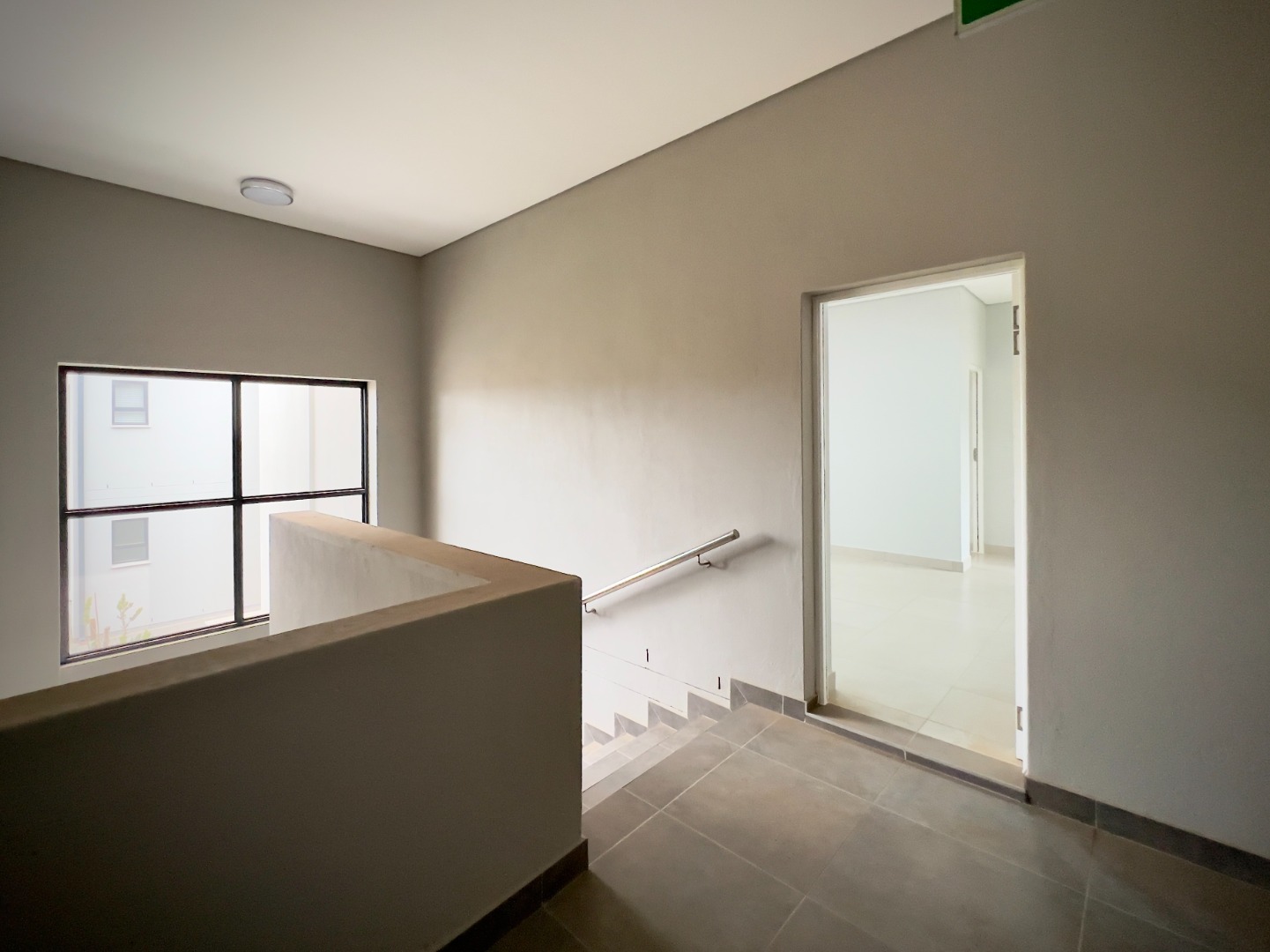The residence comprises two well-proportioned bedrooms and two bathrooms, providing privacy and convenience. Throughout the unit, neutral grey walls and large format tiled flooring create a clean, modern aesthetic that is easy to personalise. Natural light enhances various spaces, including the staircase landing, which features a sleek stainless steel handrail. This property is ideal for individuals or small families seeking a lock-up and go lifestyle within a vibrant estate setting.