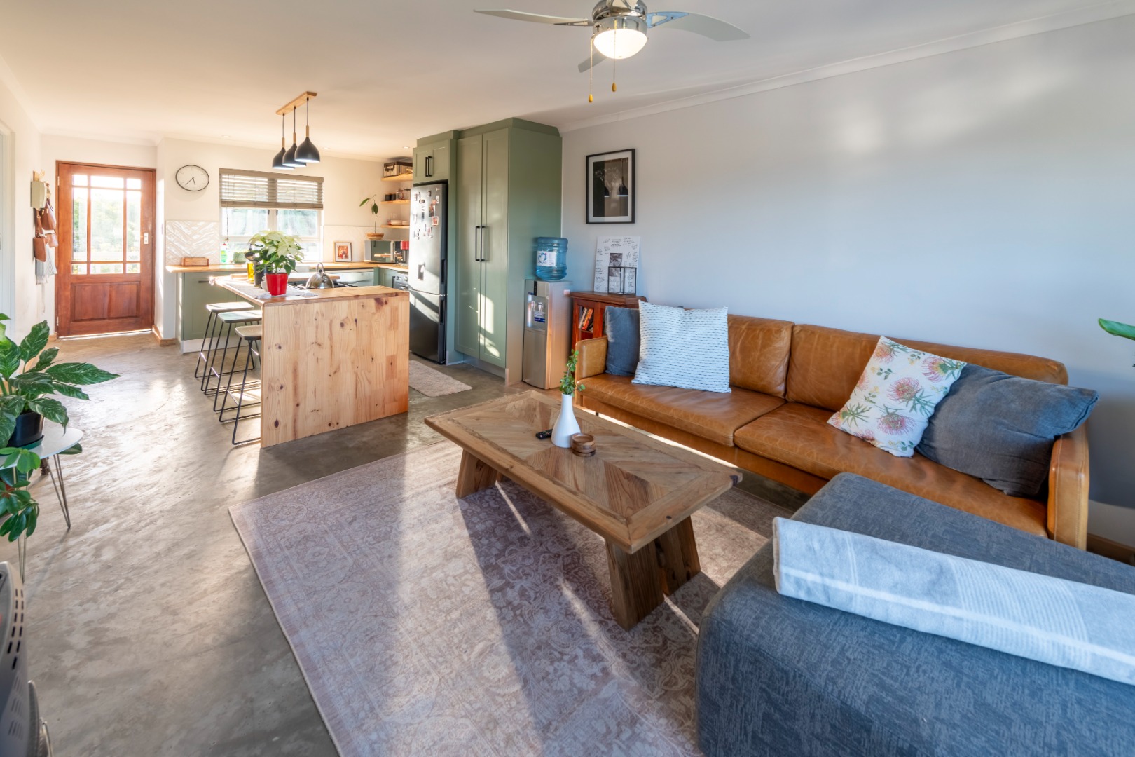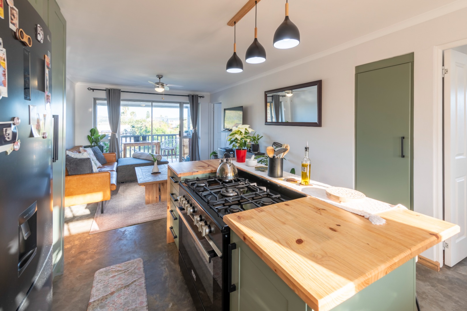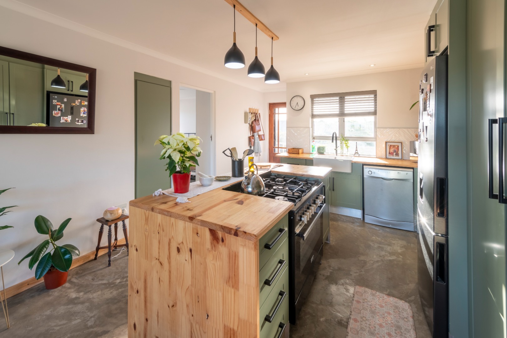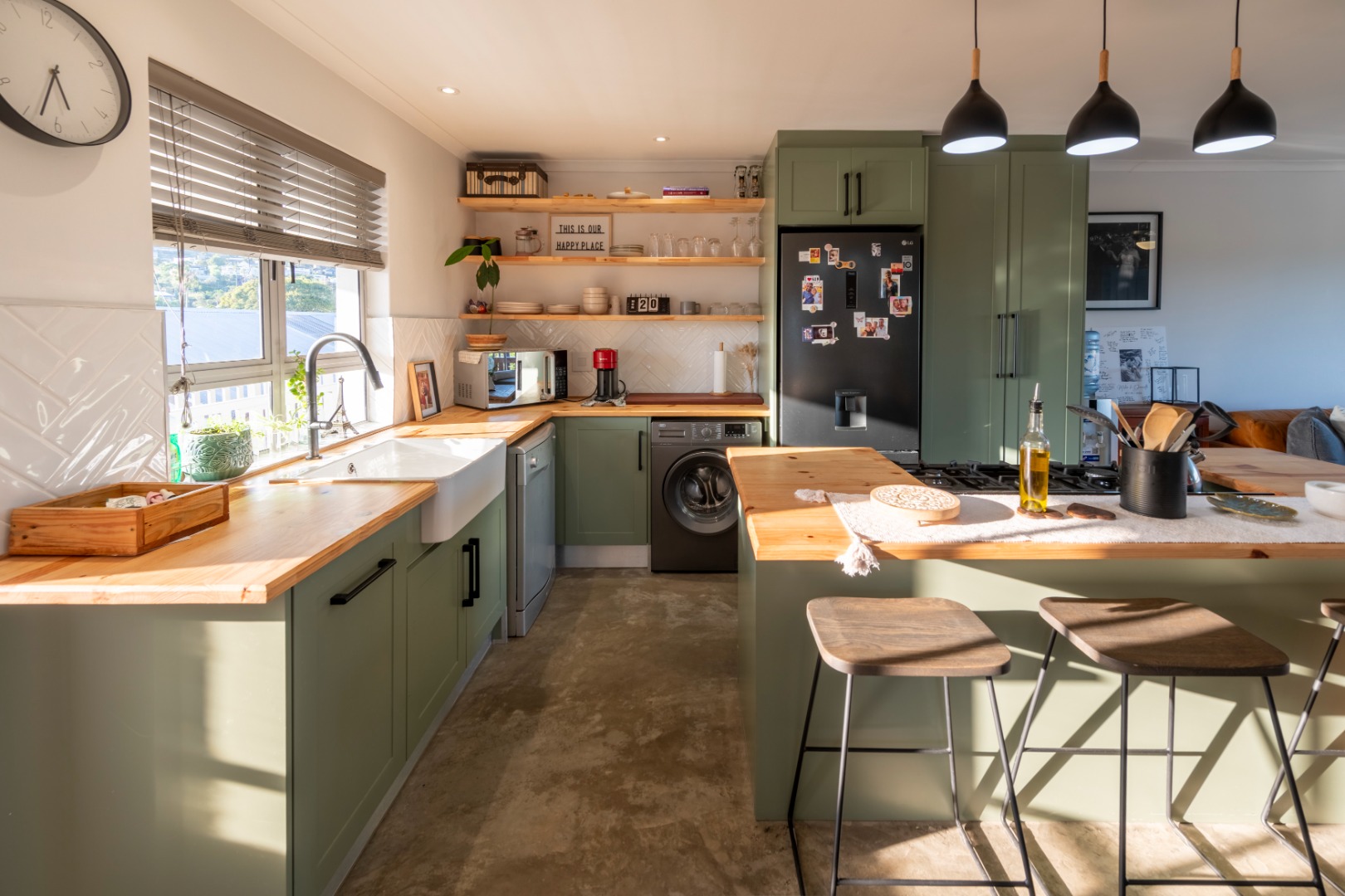 The modern kitchen features stylish sage green cabinetry, warm wooden countertops, a gas hob, and a large farmhouse sink. Contemporary concrete-style flooring runs throughout the apartment, adding a sleek finish and making maintenance easy.