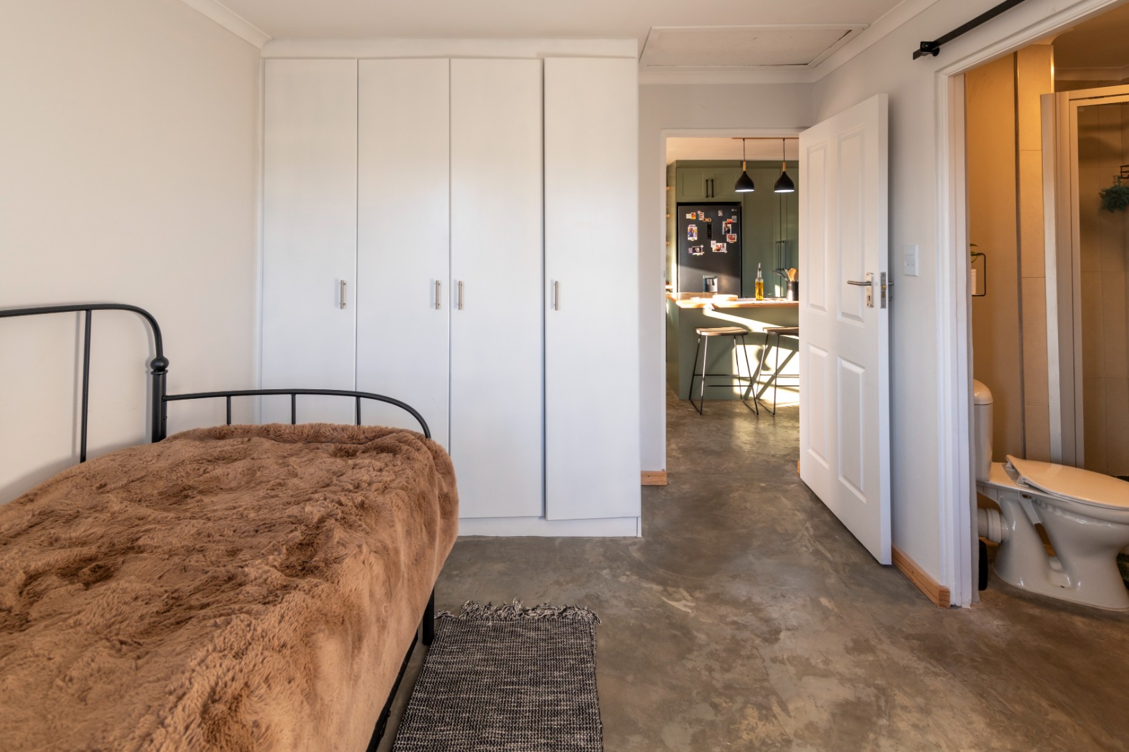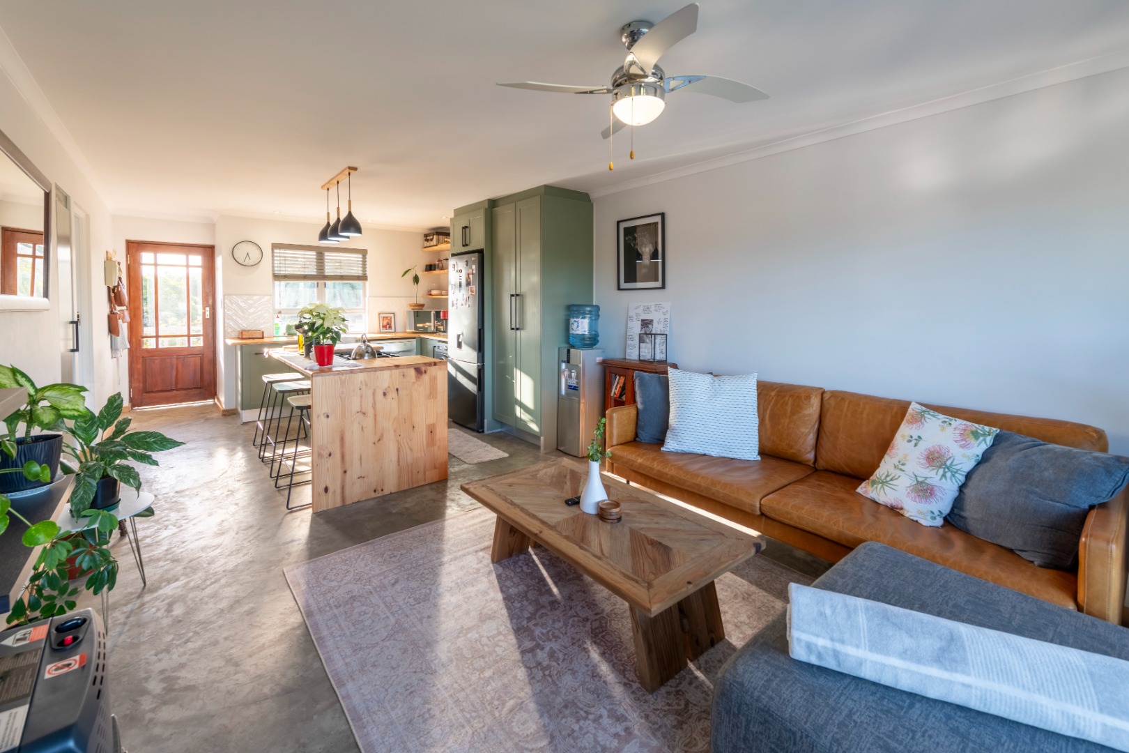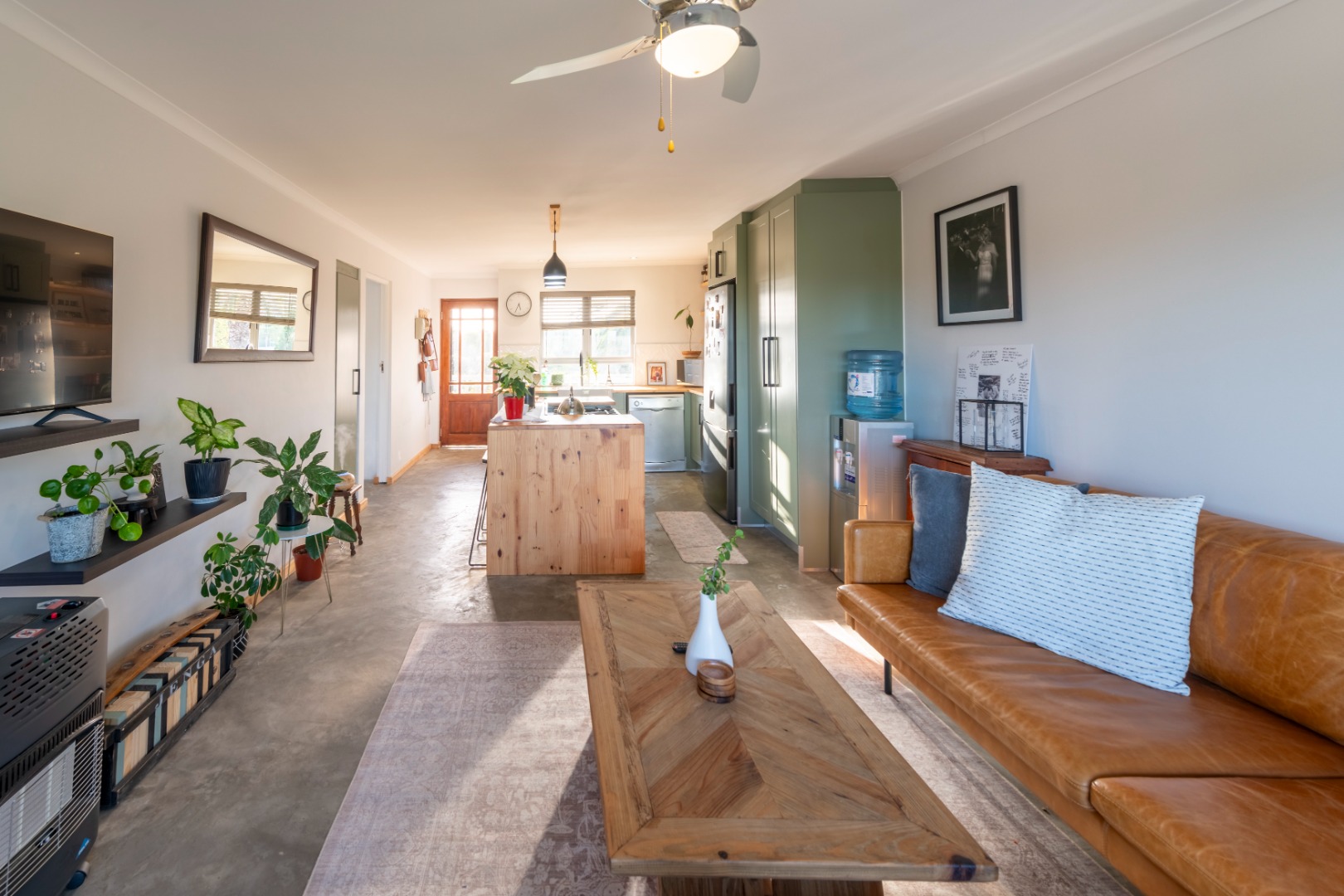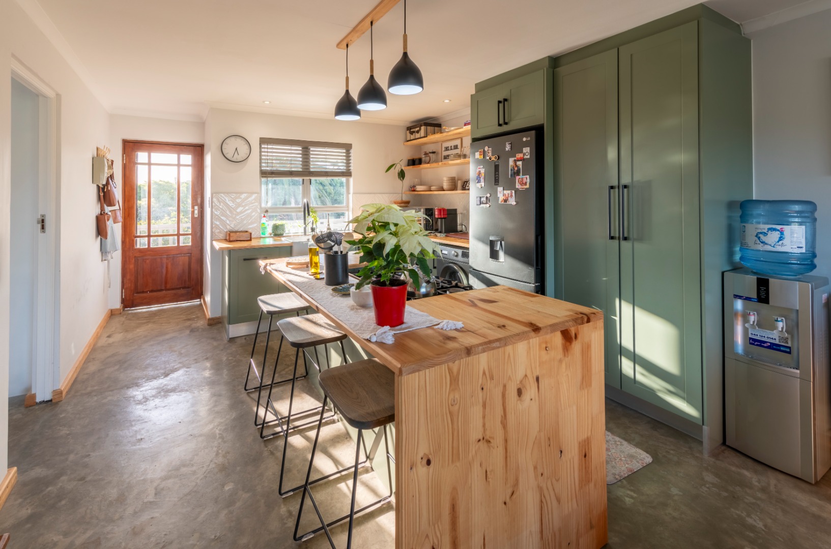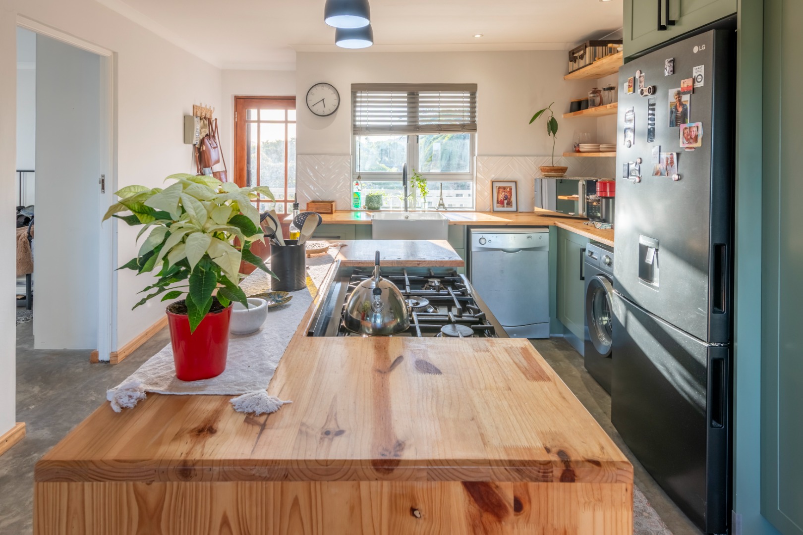 The modern kitchen features stylish sage green cabinetry, warm wooden countertops, a gas hob, and a large farmhouse sink. Contemporary concrete-style flooring runs throughout the apartment, adding a sleek finish and making maintenance easy.