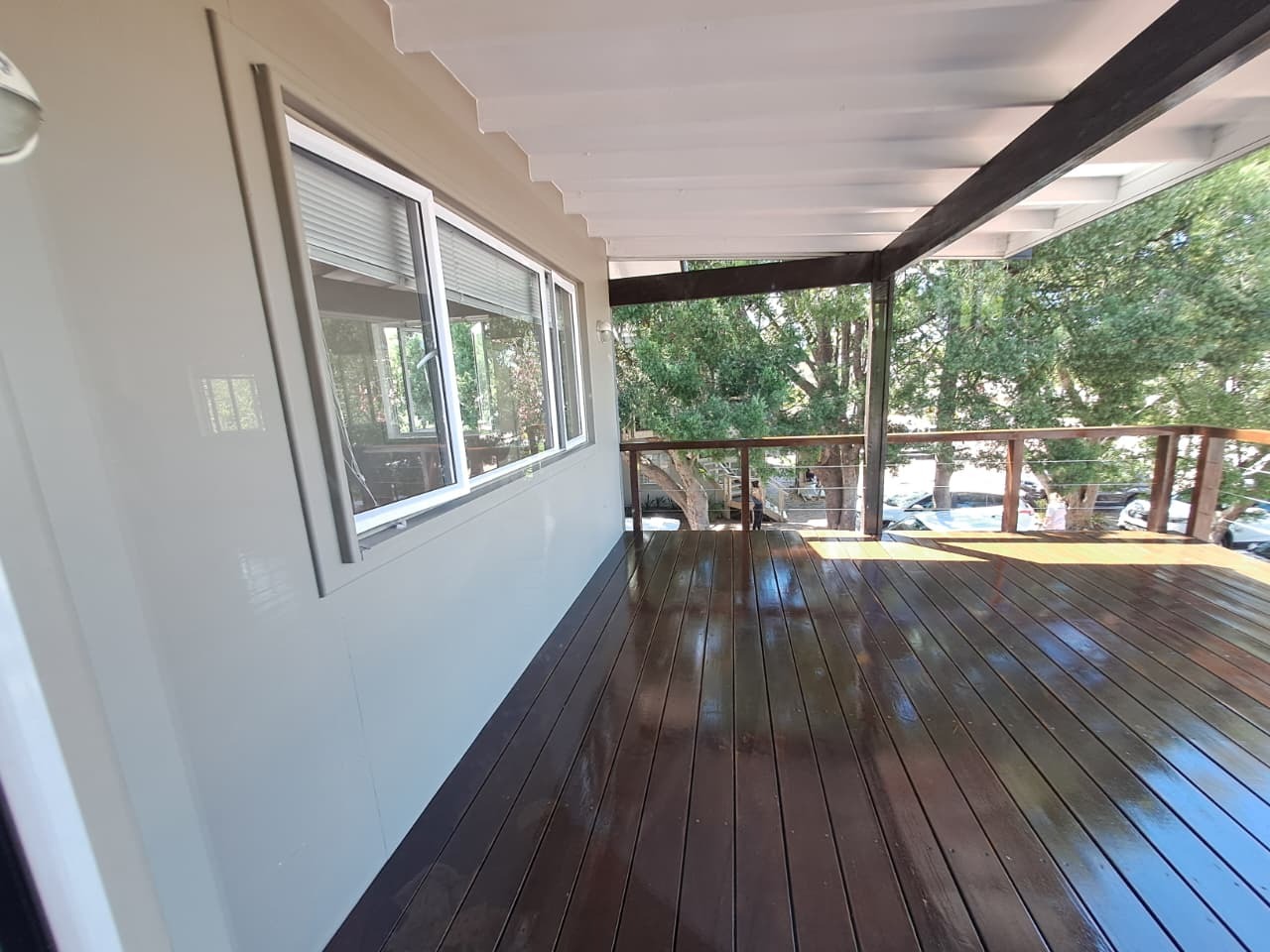Step outside to a welcoming outdoor wooden deck or balcony area, providing an elevated vantage point with scenic views of mature green trees and the vibrant surroundings.