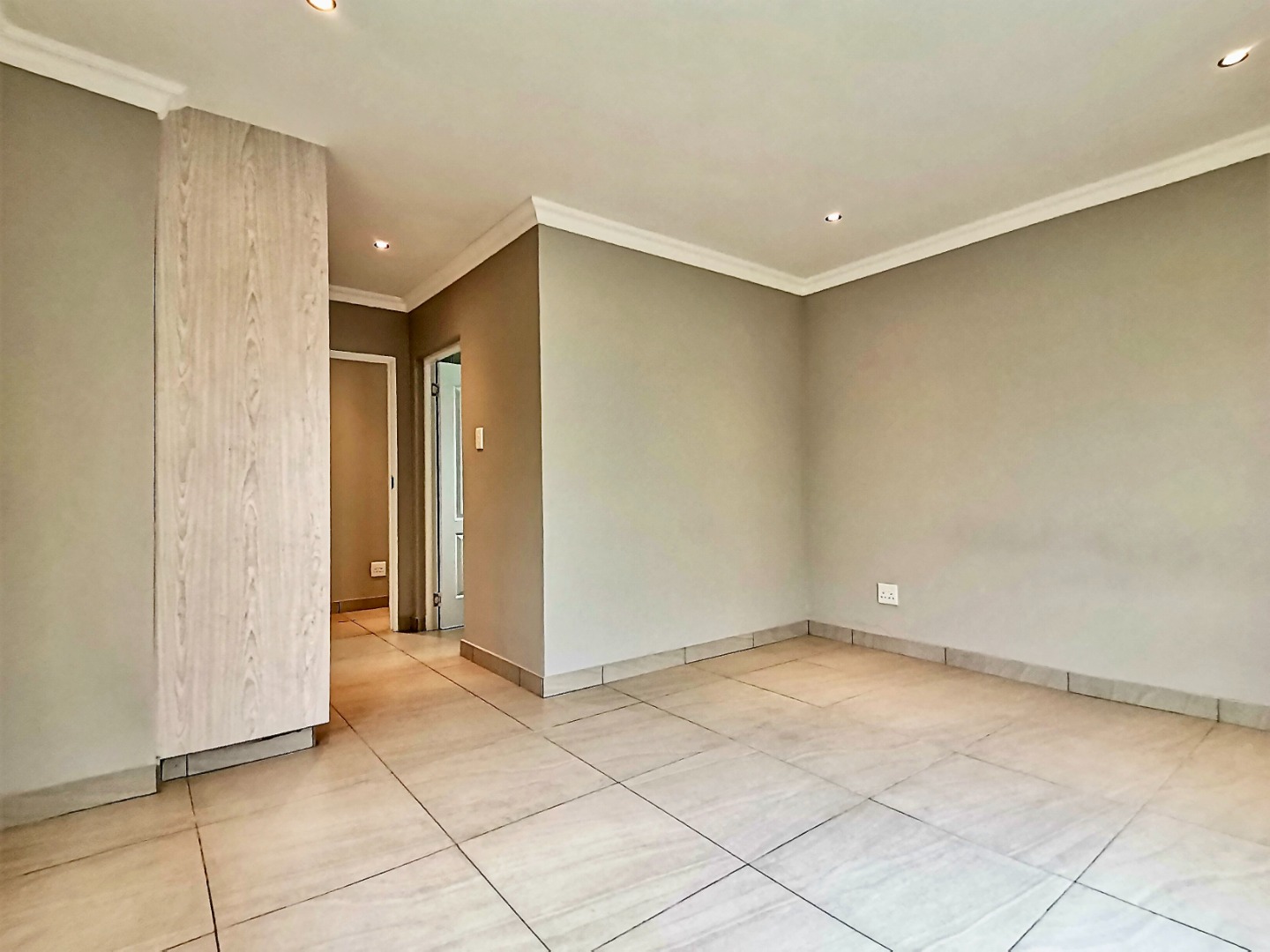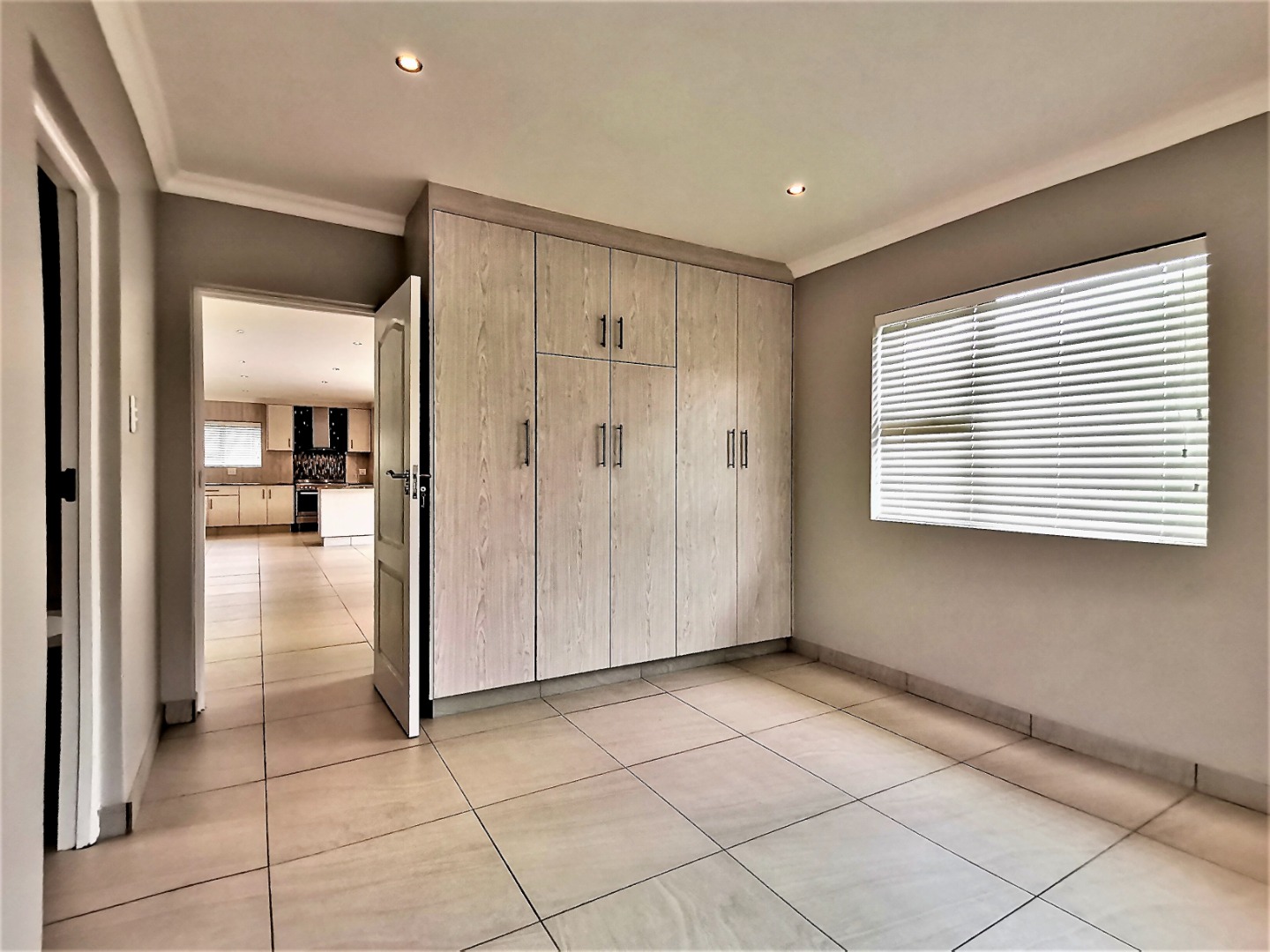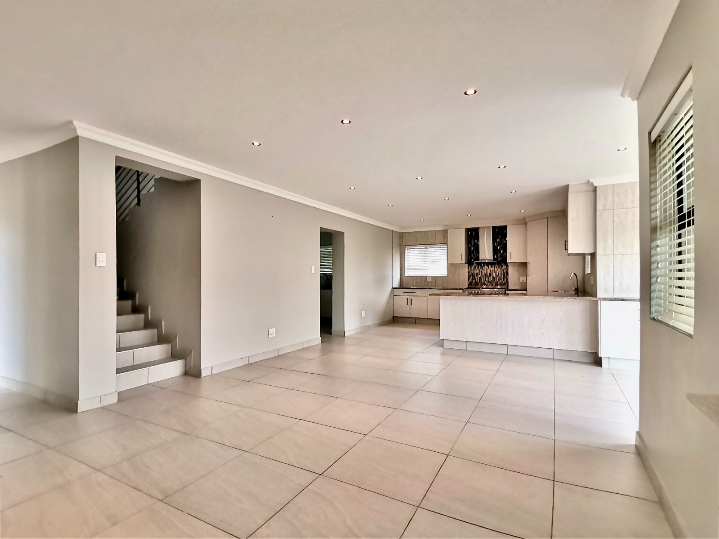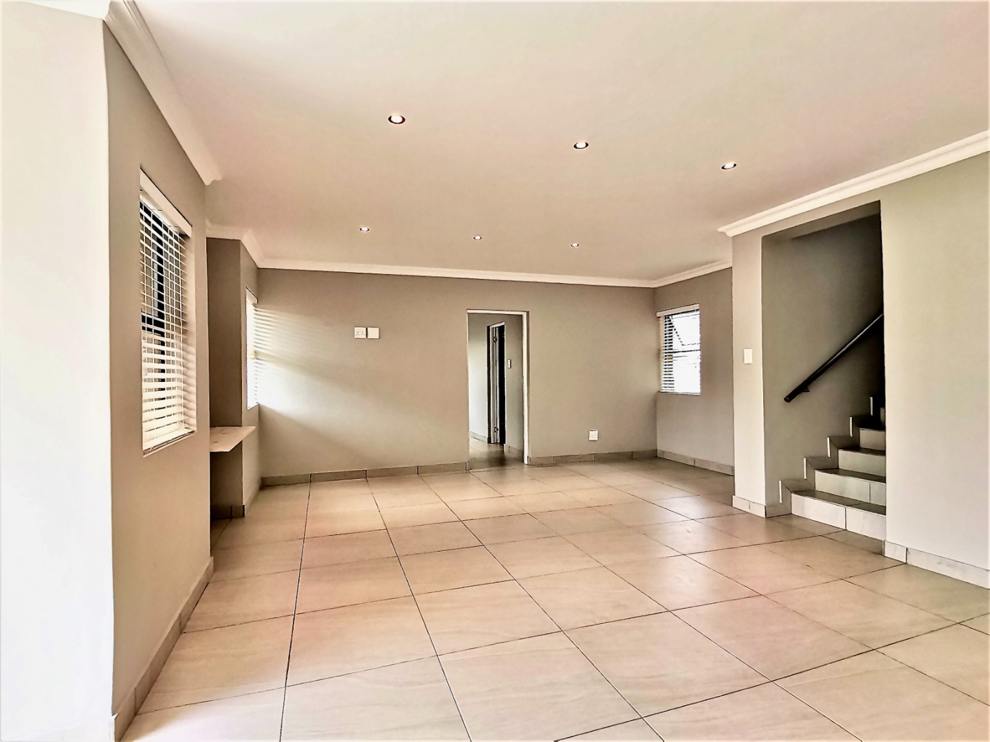 Inside, an expansive 231 sqm of thoughtfully designed living space awaits, characterised by an open-plan layout, light grey walls, and elegant coloured tiled flooring throughout. Recessed lighting and crown molding add a contemporary touch.