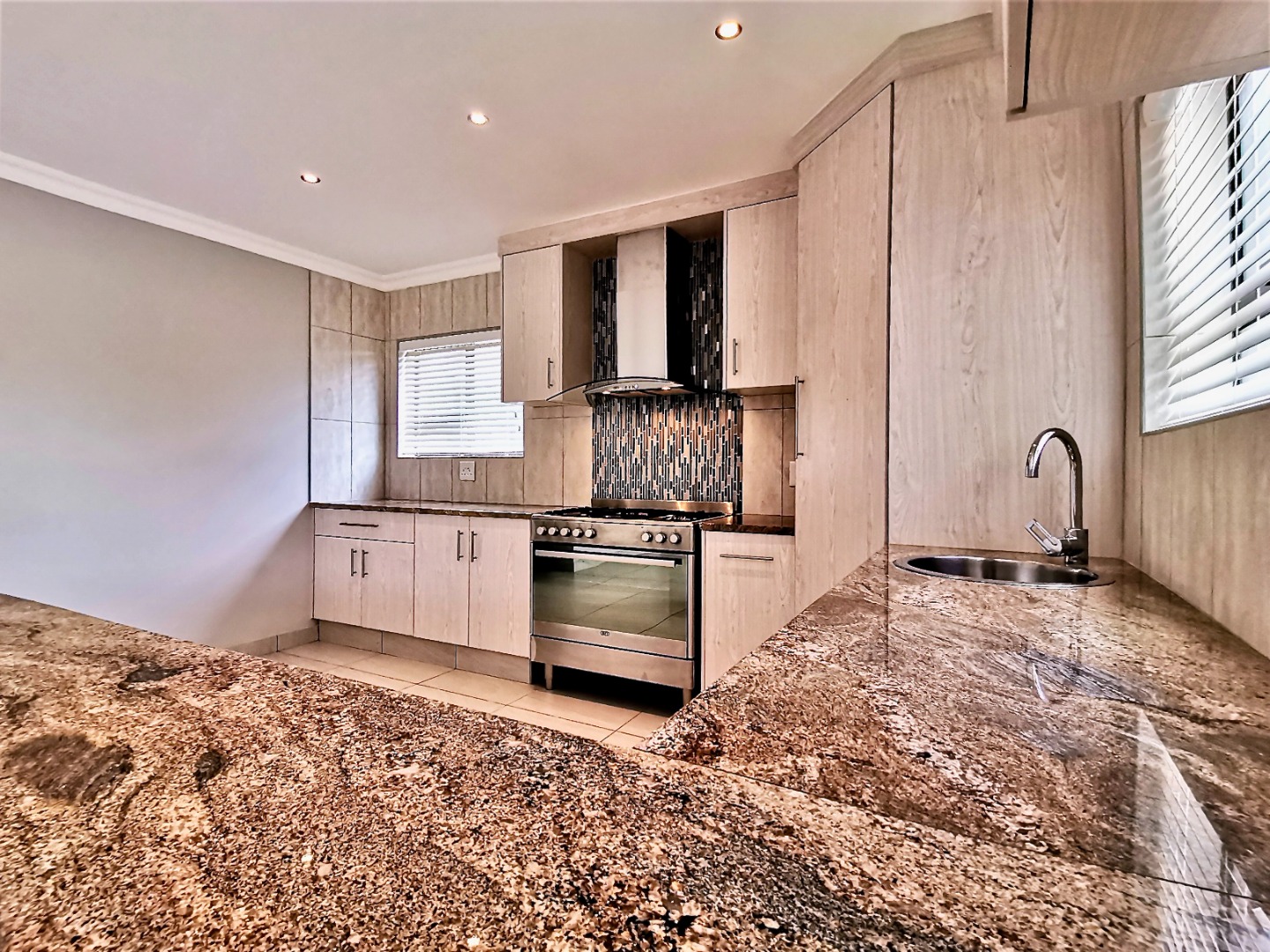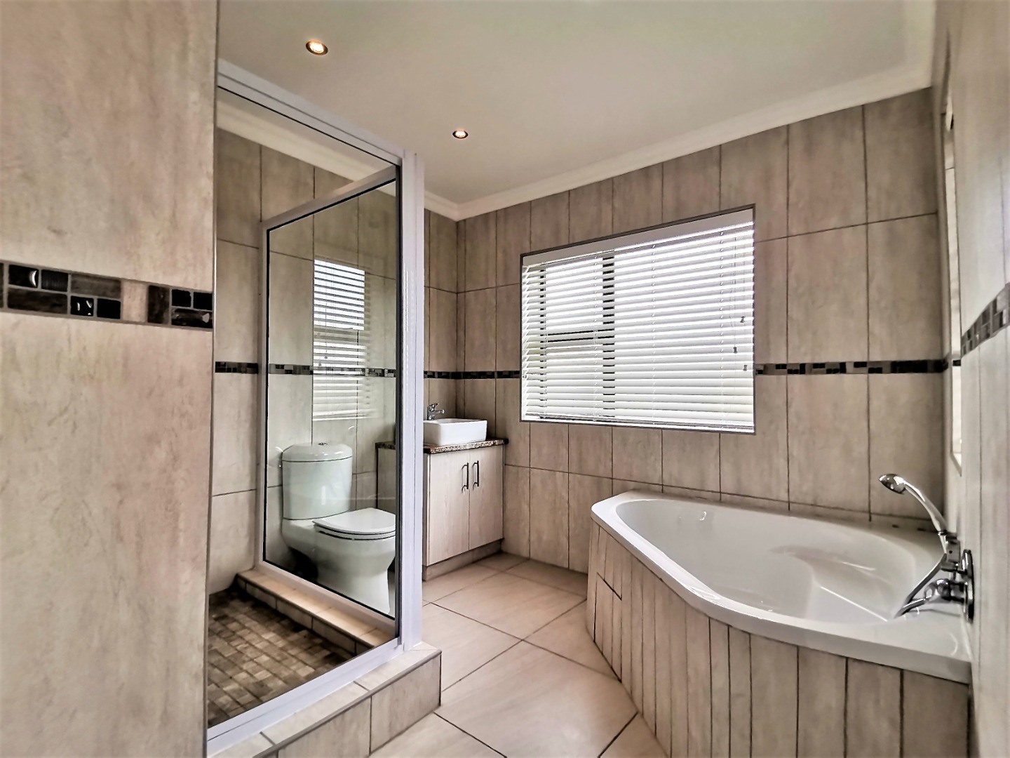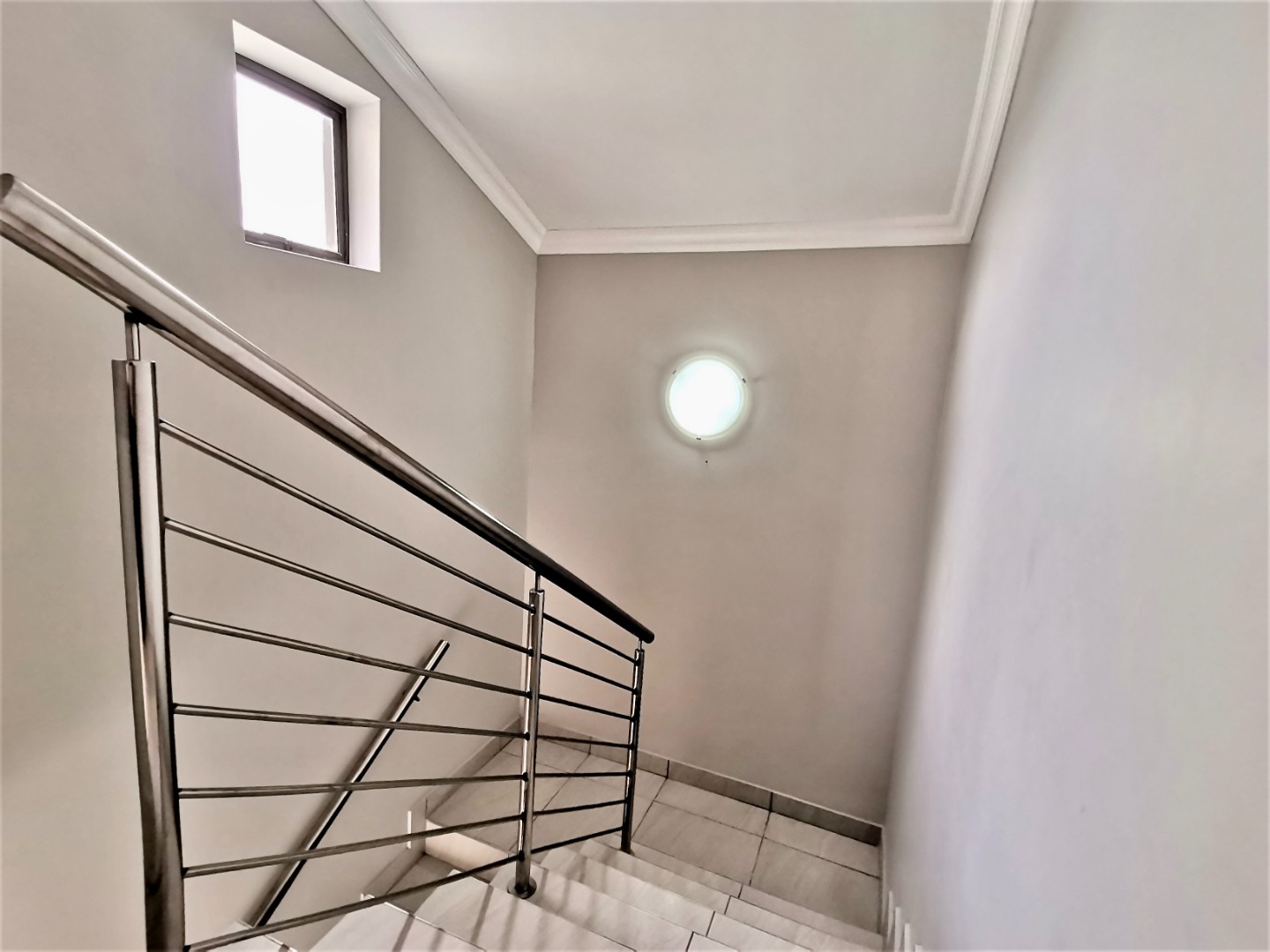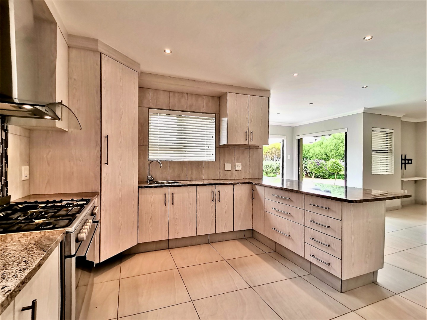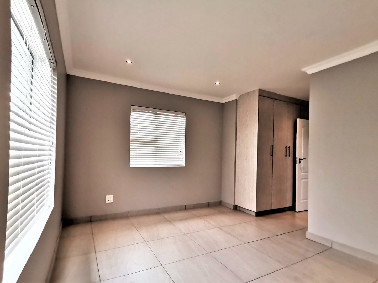 Inside, an expansive 231 sqm of thoughtfully designed living space awaits, characterised by an open-plan layout, light grey walls, and elegant coloured tiled flooring throughout. Recessed lighting and crown molding add a contemporary touch.