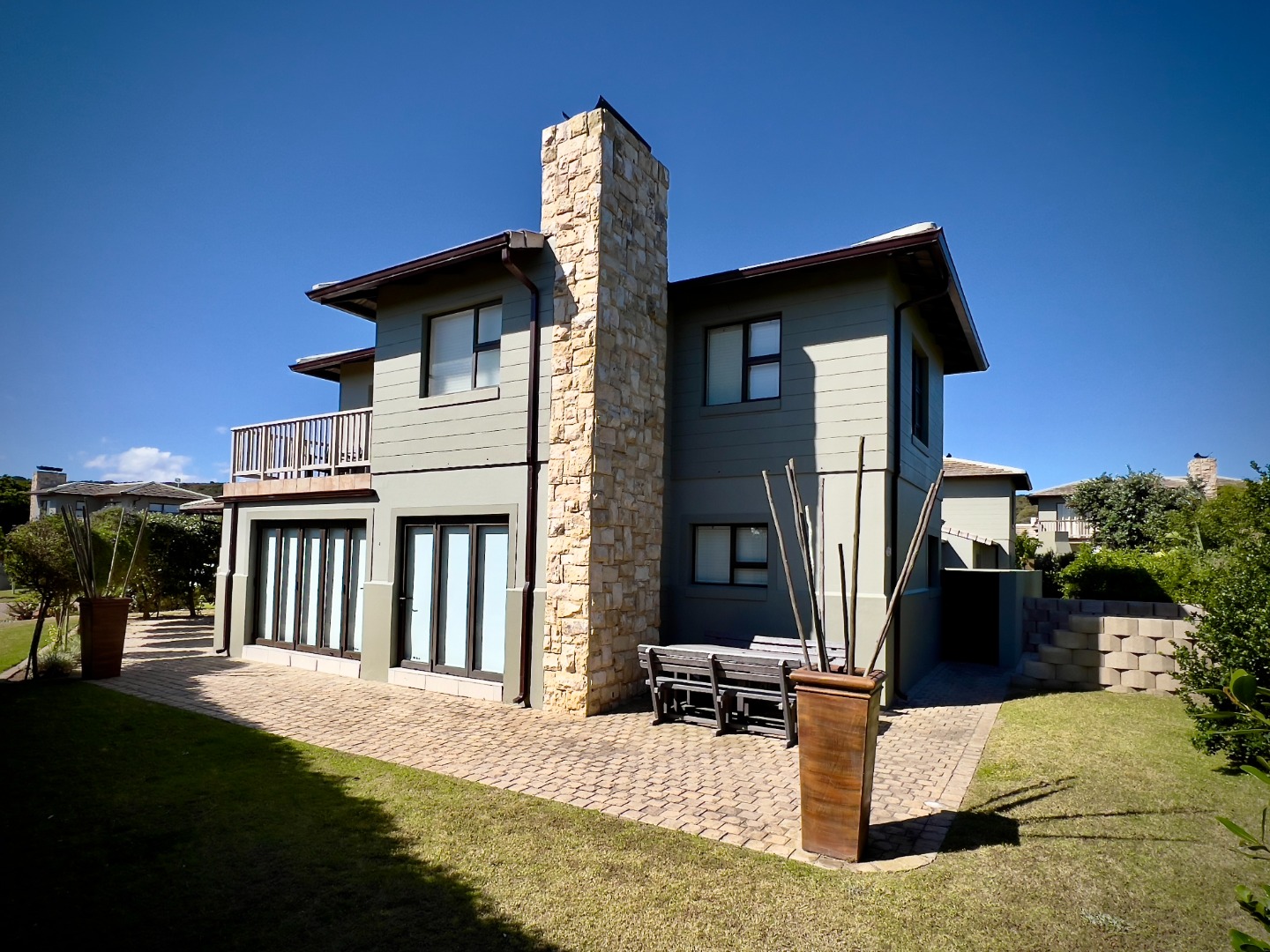 This eco-estate property with private beach access is equipped with solar panels, a battery inverter, solar and gas geysers, and fibre connectivity, promoting sustainable living within a secure environment featuring 24-hour security, CCTV, electric fencing, and an access gate with 24 -hour manned security.
