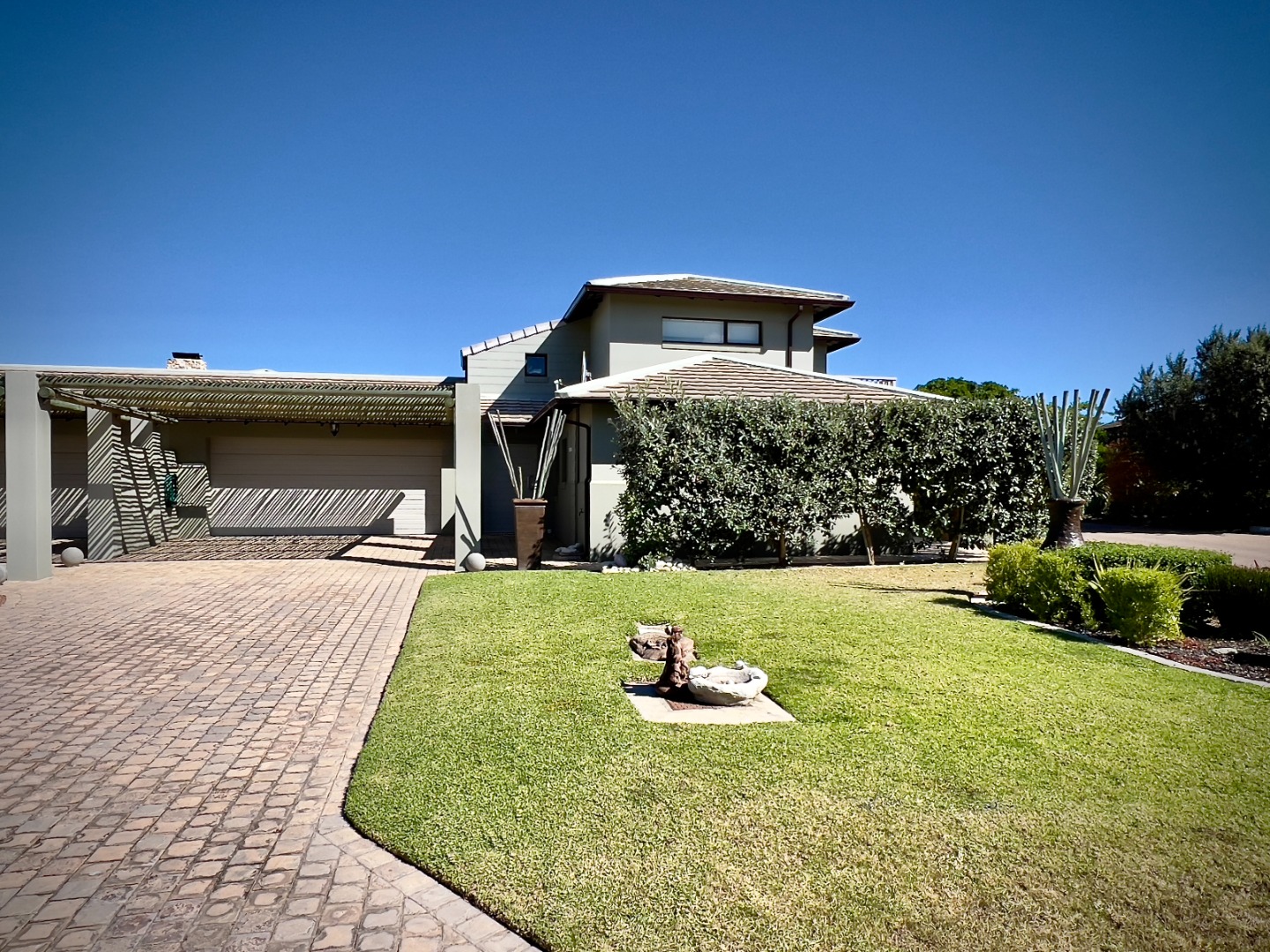 Discover this modern architectural gem nestled within the sought-after Hartenbos Landgoed, Hartenbos. This striking multi-level residence boasts a contemporary design with a neutral Olive exterior, natural stone accents, and a tiled roof, creating an inviting first impression. The property features a meticulously maintained front lawn, a paved driveway leading to an integrated carport, and a double garage.