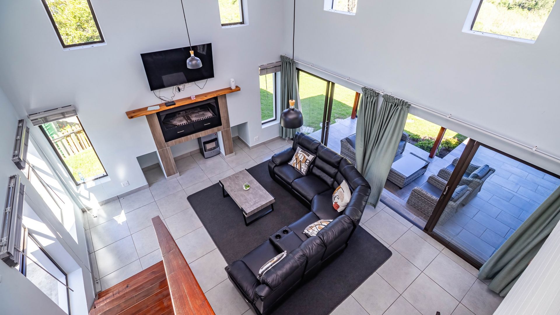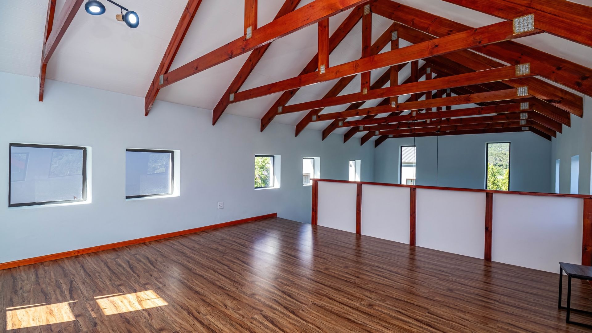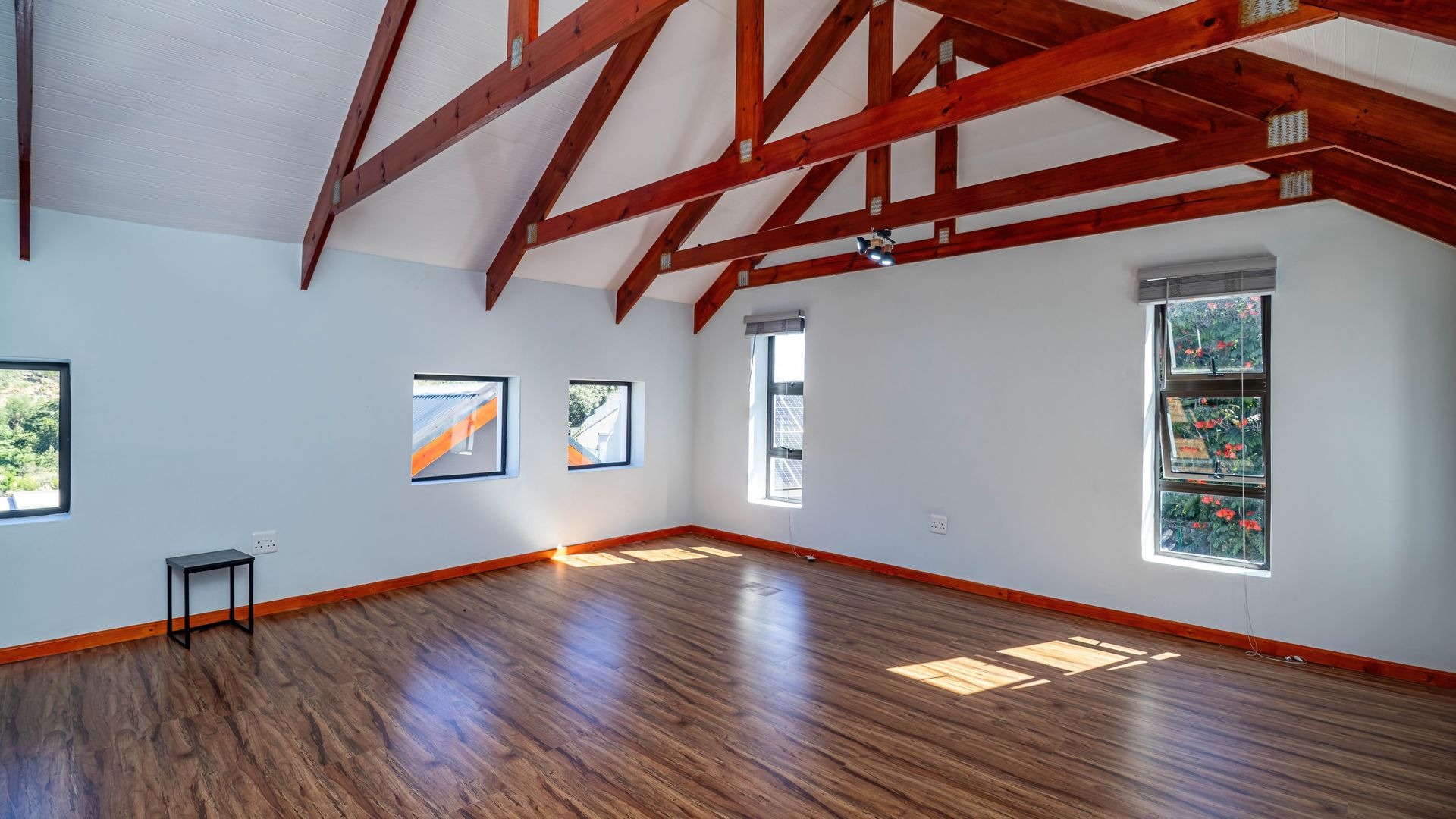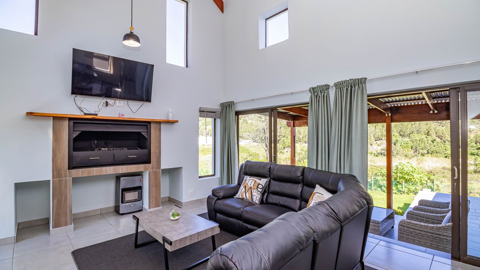 Step inside to discover a spacious, open-plan layout designed for modern living. The interior boasts striking high vaulted ceilings with exposed wooden beams and trusses, creating an airy and expansive atmosphere. Abundant natural light floods the living spaces through numerous large windows and sliding glass doors, enhancing the clean aesthetic of the light grey tiled flooring. A prominent wooden staircase adds architectural interest, while an integrated fireplace and built-in braai provide warmth and entertainment options for the lounge and dining areas.