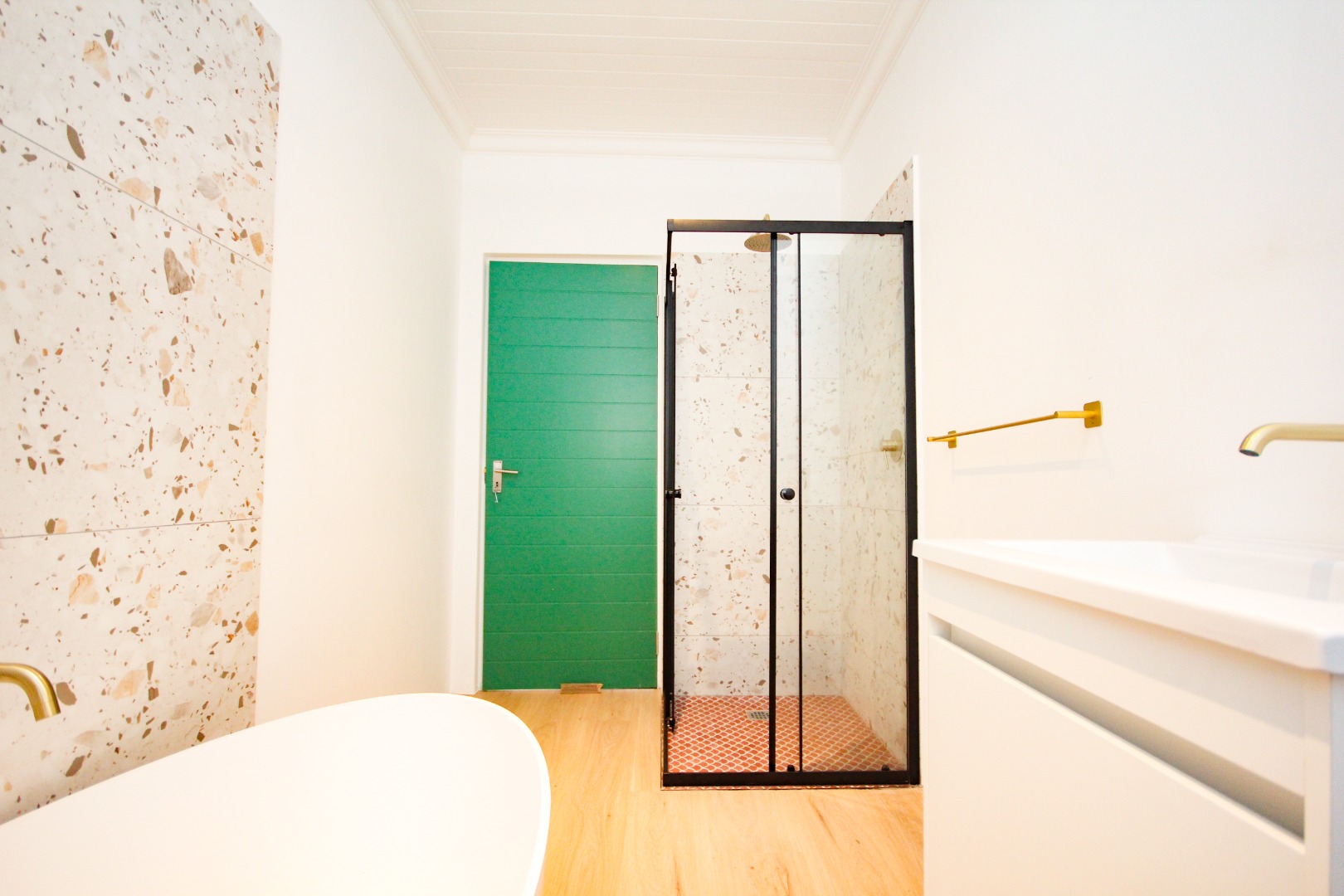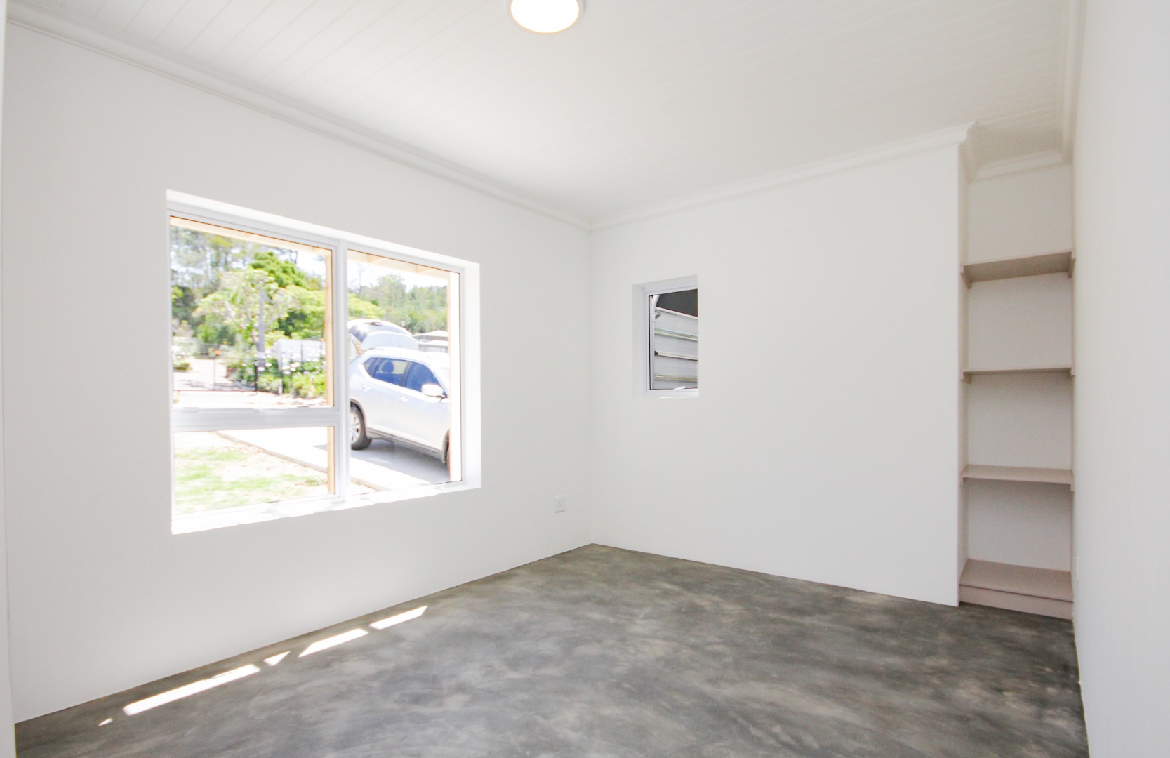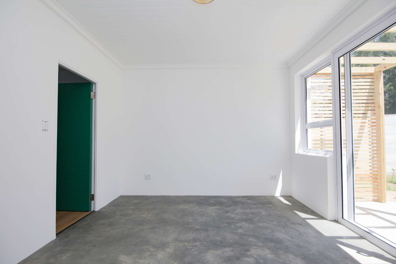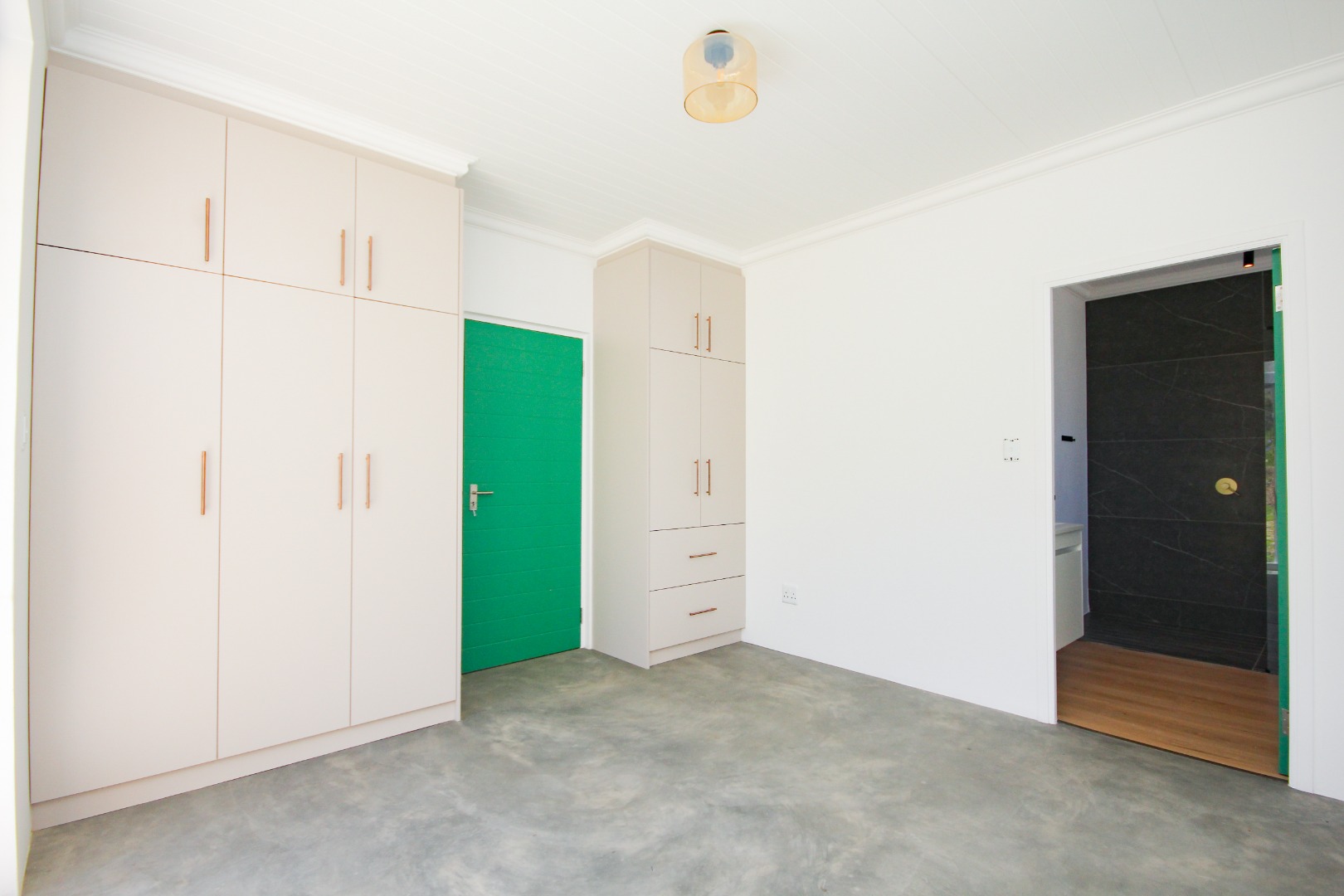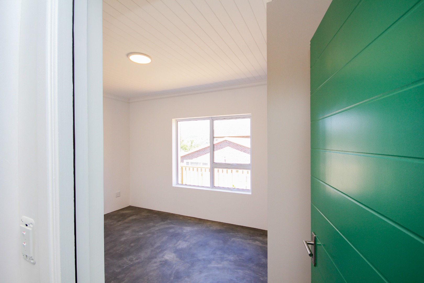 The three well-proportioned bedrooms provide comfortable retreats, each featuring clean white walls and continuing the contemporary polished concrete floors. Built-in wardrobes offer ample storage, while the two modern bathrooms are finished to a high standard. Distinctive, vibrant doors add a touch of character and personality to the interior spaces.