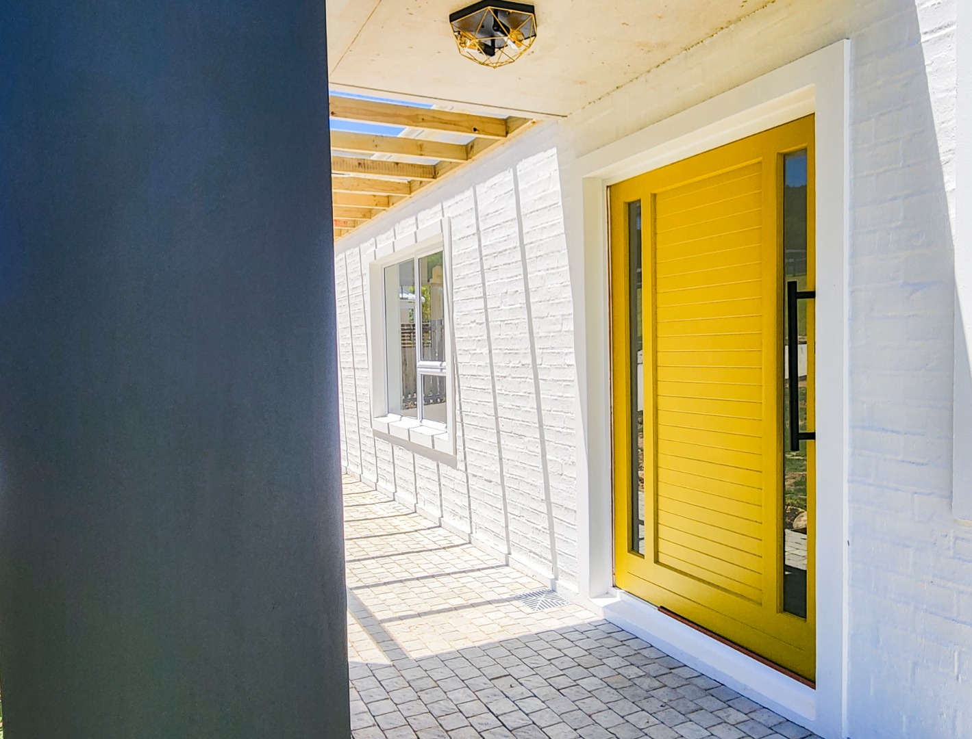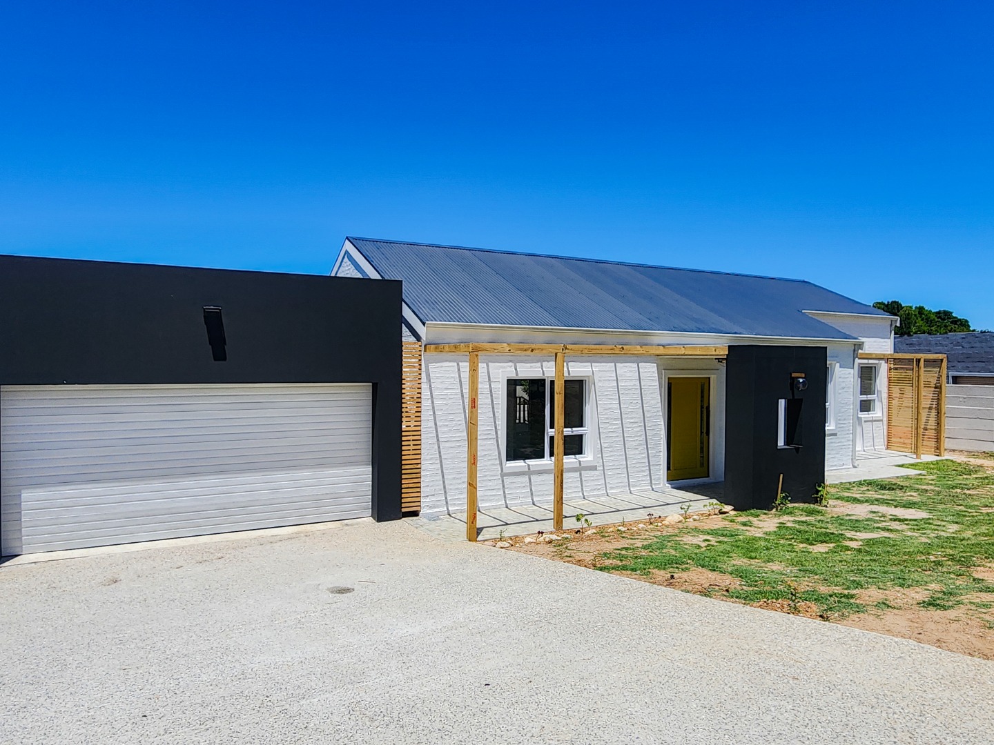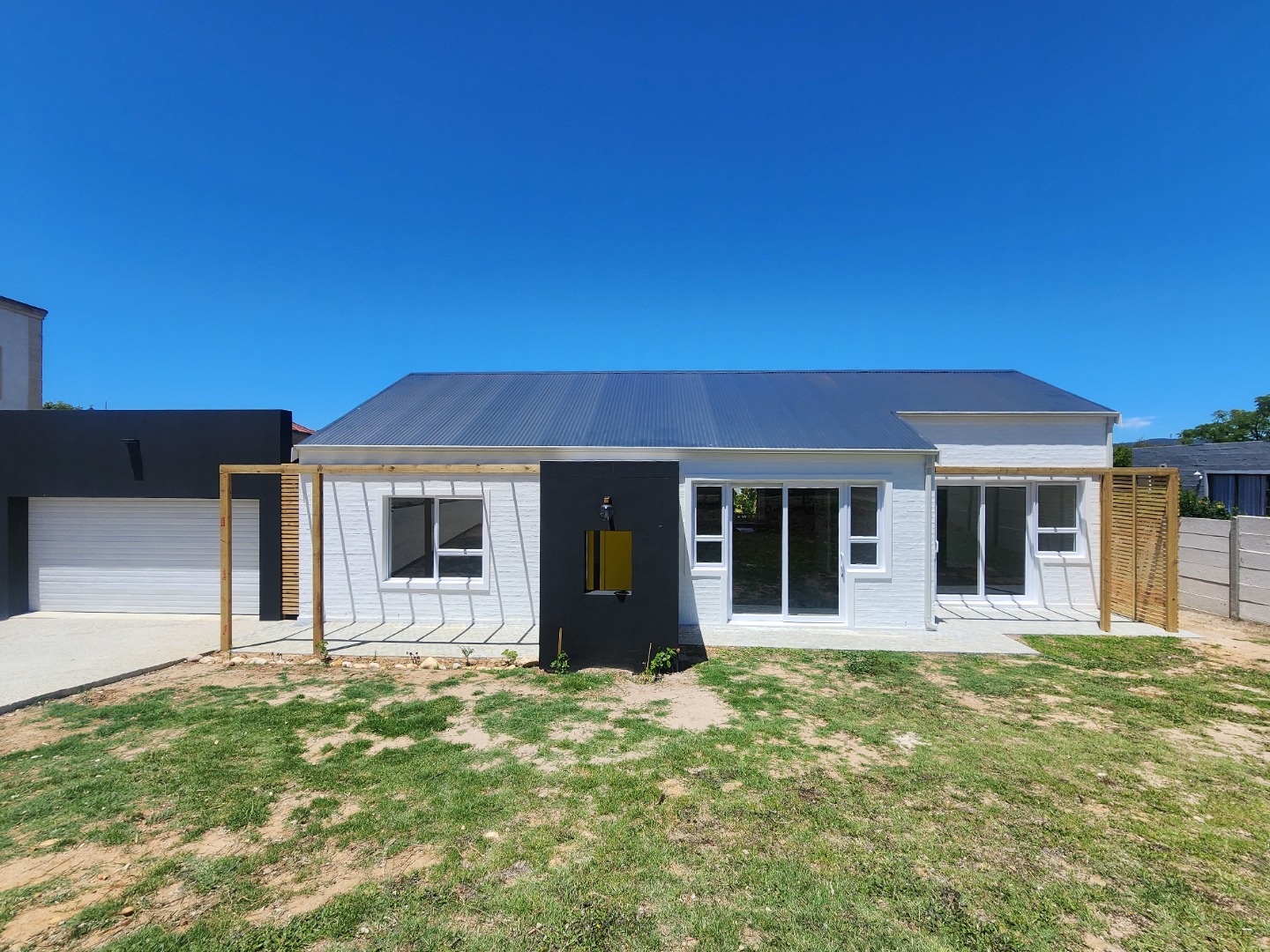 Discover modern coastal living in this newly built 3-bedroom, 2-bathroom residence located in the desirable Hunters Estate, Knysna. This home immediately impresses with its contemporary architectural design, featuring a crisp white brick facade complemented by striking black accents and golden hardware. Large sliding glass doors and elegant wooden pergola structures enhance its kerb appeal, hinting at the stylish interiors within.
