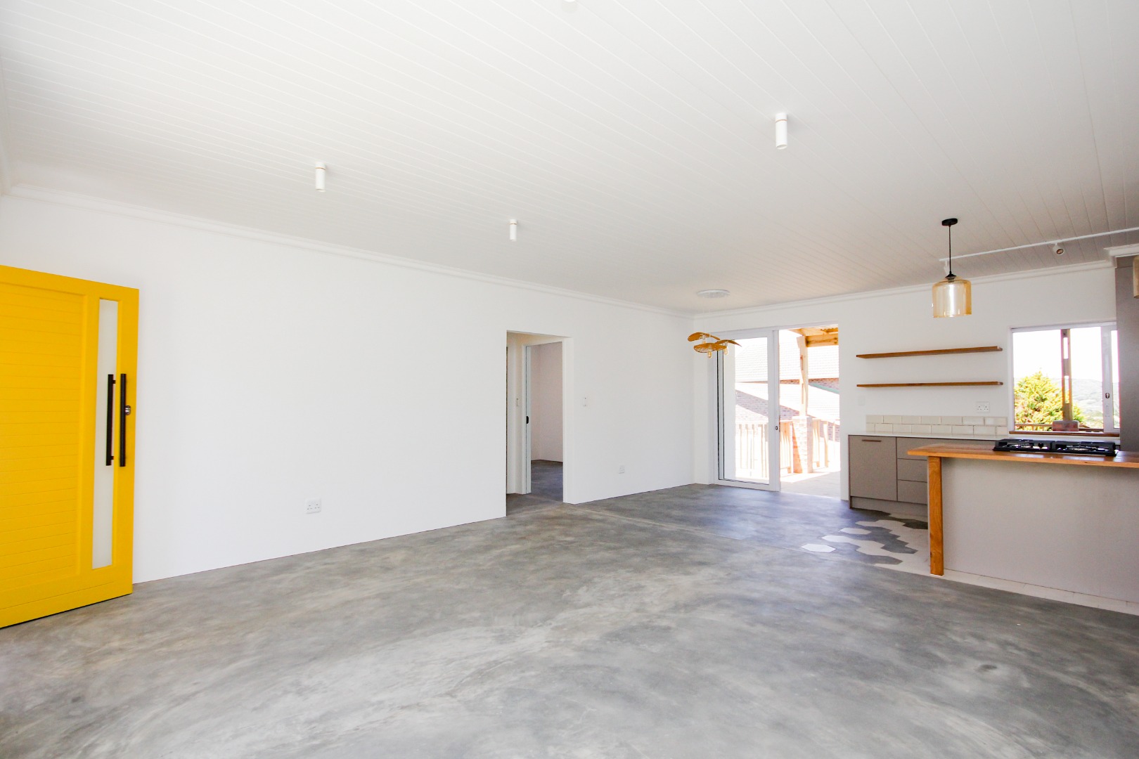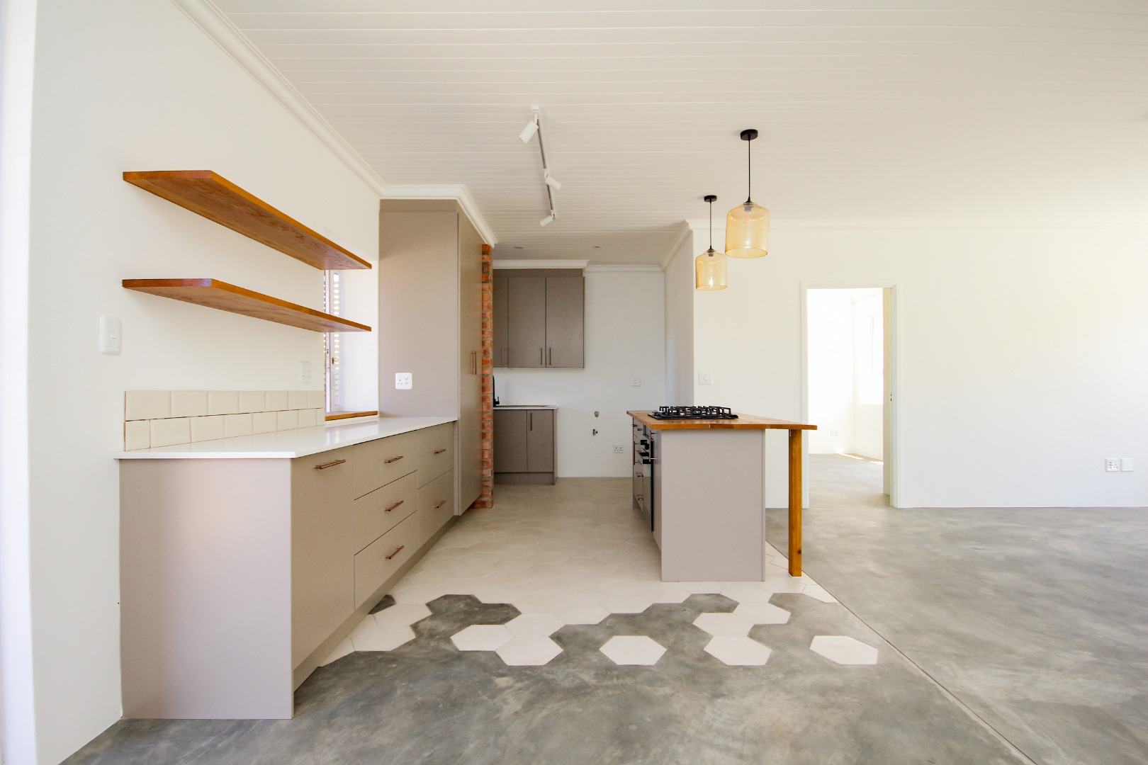Step inside to an open-plan living area, bathed in natural light, where polished concrete flooring flows seamlessly throughout. The heart of the home is a sleek, modern kitchen equipped with stylish grey cabinetry, a central island featuring an integrated gas hob and oven, and unique amber pendant lighting. This space is designed for both everyday living and entertaining, offering a seamless connection to the outdoor areas.