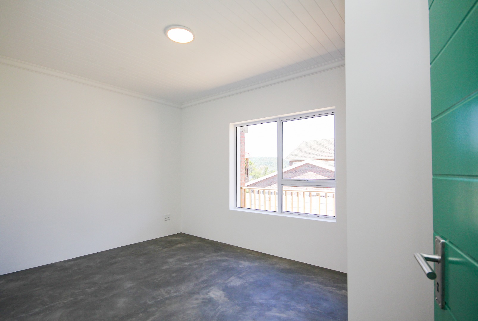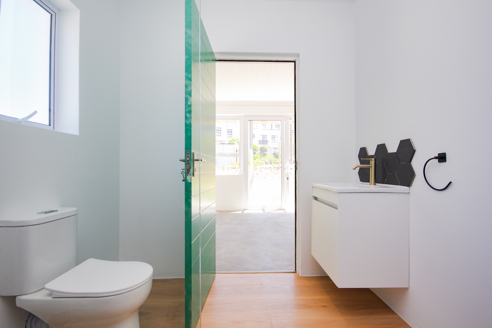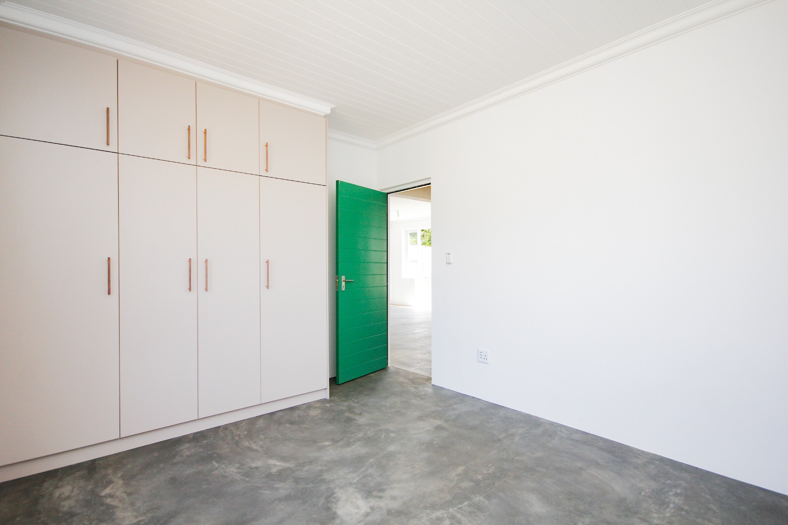 The three well-proportioned bedrooms provide comfortable retreats, each featuring clean white walls and continuing the contemporary polished concrete floors. Built-in wardrobes offer ample storage, while the two modern bathrooms are finished to a high standard. Distinctive, vibrant doors add a touch of character and personality to the interior spaces.