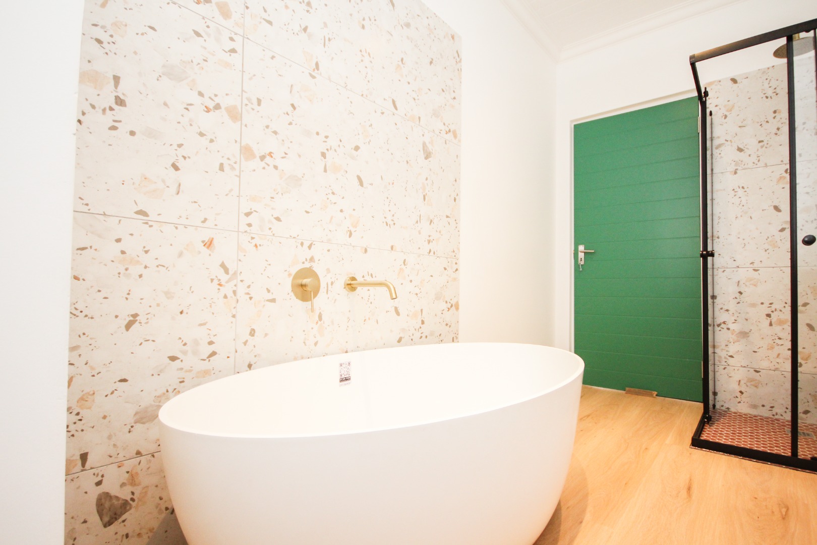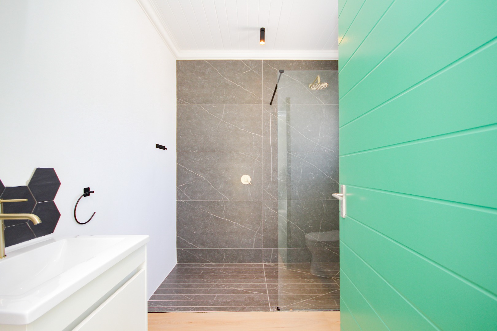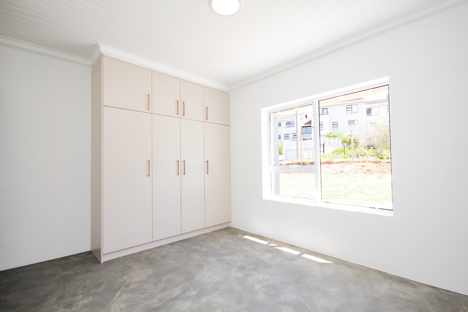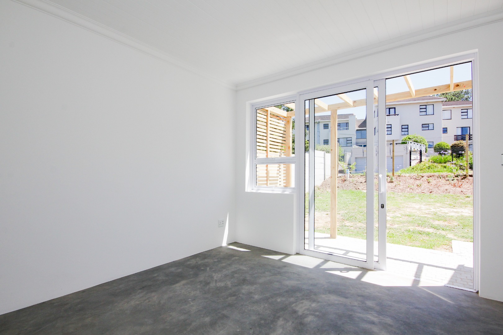 The three well-proportioned bedrooms provide comfortable retreats, each featuring clean white walls and continuing the contemporary polished concrete floors. Built-in wardrobes offer ample storage, while the two modern bathrooms are finished to a high standard. Distinctive, vibrant doors add a touch of character and personality to the interior spaces.