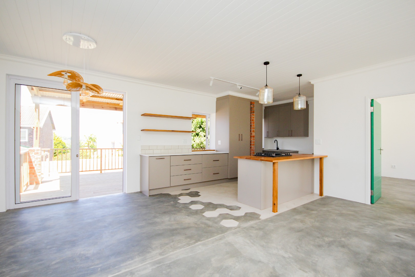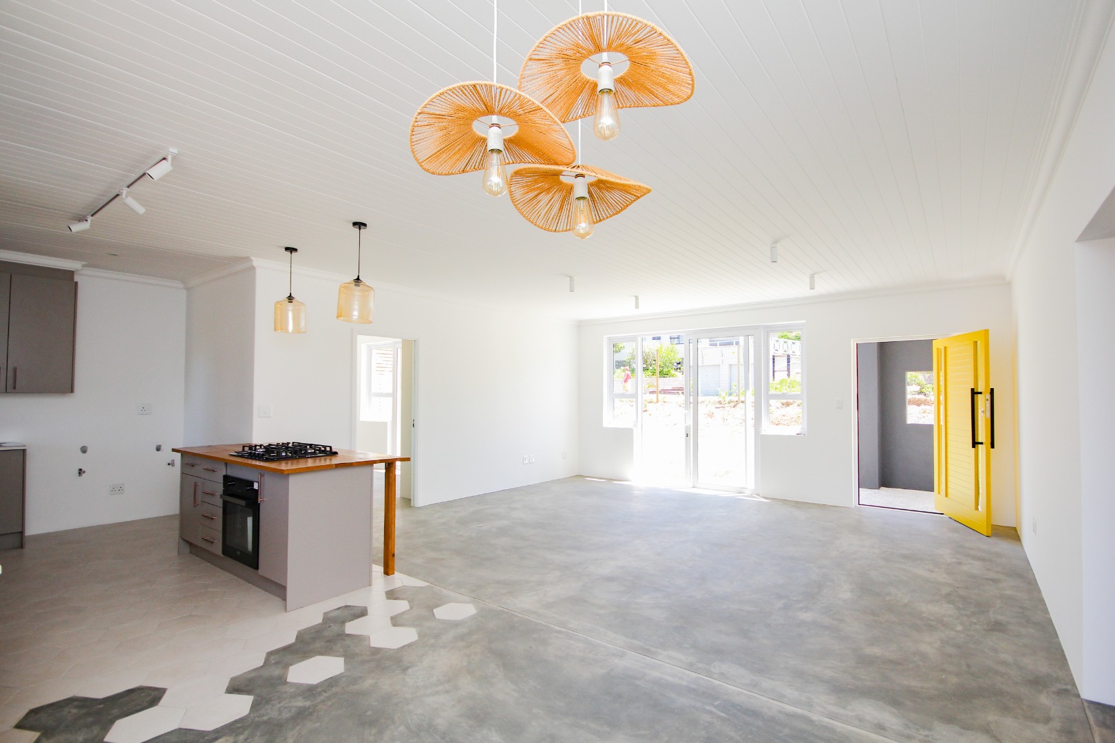 Step inside to an open-plan living area, bathed in natural light, where polished concrete flooring flows seamlessly throughout. The heart of the home is a sleek, modern kitchen equipped with stylish grey cabinetry, a central island featuring an integrated gas hob and oven, and unique amber pendant lighting. This space is designed for both everyday living and entertaining, offering a seamless connection to the outdoor areas.