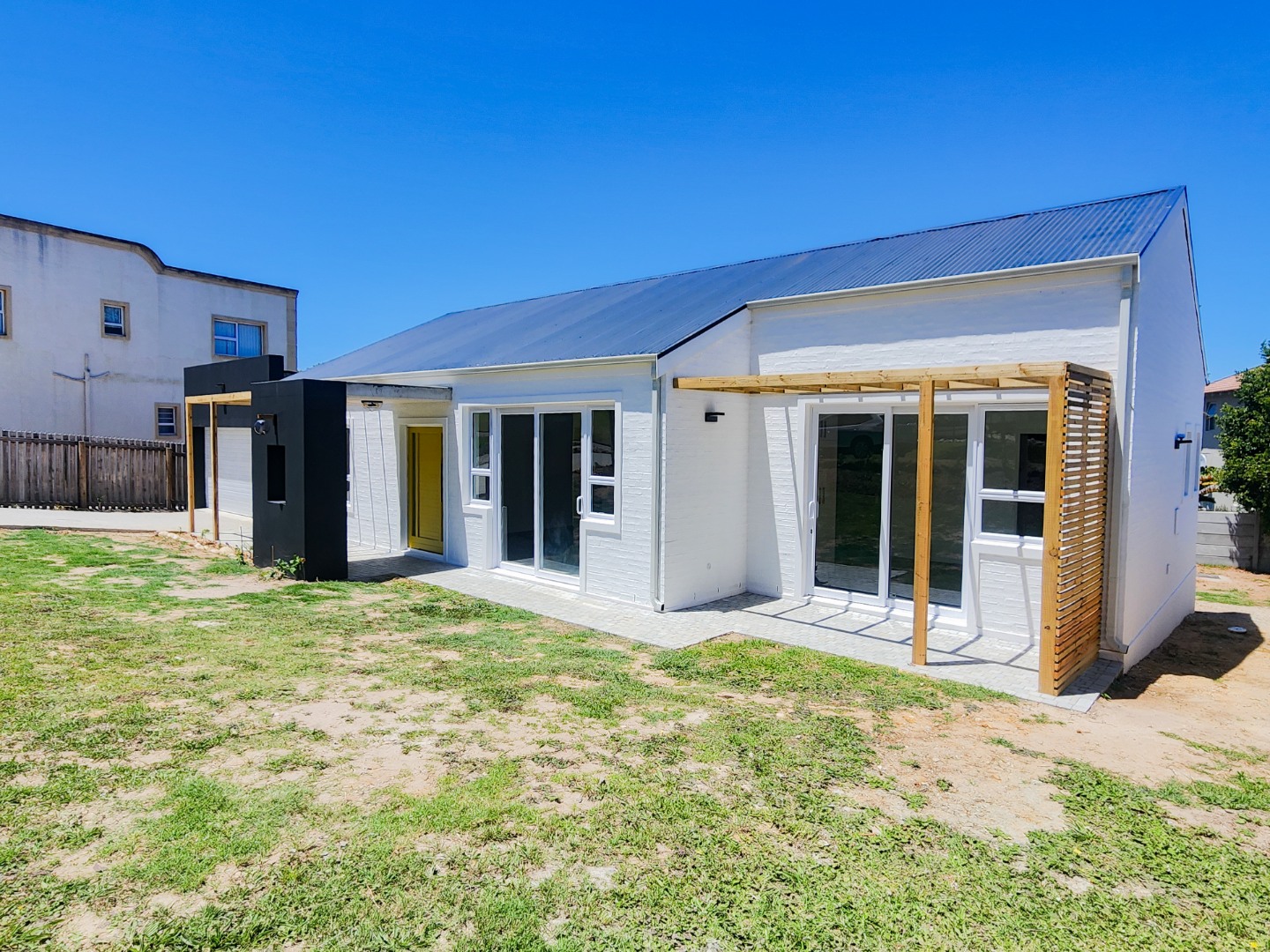 Discover modern coastal living in this newly built 3-bedroom, 2-bathroom residence located in the desirable Hunters Estate, Knysna. This home immediately impresses with its contemporary architectural design, featuring a crisp white brick facade complemented by striking black accents and golden hardware. Large sliding glass doors and elegant wooden pergola structures enhance its kerb appeal, hinting at the stylish interiors within.