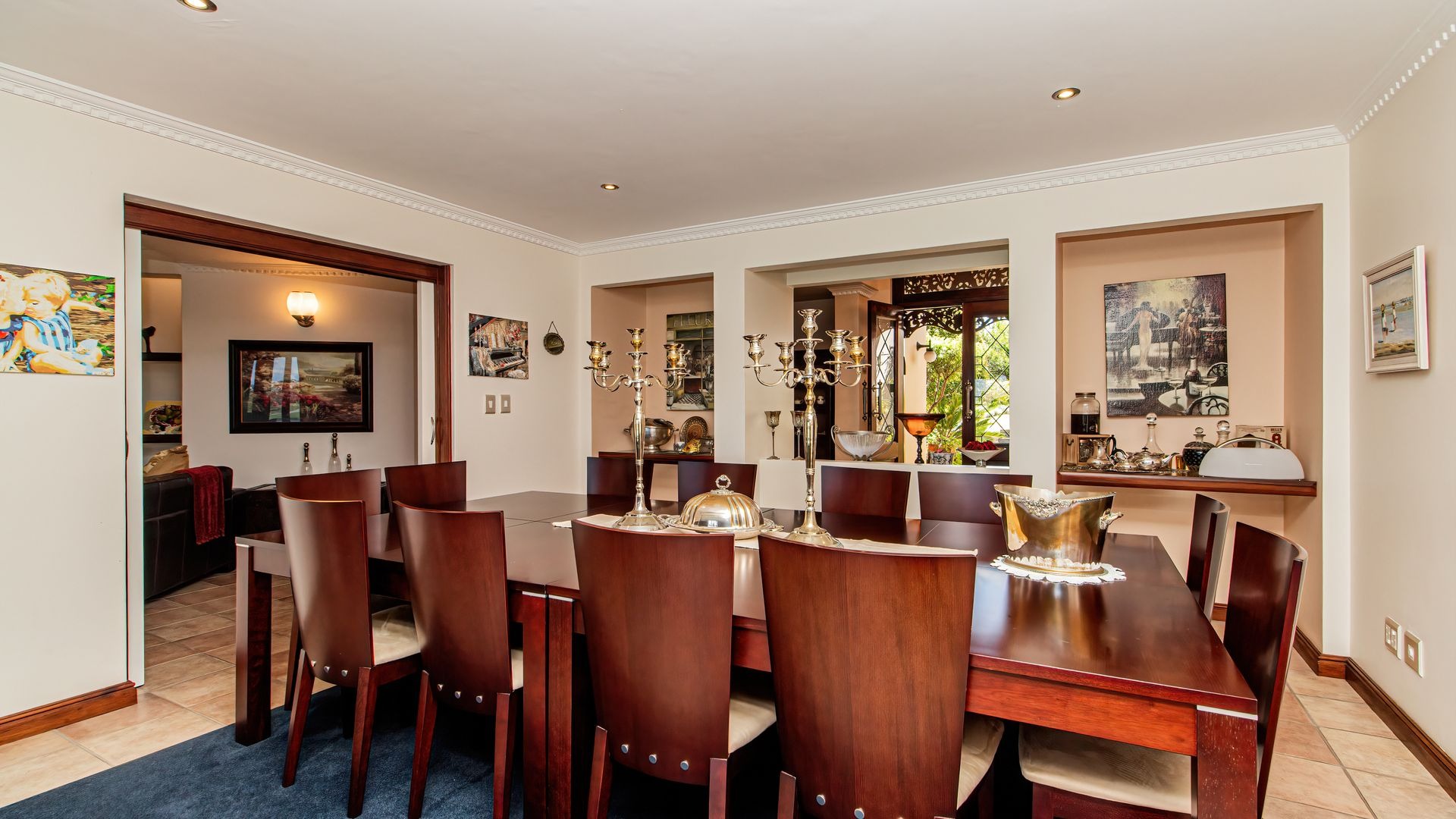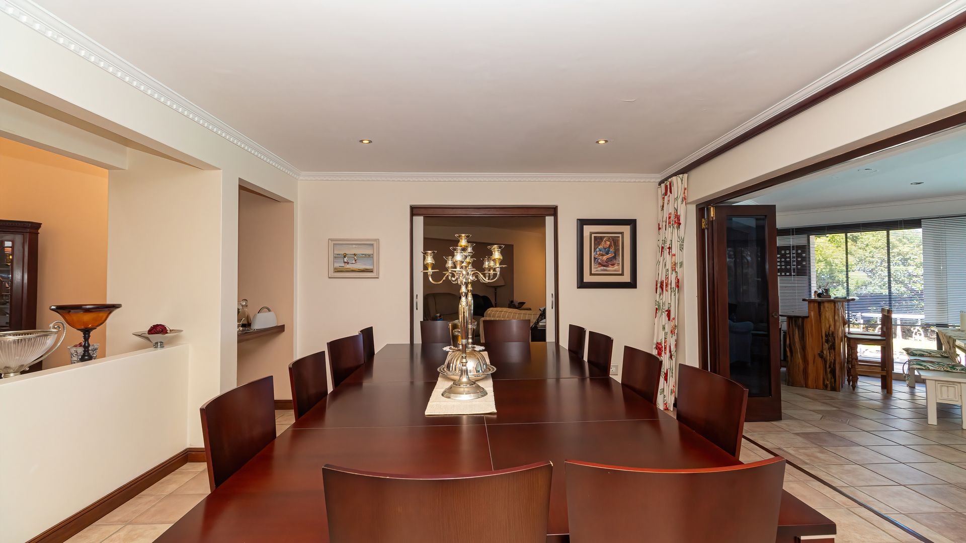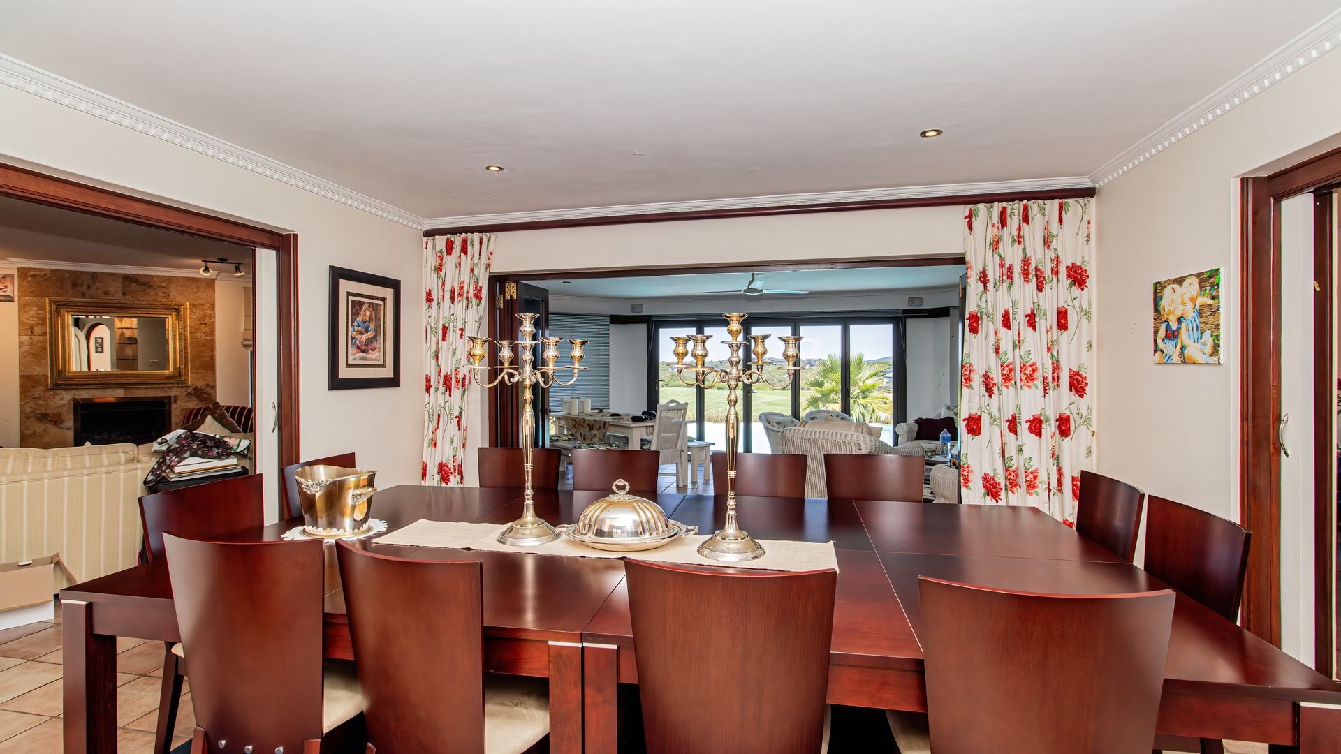 Spanning 412 square meters, the interior comprises four well-appointed bedrooms and three bathrooms, ensuring ample accommodation. The functional layout includes a formal dining room, two spacious lounges, a dedicated family TV room, and a well-equipped kitchen with a pantry. A notable fireplace and an inviting entrance hall enhance the home's refined ambiance.