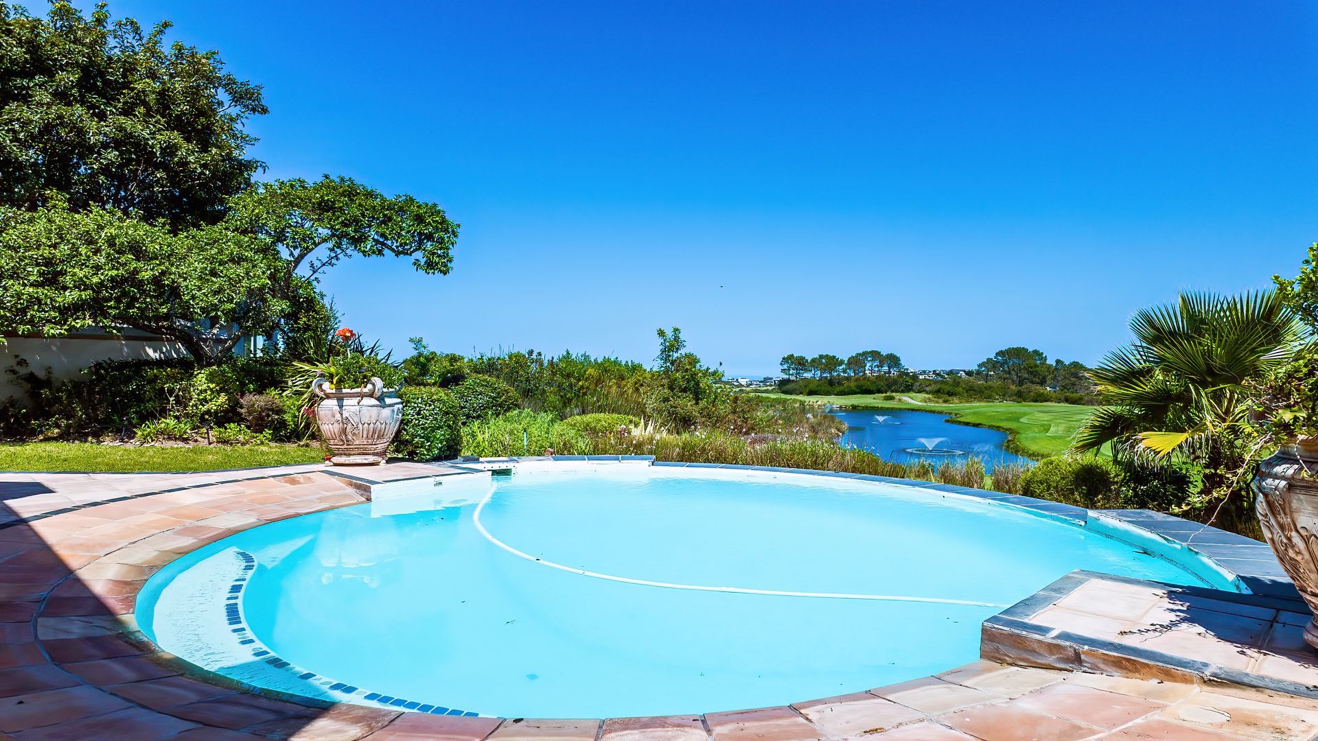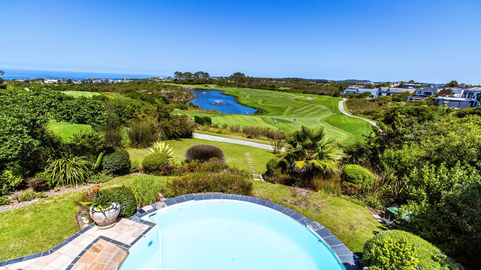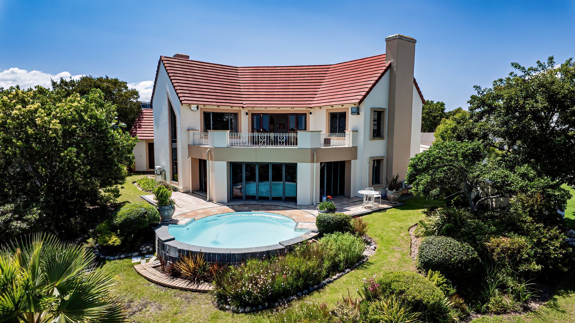 Outdoor living is exceptionally catered for with a private, kidney-shaped swimming pool set within an expansive, meticulously landscaped garden on a 962 sqm erf. Multiple balconies and a spacious patio provide ideal settings for al fresco dining and enjoying the breathtaking vistas. Residents benefit from the comprehensive security of this gated community with 24-hour security and access control, complemented by fibre connectivity. This esteemed location offers a unique blend of golf, coastal, and nature reserve lifestyles.
