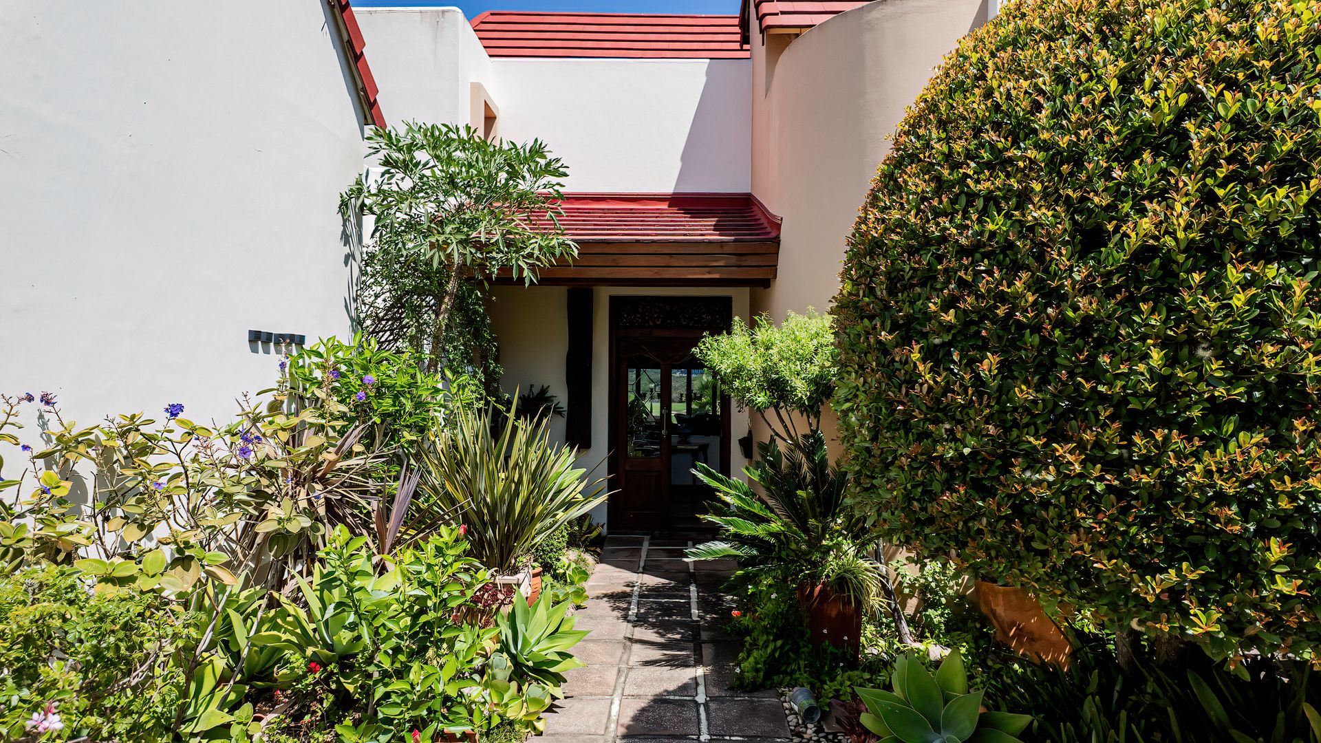 This distinguished multi-level residence, situated within the prestigious Pezula Golf Estate in Knysna, South Africa, offers an unparalleled lifestyle. Boasting a distinctive architectural design with a curved red-tiled roof and light exterior, the property commands panoramic views of the meticulously maintained golf course and the expansive Indian Ocean, embodying sophisticated coastal living.