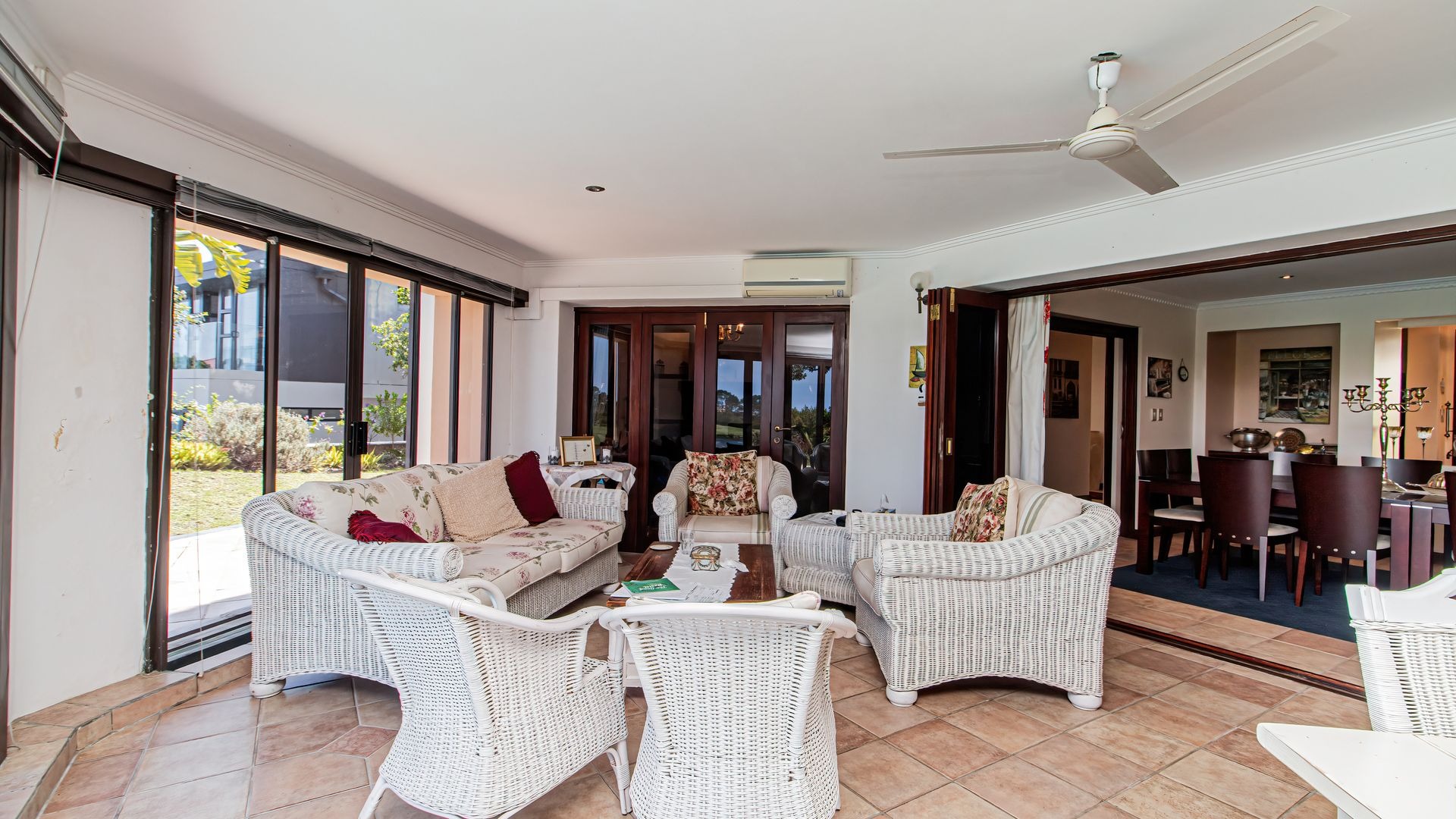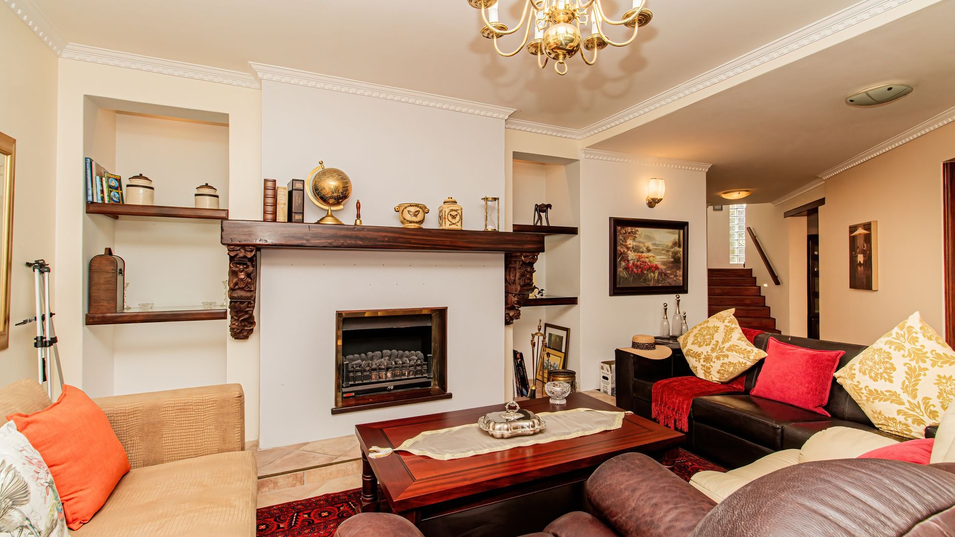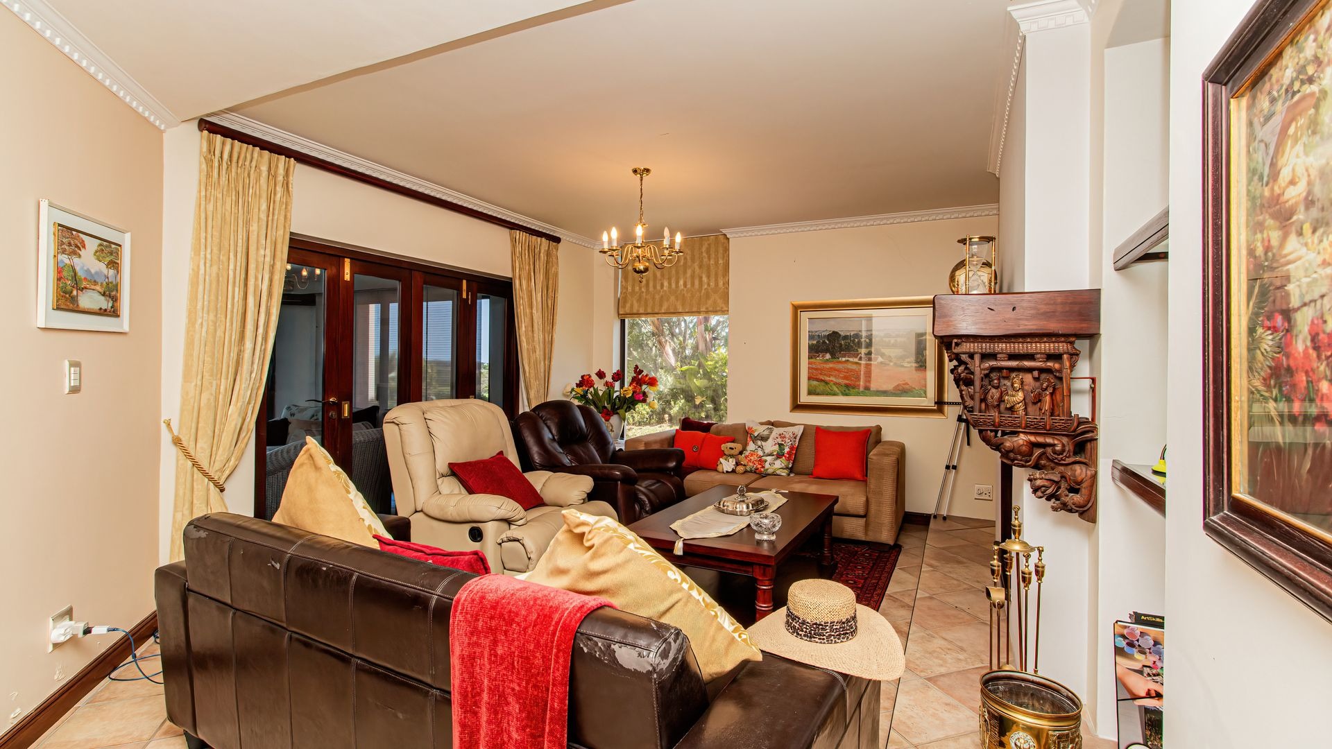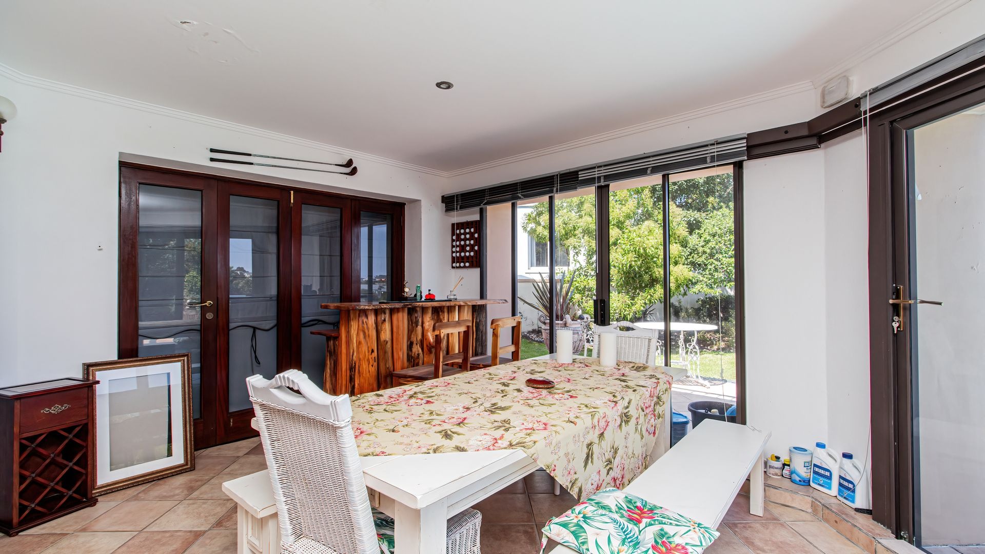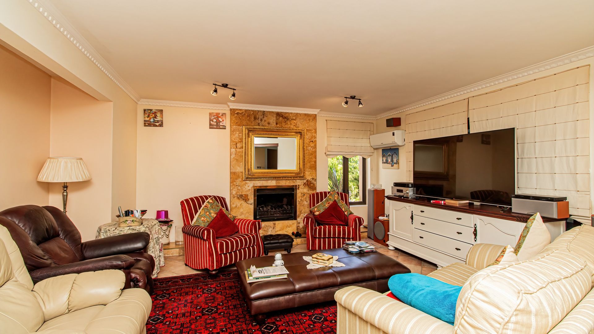 Spanning 412 square meters, the interior comprises four well-appointed bedrooms and three bathrooms, ensuring ample accommodation. The functional layout includes a formal dining room, two spacious lounges, a dedicated family TV room, and a well-equipped kitchen with a pantry. A notable fireplace and an inviting entrance hall enhance the home's refined ambiance.