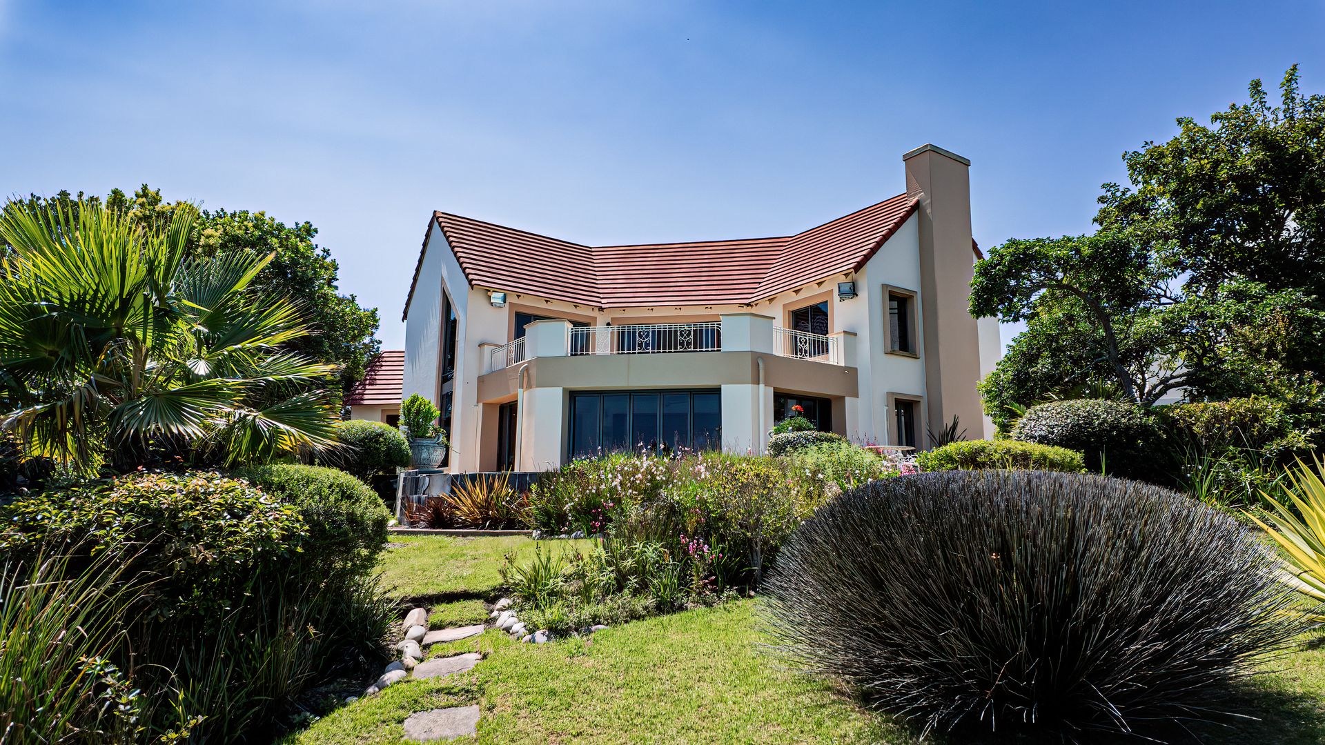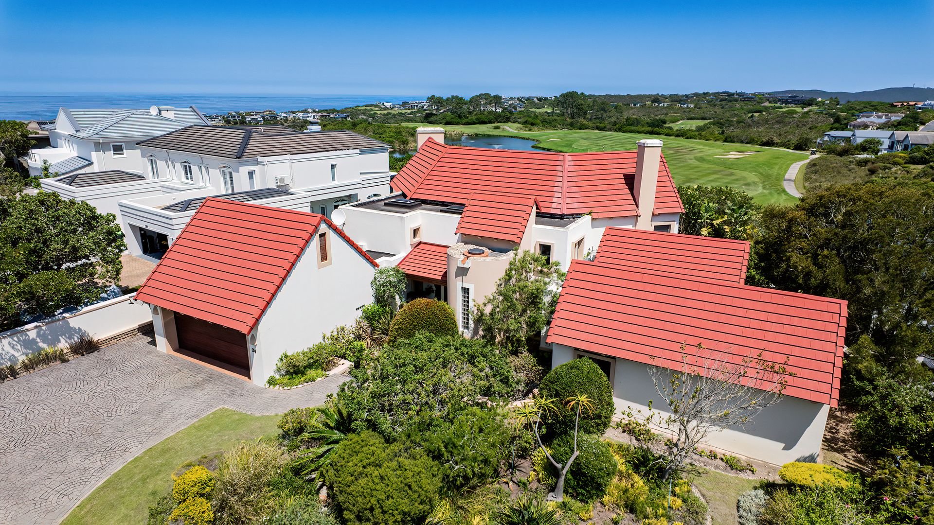 This distinguished multi-level residence, situated within the prestigious Pezula Golf Estate in Knysna, South Africa, offers an unparalleled lifestyle. Boasting a distinctive architectural design with a curved red-tiled roof and light exterior, the property commands panoramic views of the meticulously maintained golf course and the expansive Indian Ocean, embodying sophisticated coastal living.