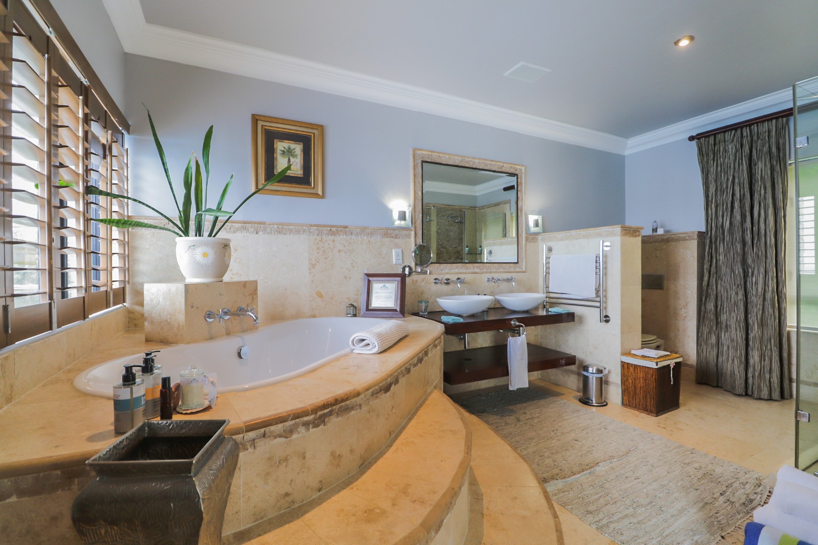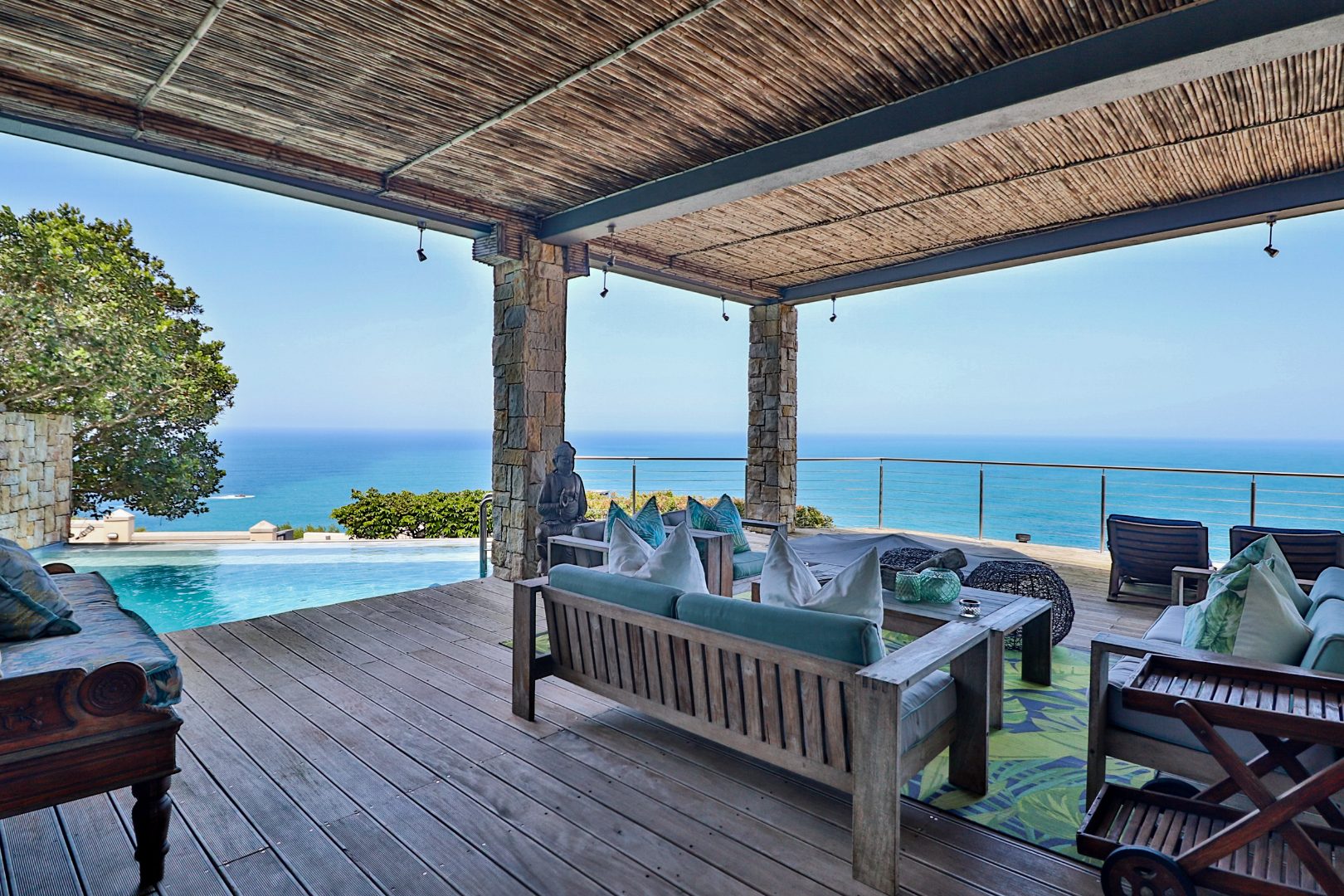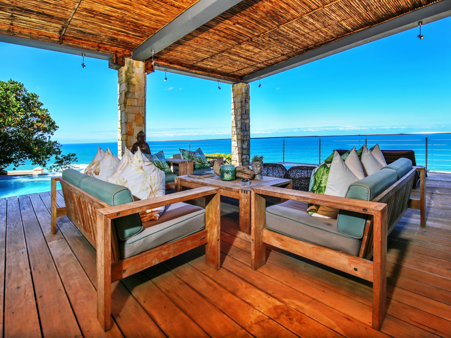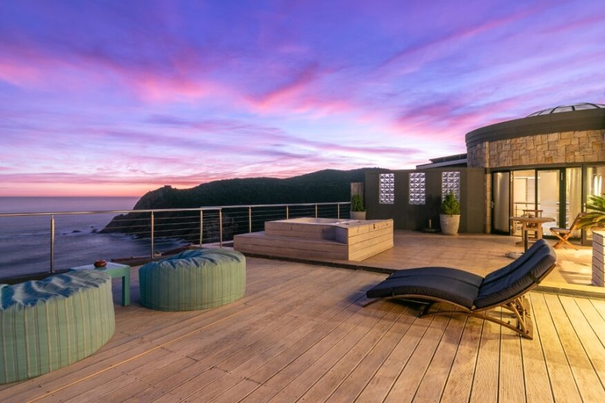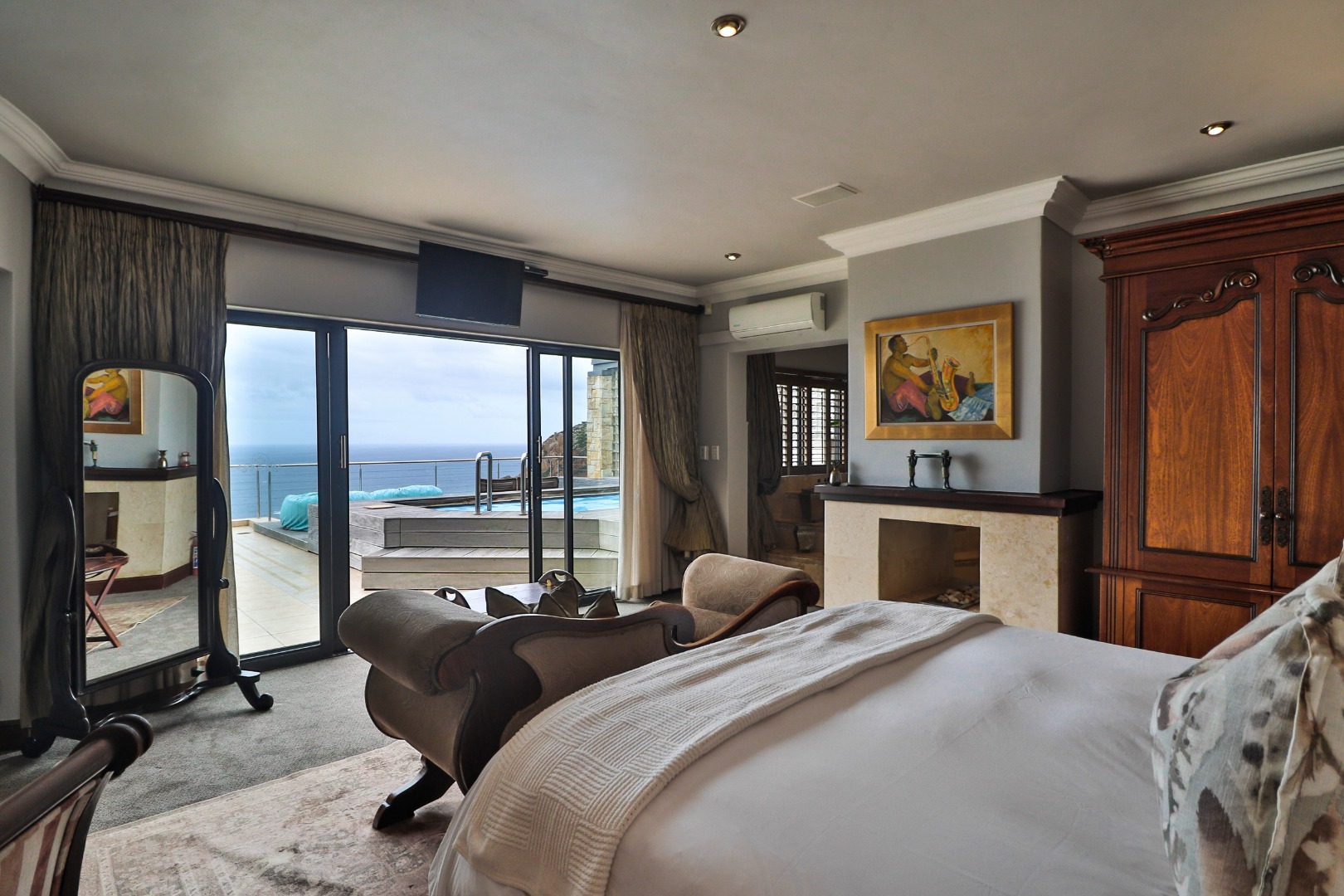 Bedroom 1 : Lounge, bedroom with full open plan bathroom {double basin, double shower & raised corner bath} separate toilet, dressing room, gas fireplace, expansive deck with jacuzzi & full ocean views. Here you will also find another heated pool and a jacuzzi on the sunny patio, and even more breathtaking views of the Indian Ocean.