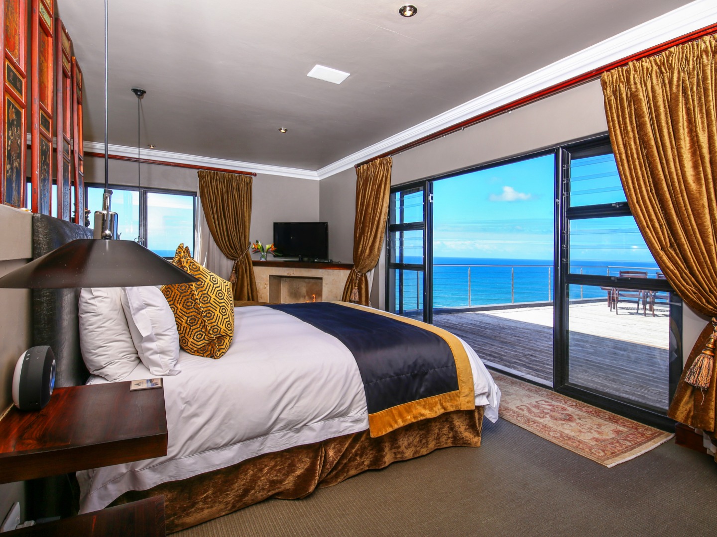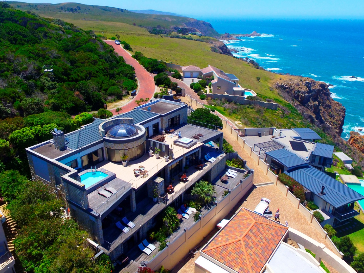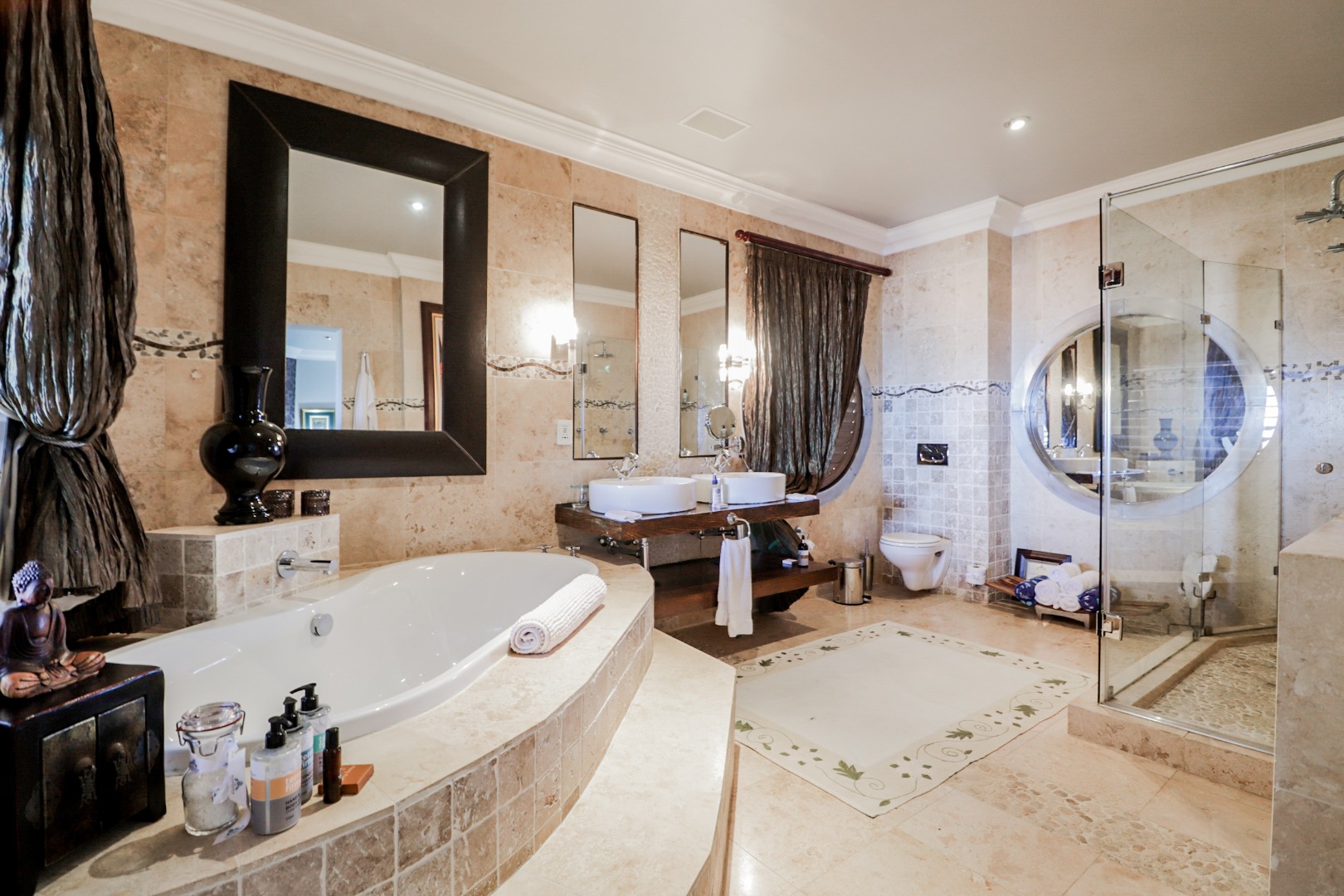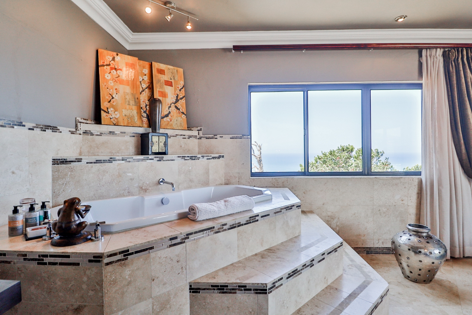 Bedroom 1 : Lounge, bedroom with full open plan bathroom {double basin, double shower & raised corner bath} separate toilet, dressing room, gas fireplace, expansive deck with jacuzzi & full ocean views. Here you will also find another heated pool and a jacuzzi on the sunny patio, and even more breathtaking views of the Indian Ocean.