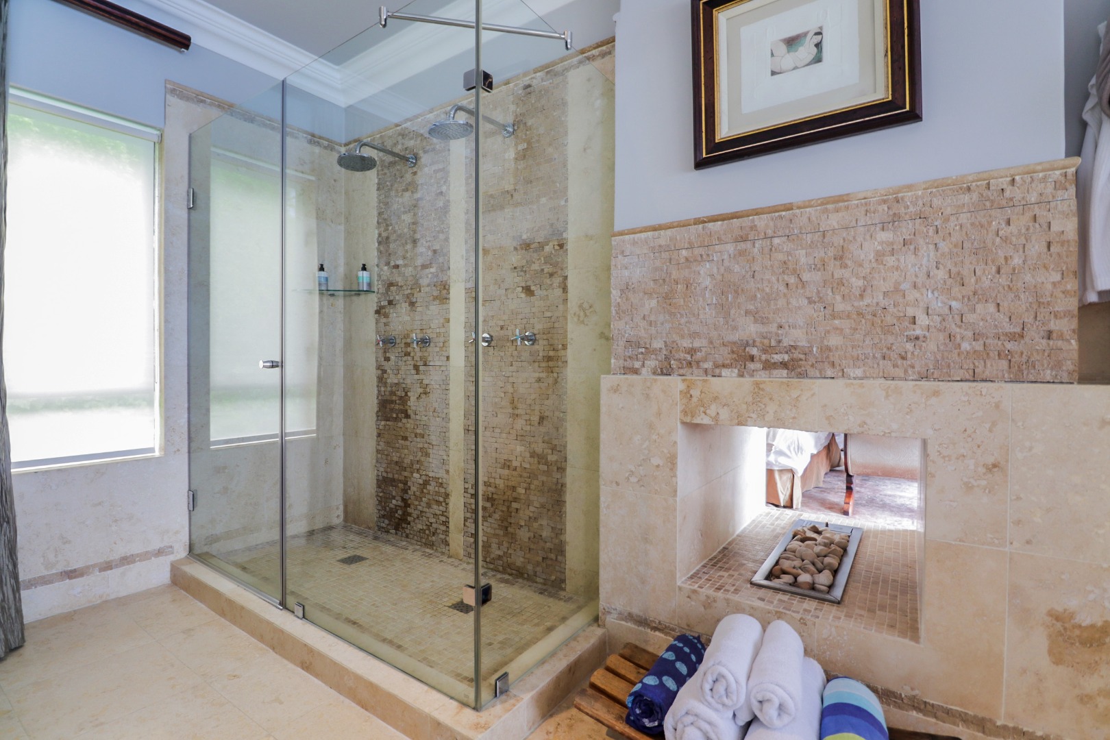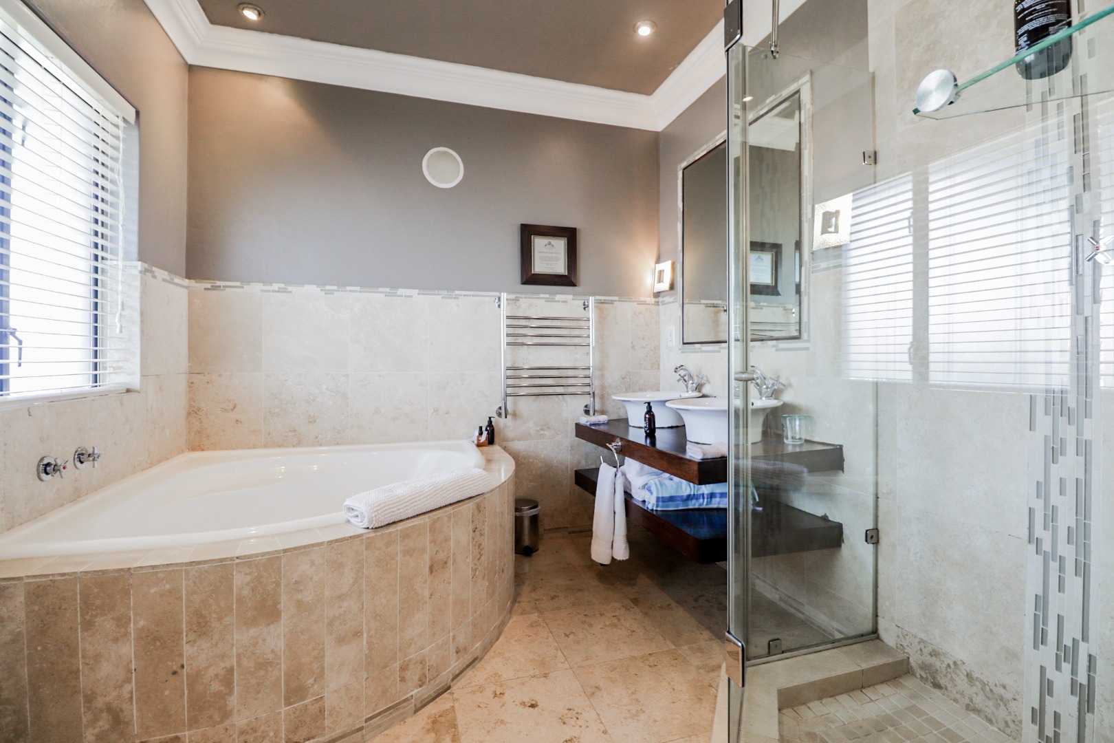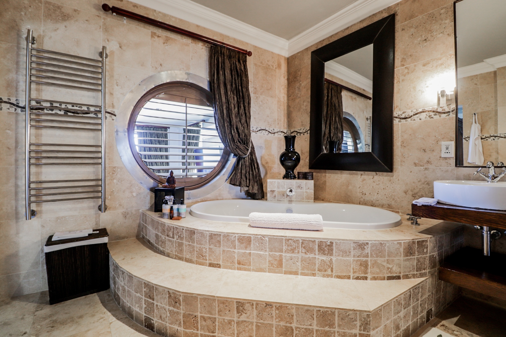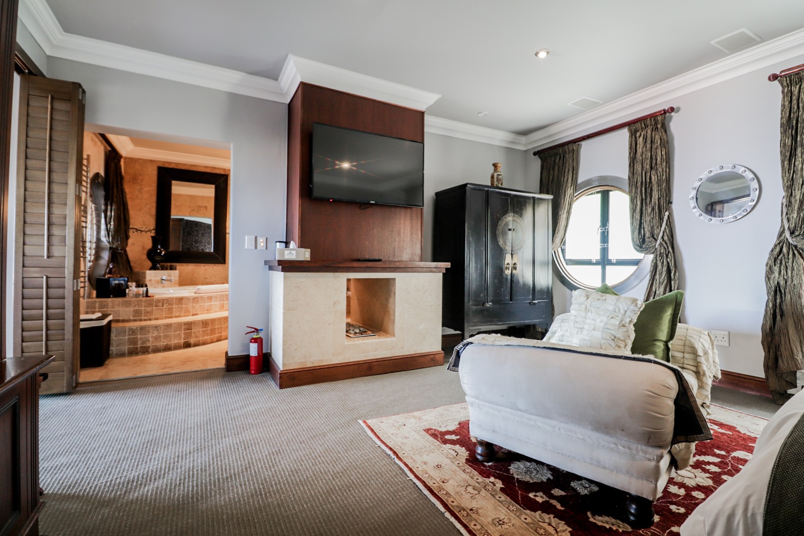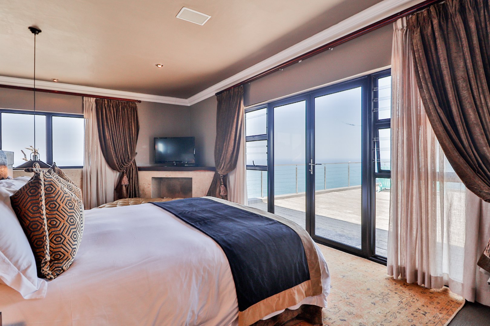 Bedroom 1 : Lounge, bedroom with full open plan bathroom {double basin, double shower & raised corner bath} separate toilet, dressing room, gas fireplace, expansive deck with jacuzzi & full ocean views. Here you will also find another heated pool and a jacuzzi on the sunny patio, and even more breathtaking views of the Indian Ocean.