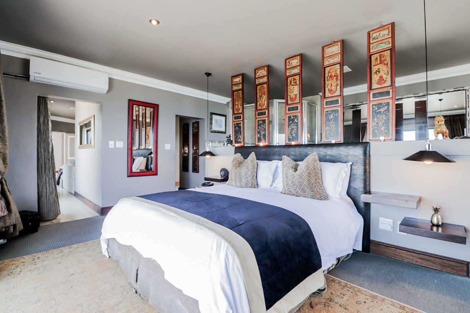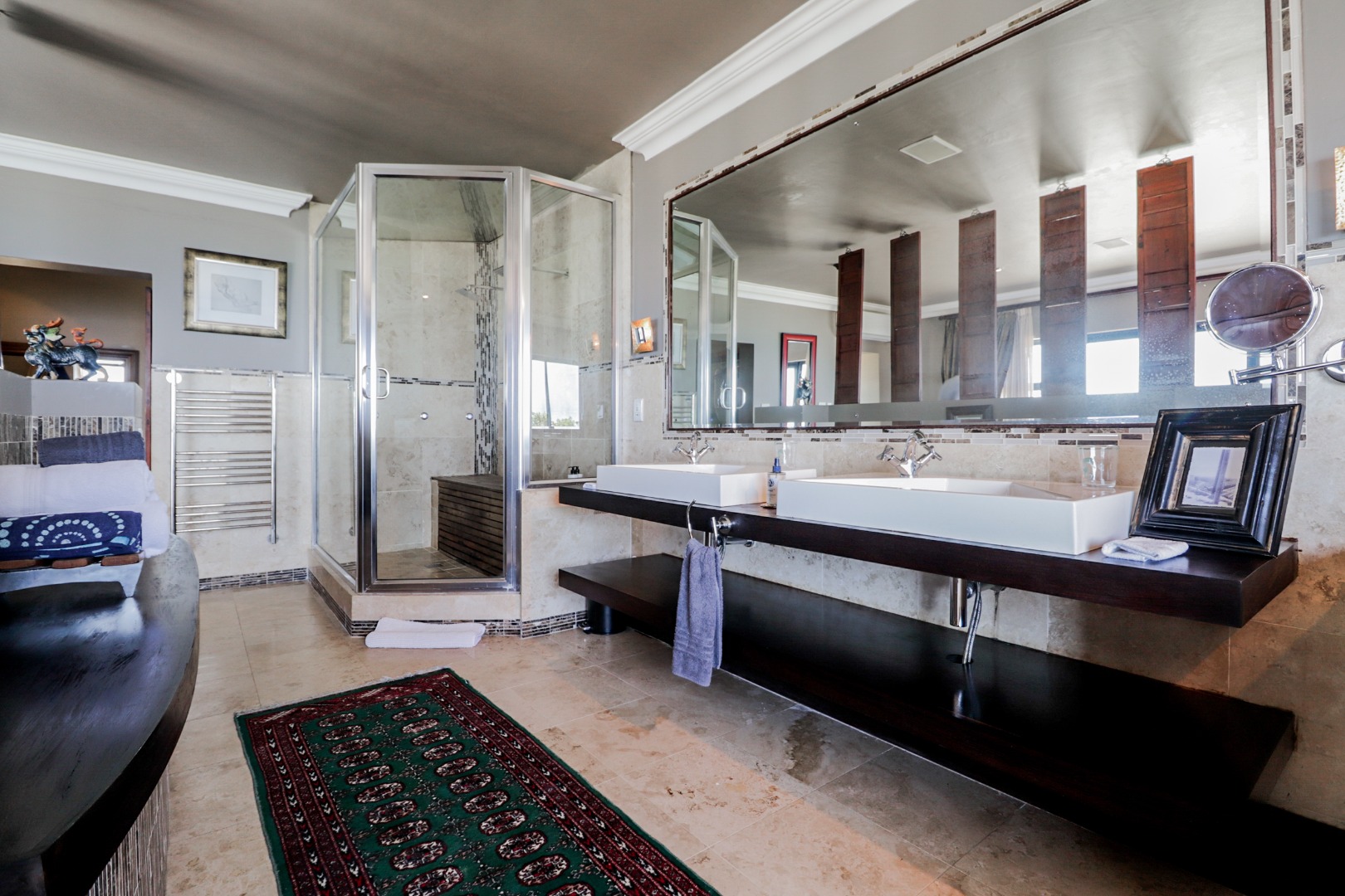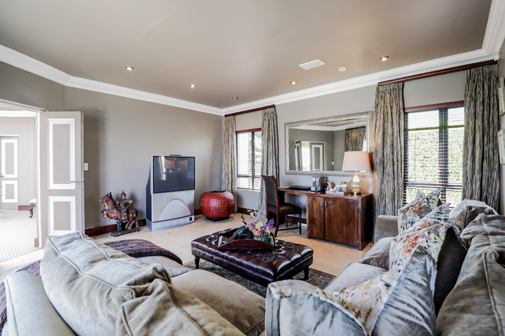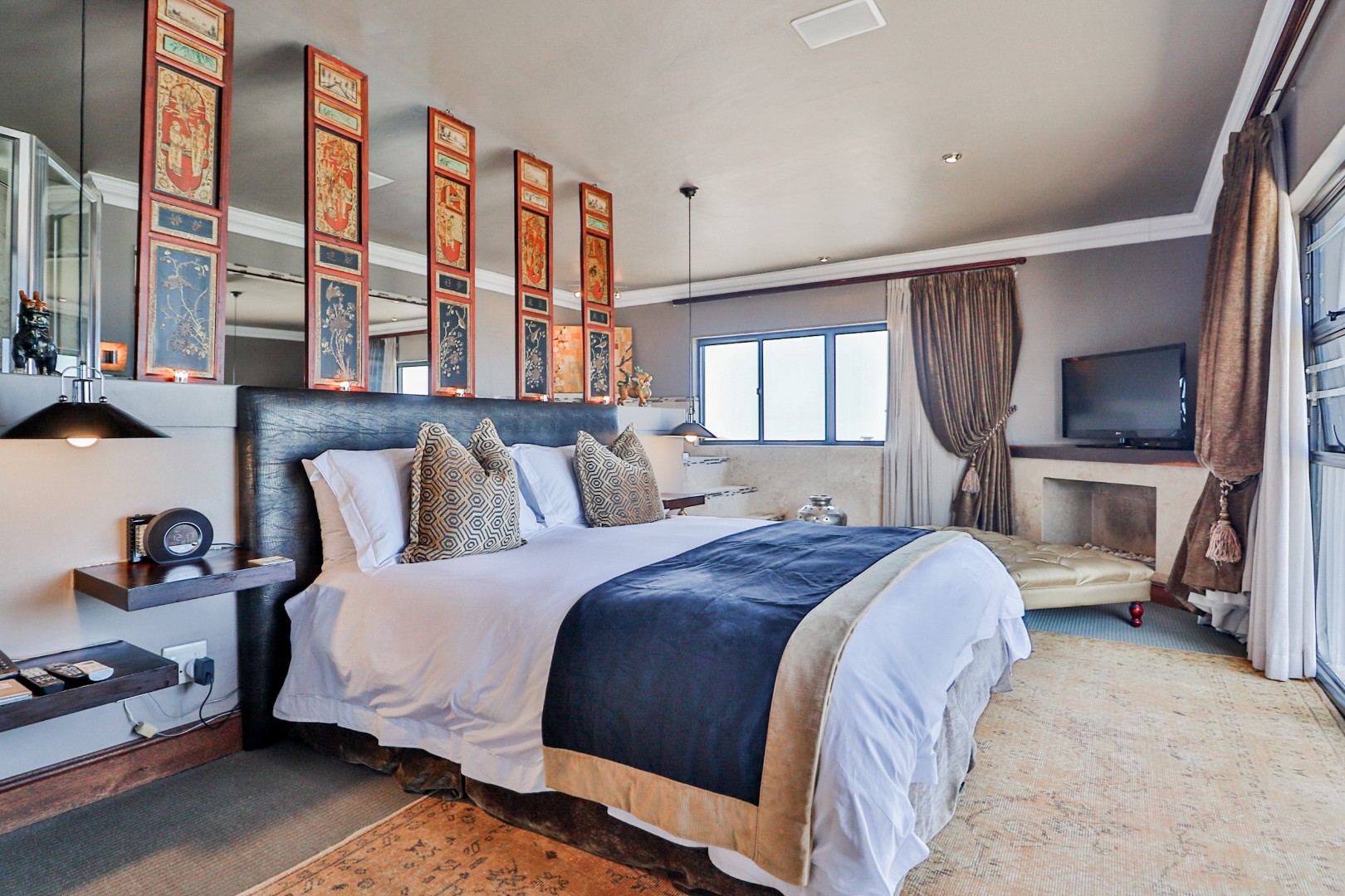 Bedroom 1 : Lounge, bedroom with full open plan bathroom {double basin, double shower & raised corner bath} separate toilet, dressing room, gas fireplace, expansive deck with jacuzzi & full ocean views. Here you will also find another heated pool and a jacuzzi on the sunny patio, and even more breathtaking views of the Indian Ocean.