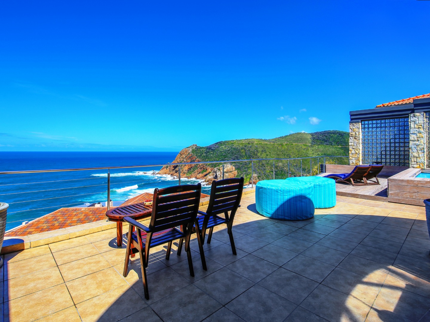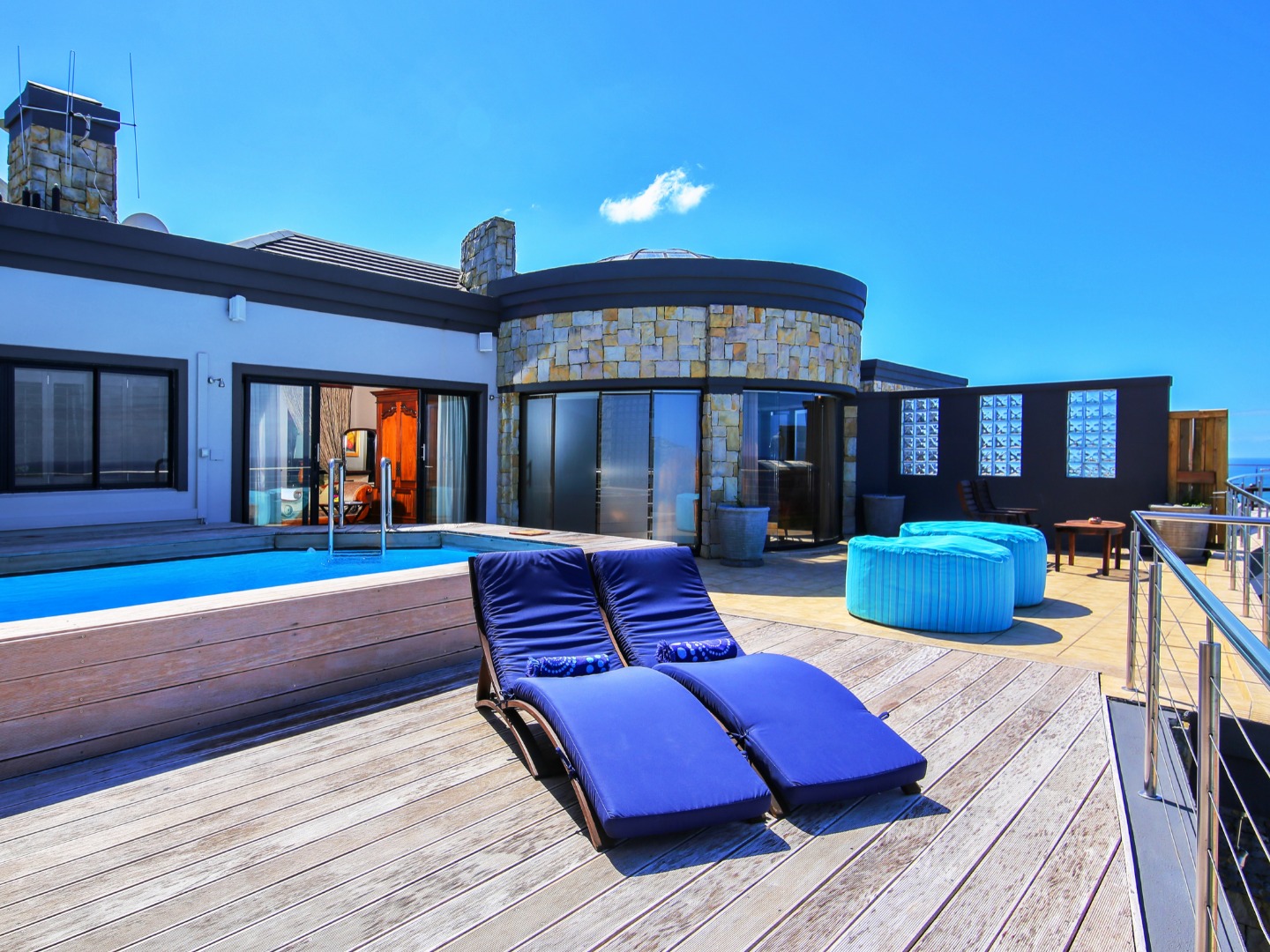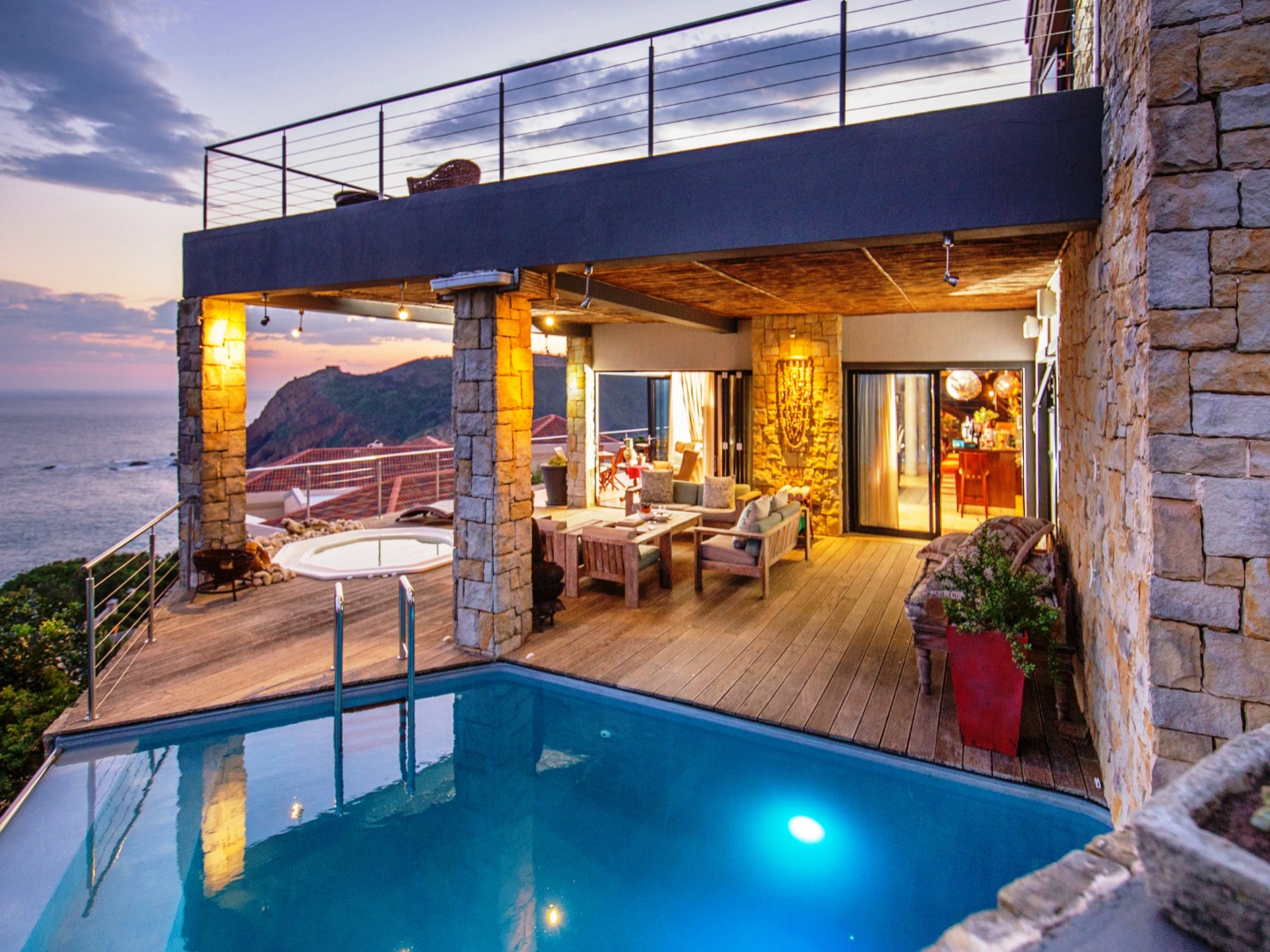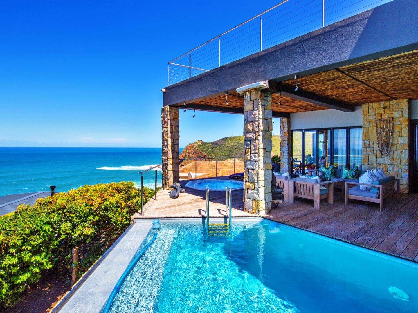 The top level flows outwards towards a covered patio with rim-flow pool, jacuzzi and sunny wooden deck. Ideal for sundowners after a day of sight-seeing. There are a fully equipped kitchen, laundry and storeroom.