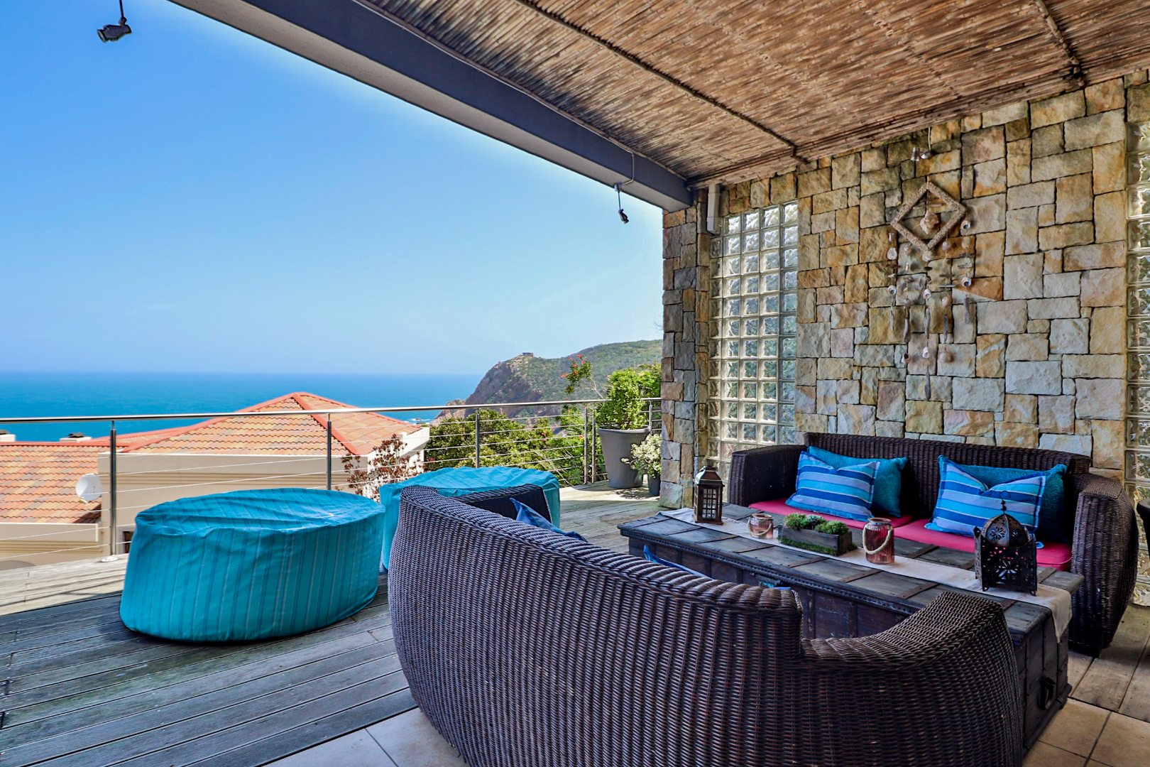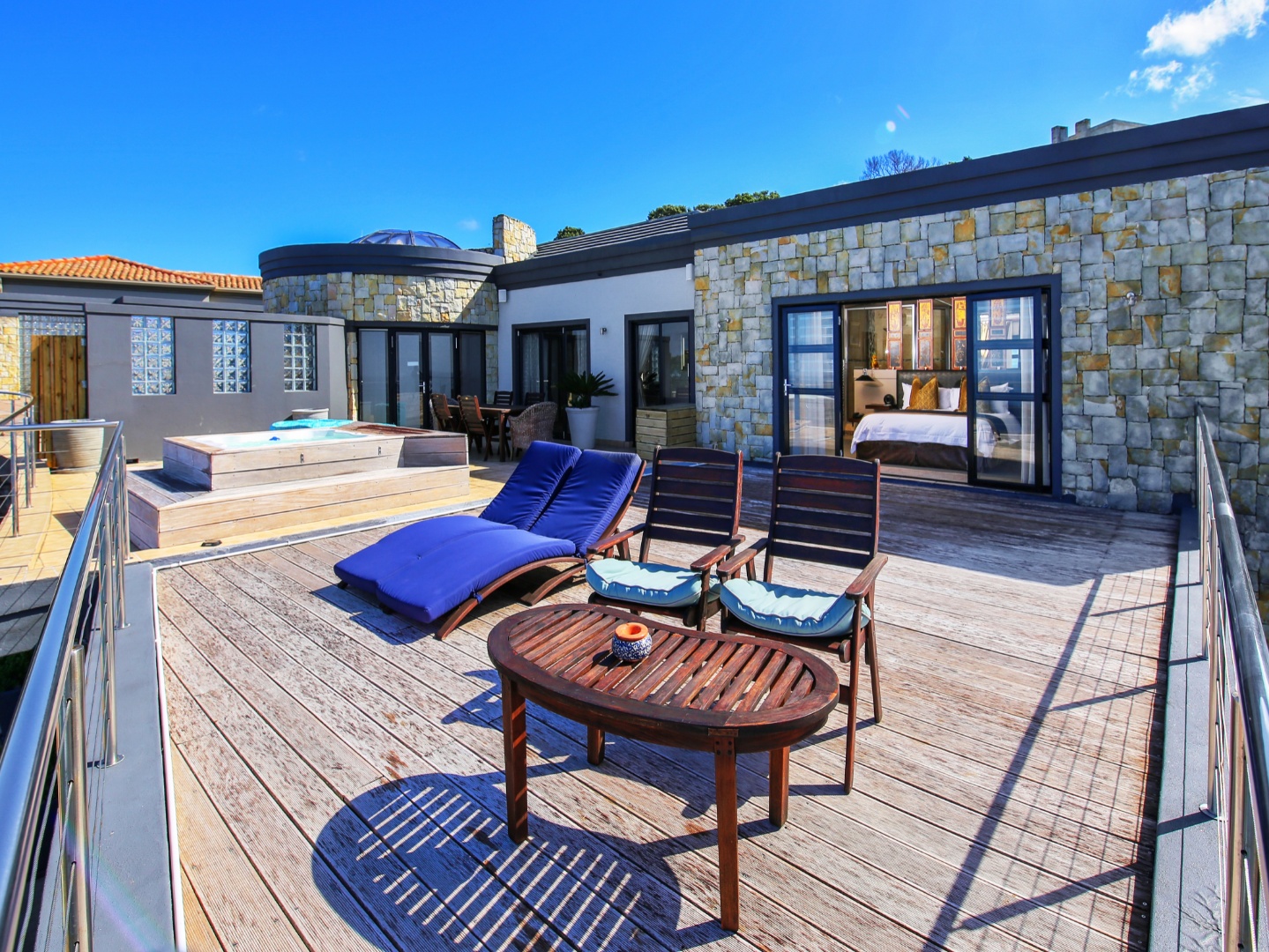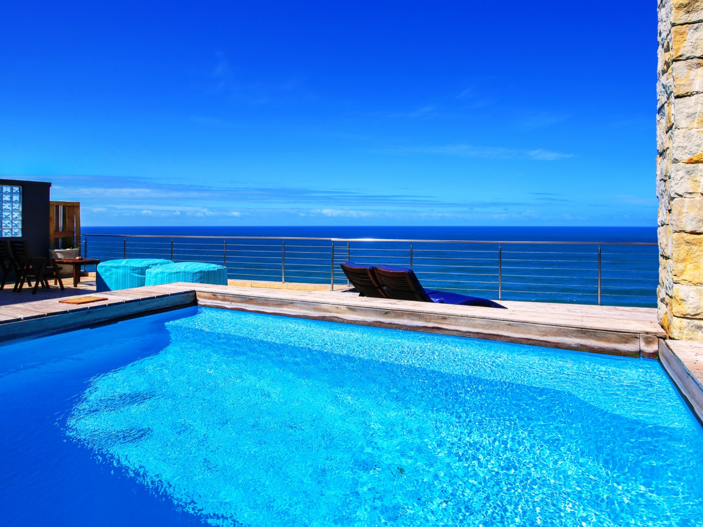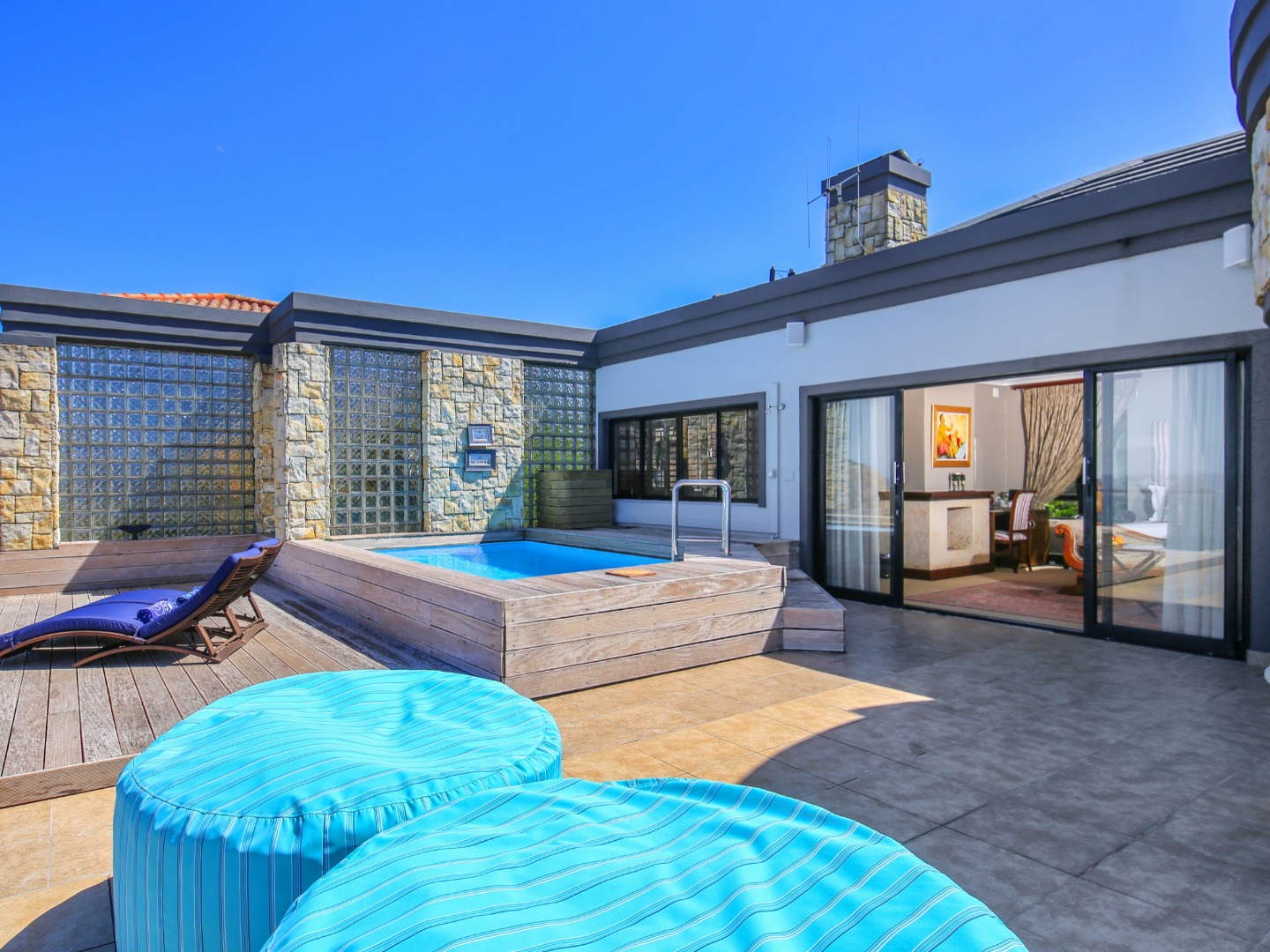 The top level flows outwards towards a covered patio with rim-flow pool, jacuzzi and sunny wooden deck. Ideal for sundowners after a day of sight-seeing. There are a fully equipped kitchen, laundry and storeroom.