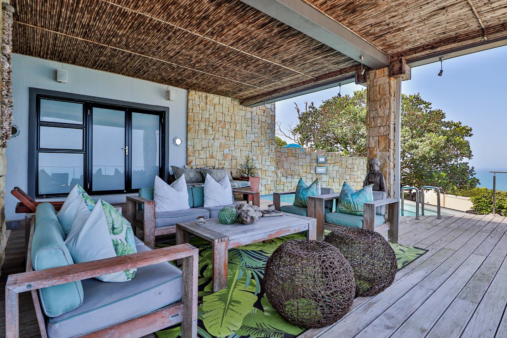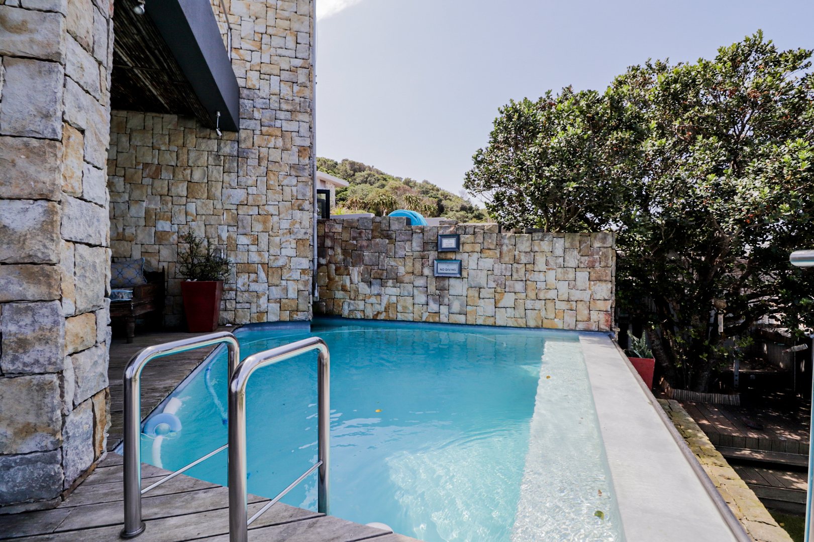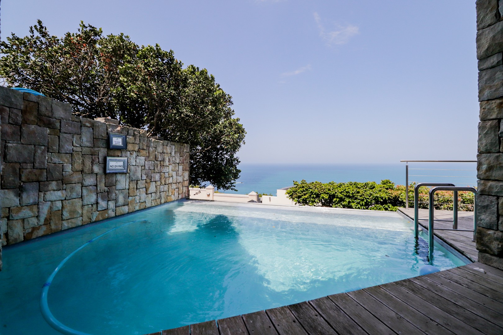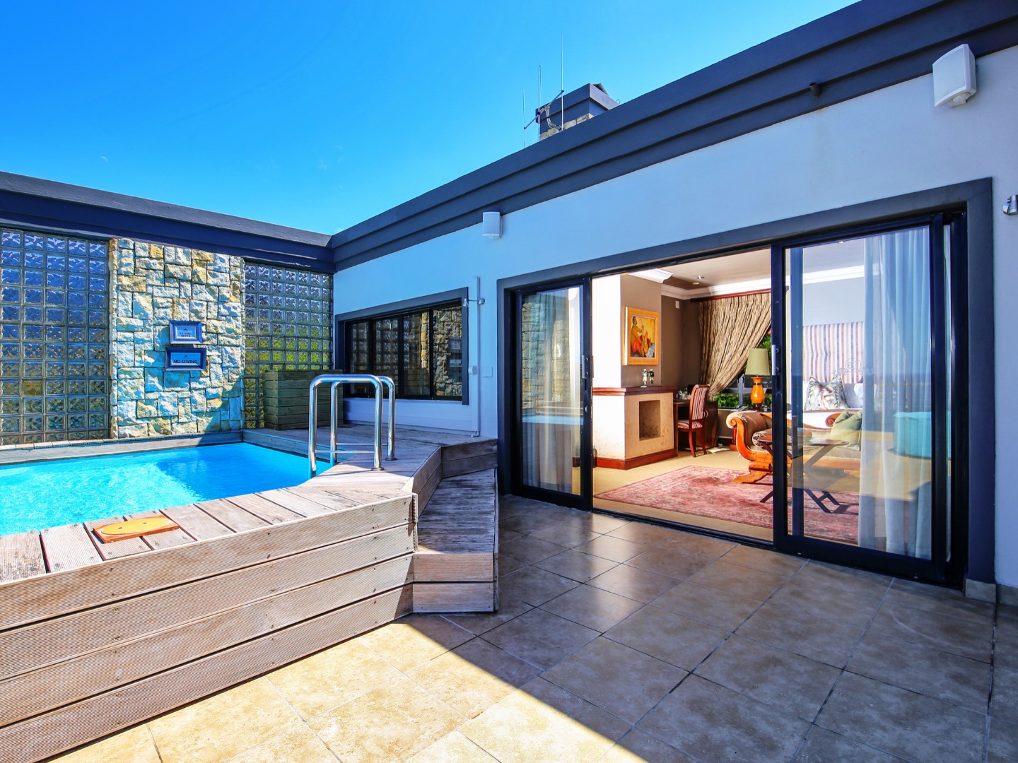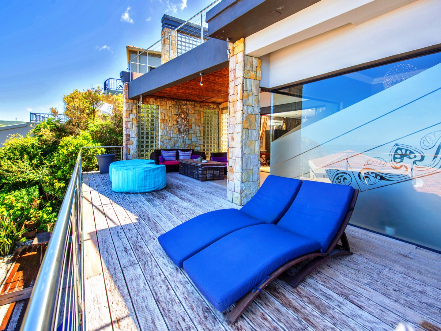 The top level flows outwards towards a covered patio with rim-flow pool, jacuzzi and sunny wooden deck. Ideal for sundowners after a day of sight-seeing. There are a fully equipped kitchen, laundry and storeroom.