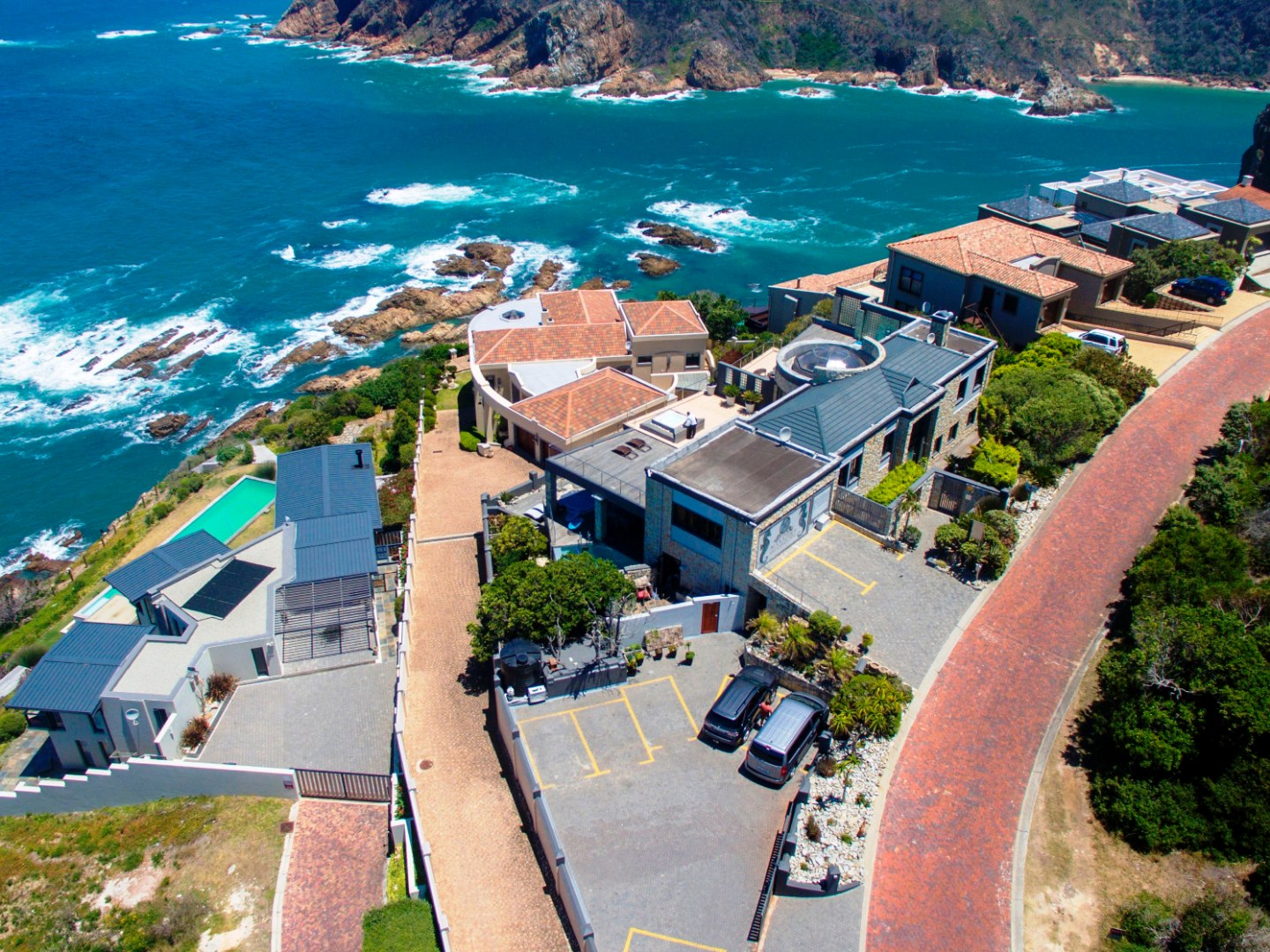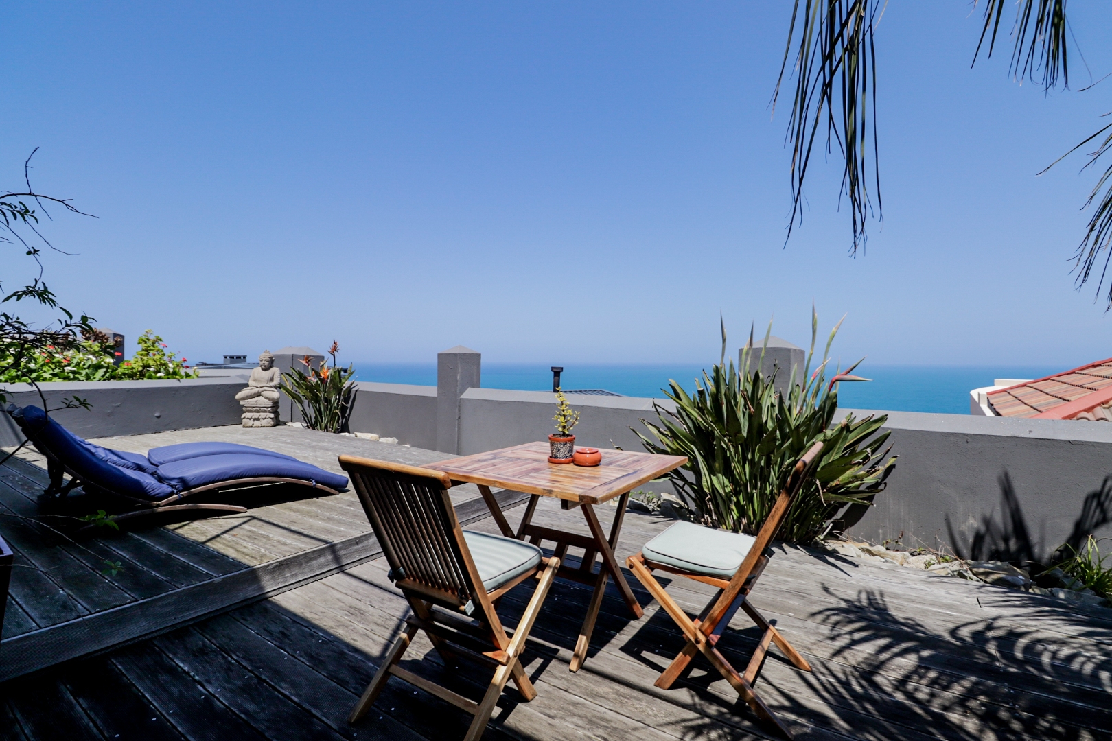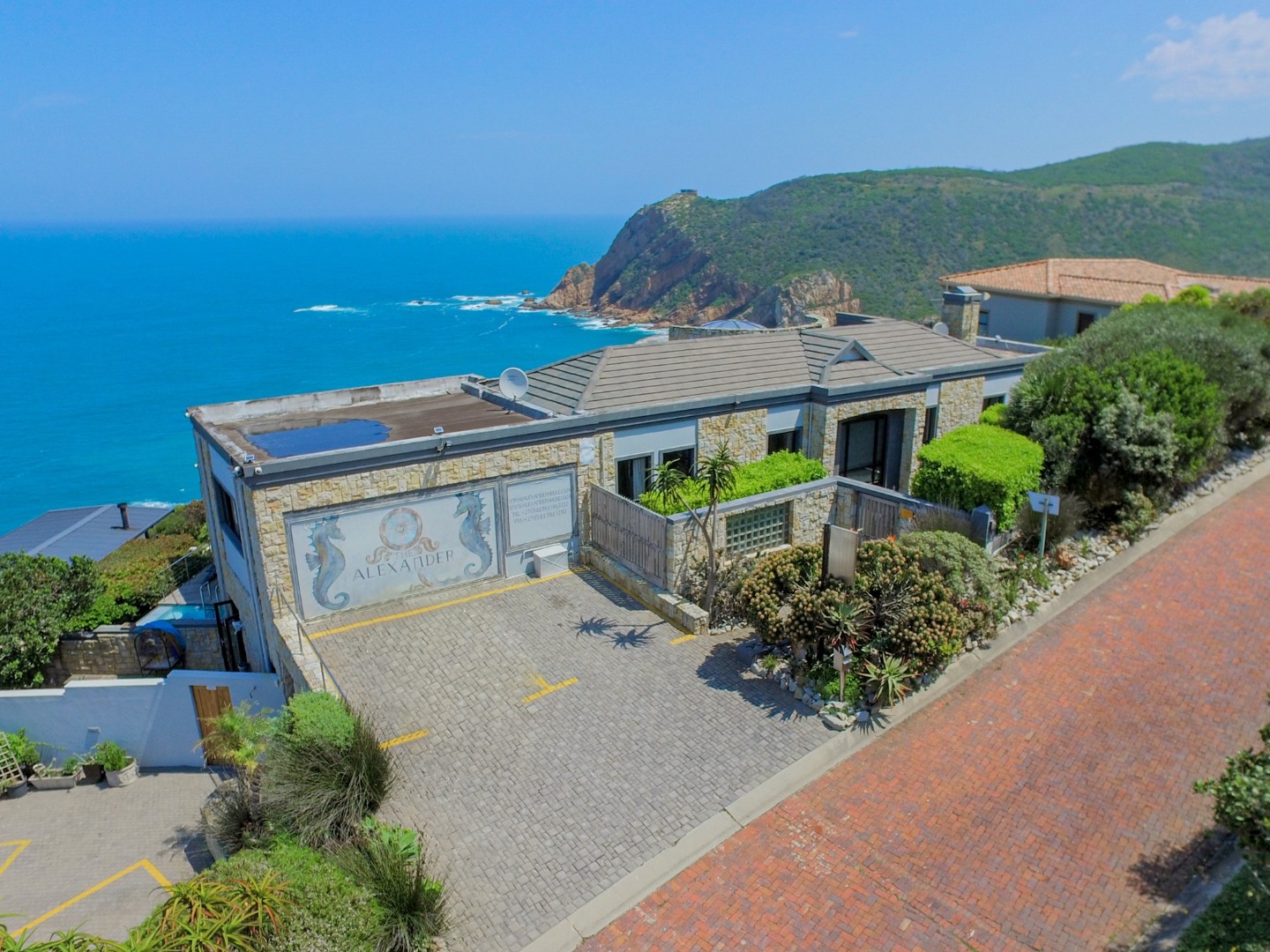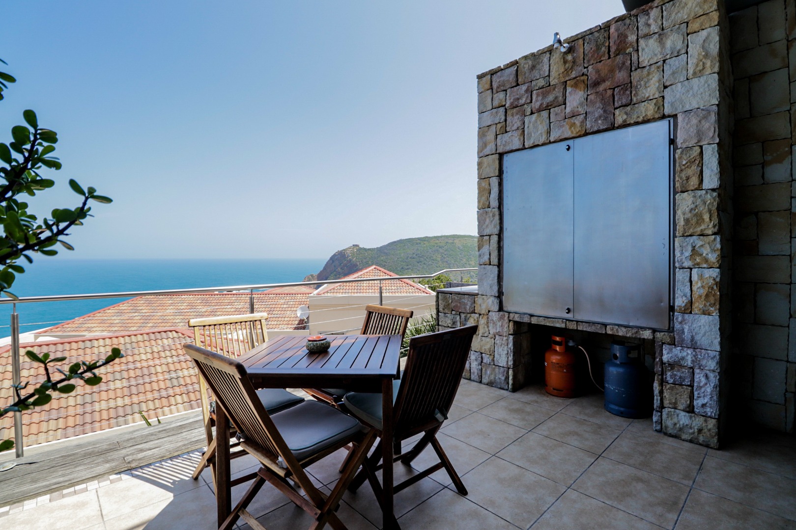 The top level flows outwards towards a covered patio with rim-flow pool, jacuzzi and sunny wooden deck. Ideal for sundowners after a day of sight-seeing. There are a fully equipped kitchen, laundry and storeroom.